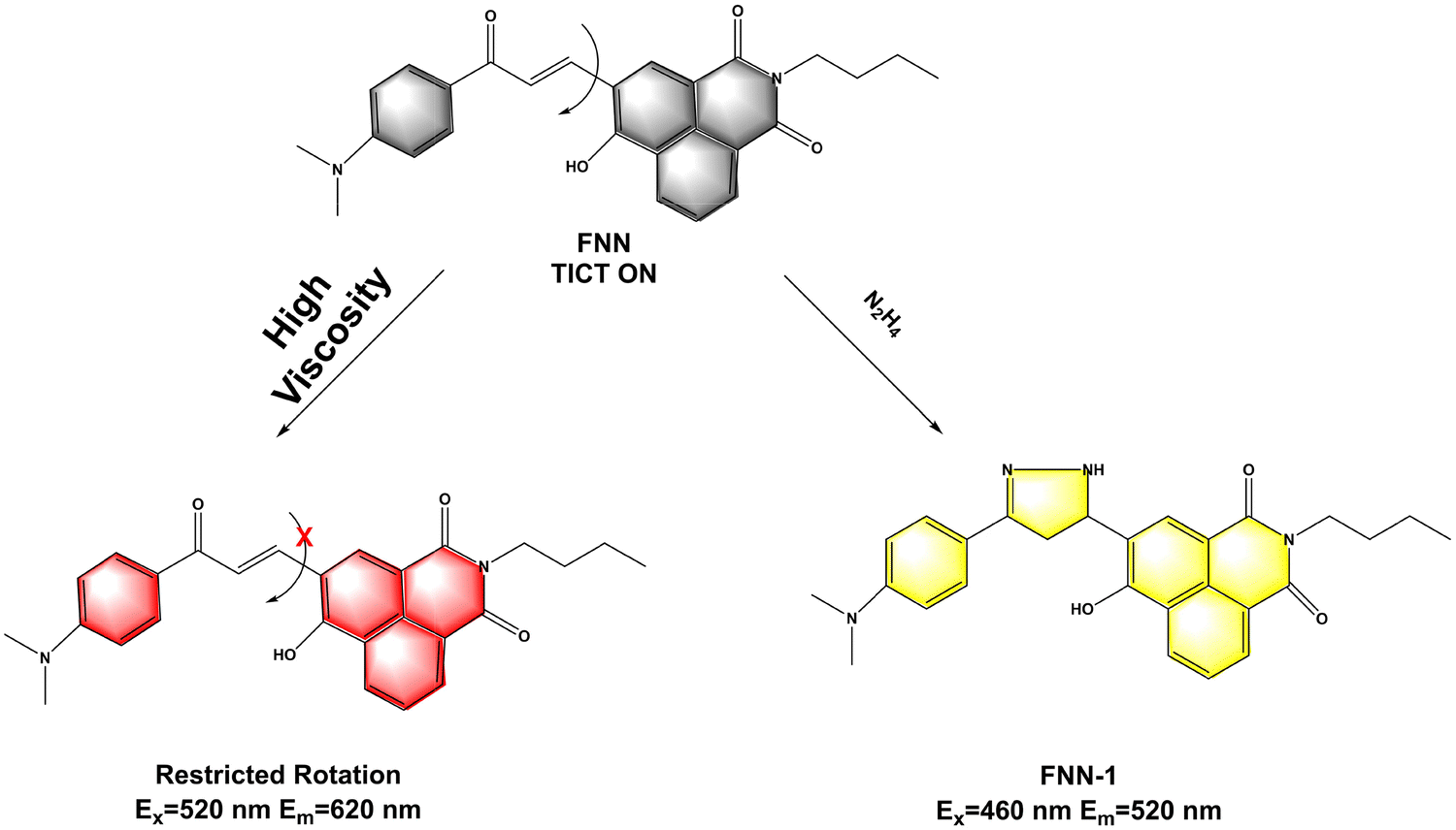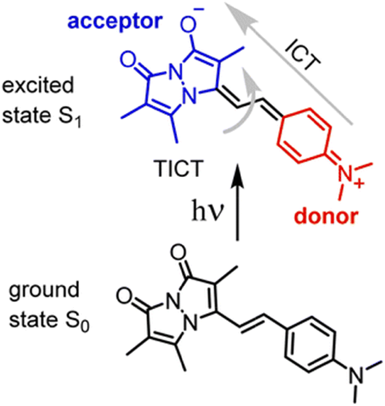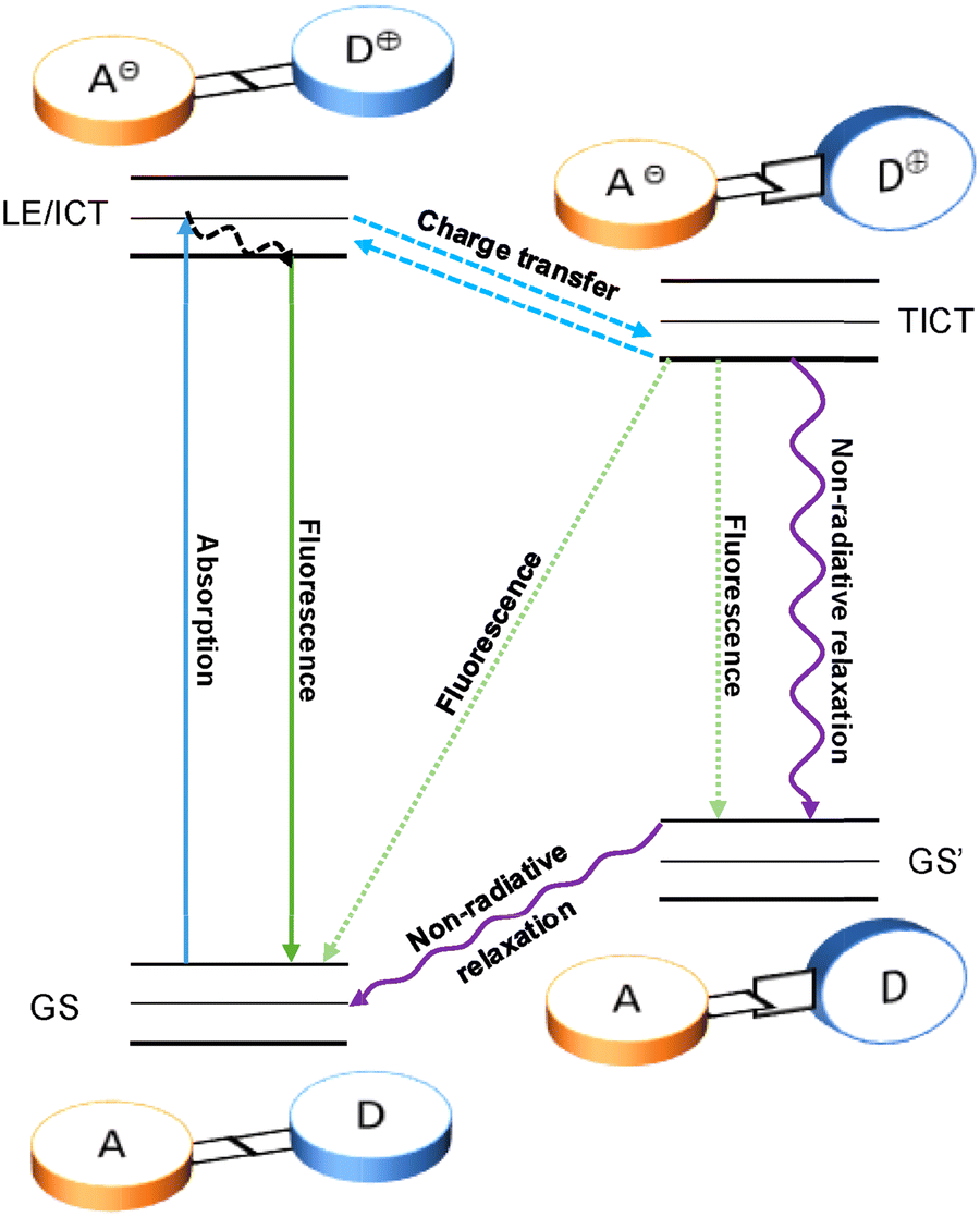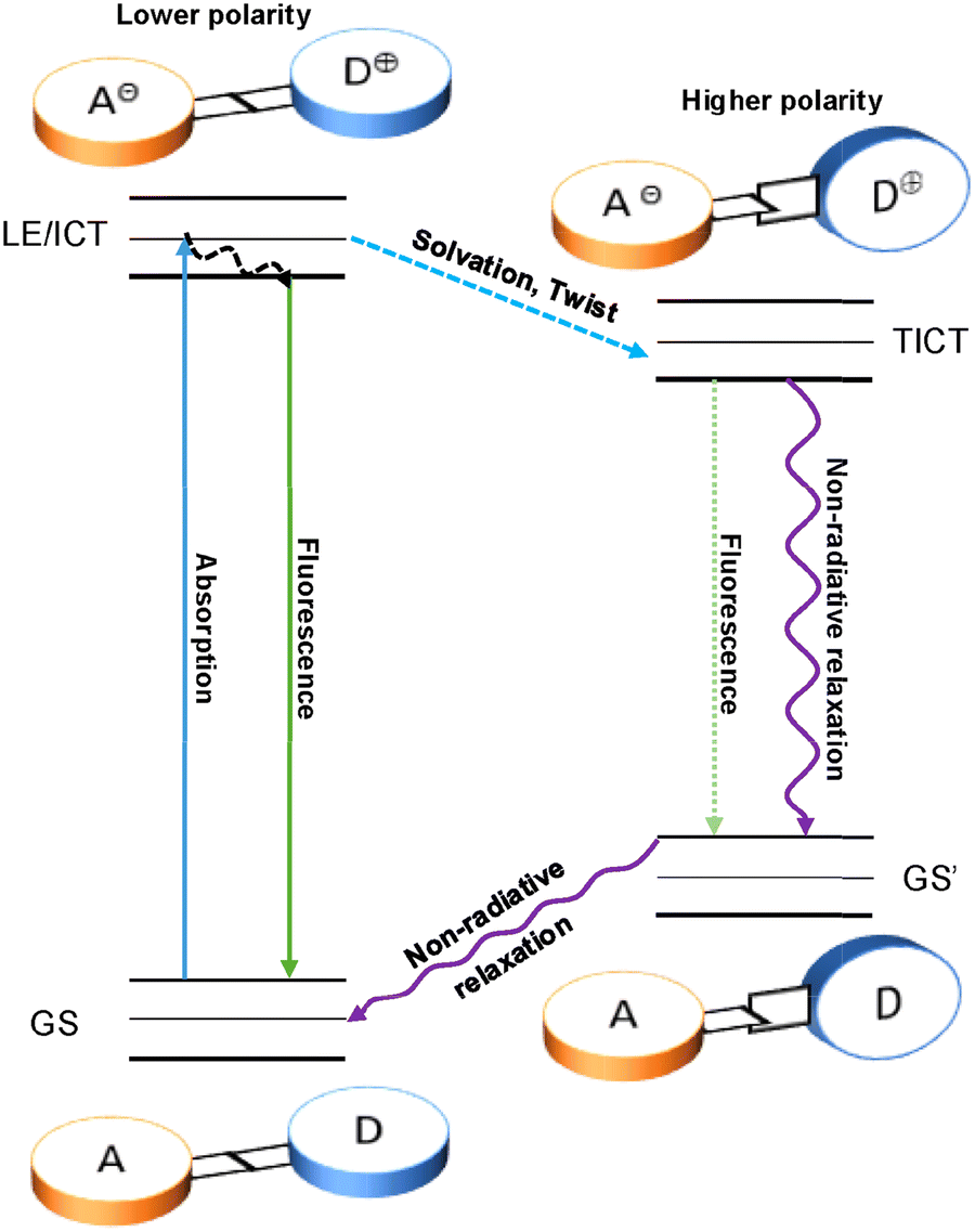 Because of the geometric structural change from the ground state to the TICT state, the emission from the TICT state usually has a red shift, which results in a large Stokes shift.19 At the same time, this kind of emission shift can be used to generate systems exhibiting near infrared emission which is helpful for detection and tracking in vivo.19–21 Due to intramolecular charge transfer being affected by the polarity of solvents, TICT-based fluorophores are sensitive to their local environment.22–27 Significantly, the dual emission of TICT-based fluorophores can enable ratiometric detection. Pointedly, ratiometric fluorescent probes can avoid interference and ensure more reliable and accurate results, due to the built-in correction.22,27–31 On the other hand, the nonradiative decay from TICT to GS′ contributes to an increase in heat production, which can lead to applications in photothermal therapy (PTT).21,32–35 Nevertheless, due to radiationless transitions, the fluorescence quantum yield of TICT-based fluorophores can be low.21