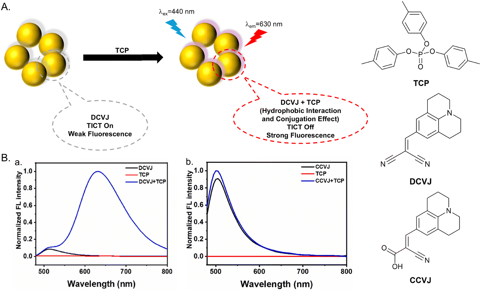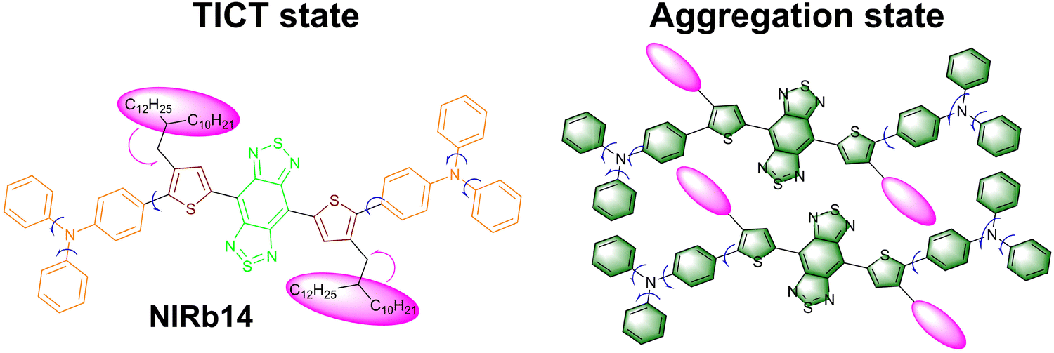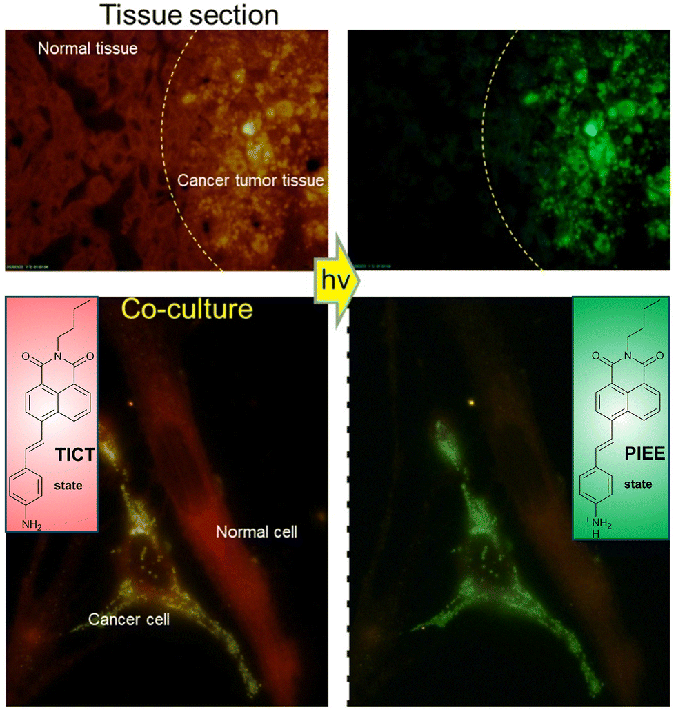 Because of the geometric structural change from the ground state to the TICT state, the emission from the TICT state usually has a red shift, which results in a large Stokes shift.19 At the same time, this kind of emission shift can be used to generate systems exhibiting near infrared emission which is helpful for detection and tracking in vivo.19–21 Due to intramolecular charge transfer being affected by the polarity of solvents, TICT-based fluorophores are sensitive to their local environment.22–27 Significantly, the dual emission of TICT-based fluorophores can enable ratiometric detection. Pointedly, ratiometric fluorescent probes can avoid interference and ensure more reliable and accurate results, due to the built-in correction.22,27–31 On the other hand, the nonradiative decay from TICT to GS′ contributes to an increase in heat production, which can lead to applications in photothermal therapy (PTT).21,32–35 Nevertheless, due to radiationless transitions, the fluorescence quantum yield of TICT-based fluorophores can be low.21