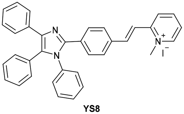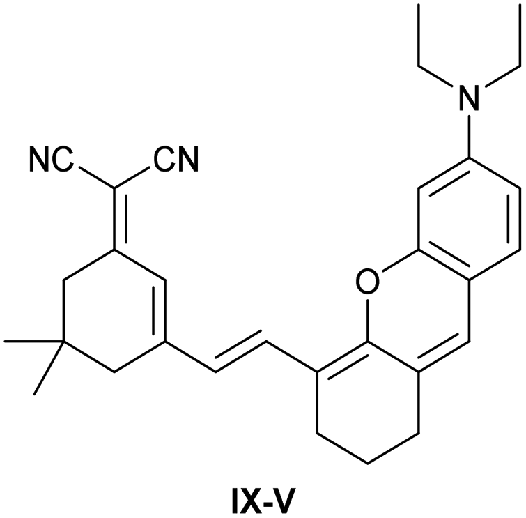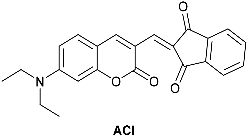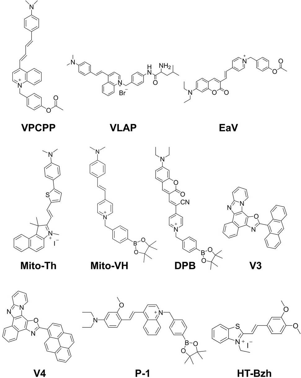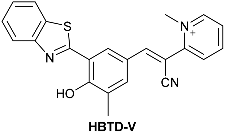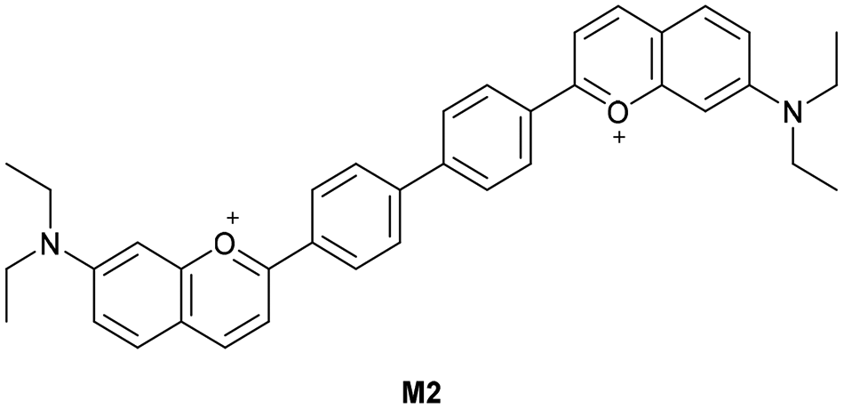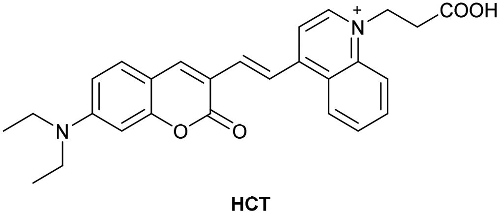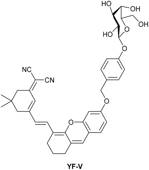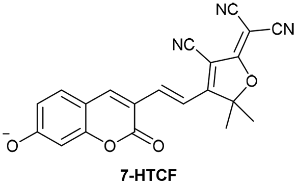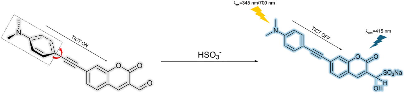 Yu et al. developed a coumarin-based two photon fluorescent probe (DMPCA) for detecting HSO3− (Fig. 30), using a N,N-dimethylamino group as the electron donor to construct the TICT system. The introduction of the phenyl acetylene linker aimed to increase the two-photon absorption cross-section of the system, since previous studies on structurally similar probes had indicated that this parameter could be improved by extending the conjugation of the system.118 HSO3− can react with the aldehyde, forming an adduct which turns off the TICT process and changes the fluorescence emission from weak to strong. DMPCA was used to image HSO3− in living HeLa cells under two-photon excitation, and the probe exhibited low cytotoxicity and good cell permeability.119