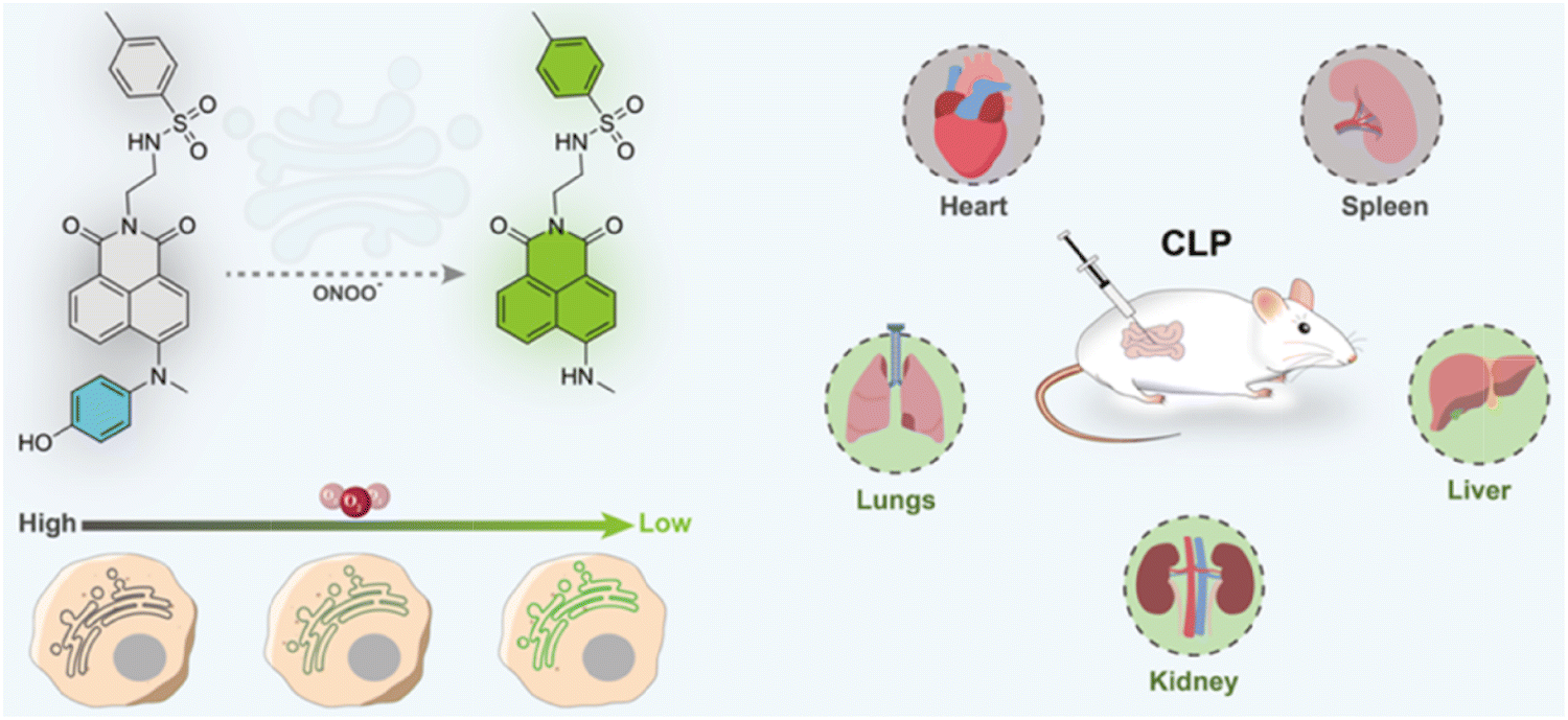 Zhan et al. developed a two-photon turn-on fluorescent probe (ER-ONOO−) targeting the endoplasmic reticulum (ER) for ONOO− detection (Fig. 31). The probe consisted of a 1,8-naphthalimide fluorophore, an N-methyl-N-(4-hydroxyphenyl)amino receptor and a p-toluenesulfonamide group used for ER targeting. When oxidative N-dearylation occurred upon the addition of ONOO−, the TICT process was switched off and pronounced fluorescence emission at 557 nm could be observed upon excitation at 450 nm. ER-ONOO− exhibited a rapid response and excellent sensitivity with a detection limit of 5.2 nM towards ONOO−. As expected, ER-ONOO− accumulated and detected ONOO− in the ER. In addition, ER-ONOO− exhibited good sensing performance when imaging exogenous ONOO− in living H1299 cells, monitoring the changes of ONOO− levels in a cellular hypoxia model and elucidating the functions of ONOO− in the sepsis of CLP (cecum ligation and puncture) mouse models.125