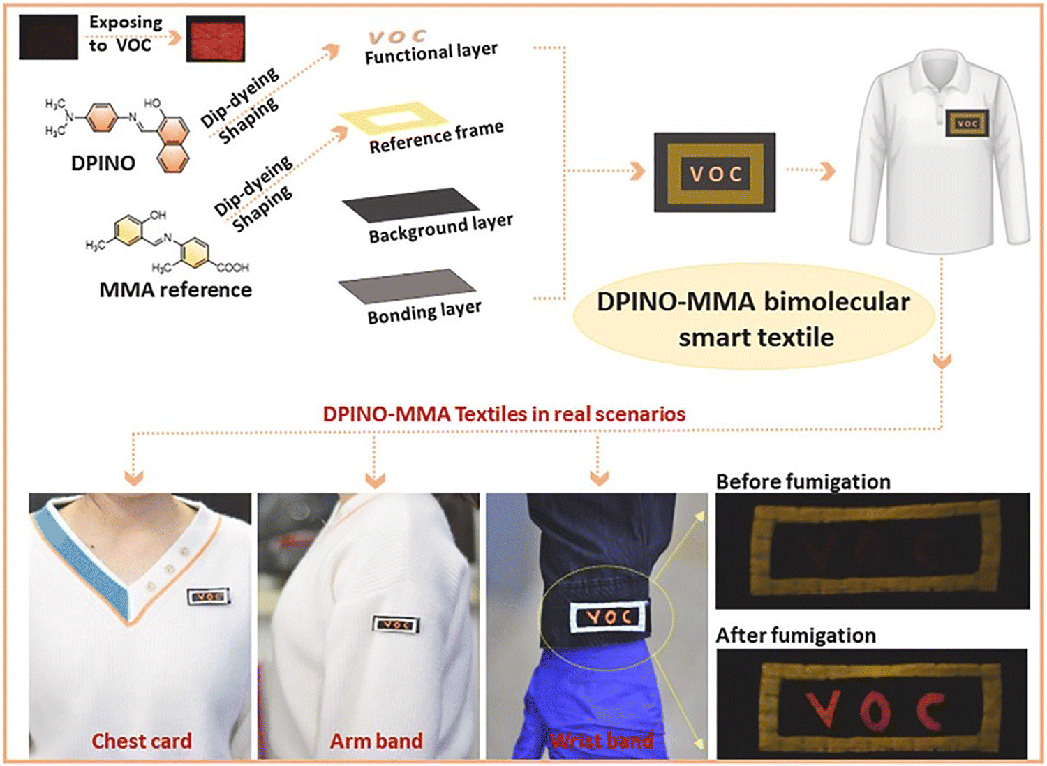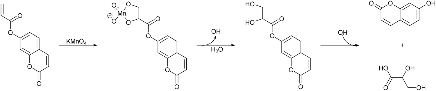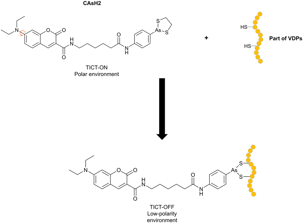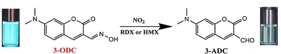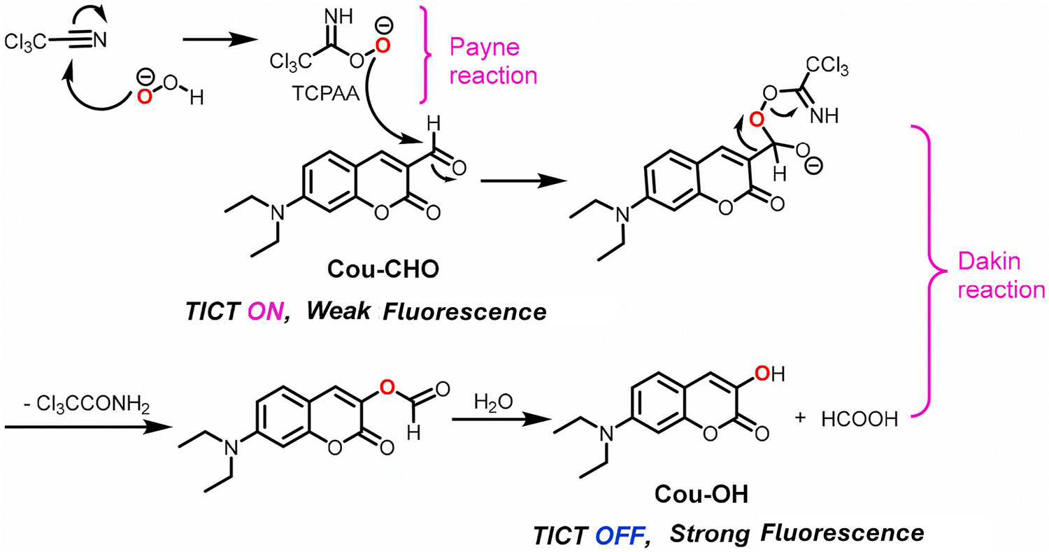 Wang et al. developed a TICT-based turn-on fluorescent probe (OCPE) for KMnO4 detection (Fig. 32). The probe consisted of a coumarin fluorophore and an acryloyl group as a typical twisting group in which the carbon–carbon double bond worked as the response site for KMnO4. The free rotation of the acryloyl group quenched the fluorescence of the coumarin fluorophore. Upon the addition of KMnO4, the carbon–carbon double bond was oxidized, and the ester bond was cleaved. Due to the cleavage of the twisting group, the coumarin fluorophore was released and a strong fluorescence emission at 458 nm was achieved upon excitation at 342 nm. OCPE exhibited a rapid response (within 3 s), excellent sensitivity (LOD: 0.95 nM) and high selectivity towards KMnO4. As such OCPE-impregnated paper test strips were fabricated to detect KMnO4 in solution. In addition, OCPE exhibited good sensing performance when tracking solids and airborne microparticulates using a hydrogel as a carrier. OCPE was embedded in a polyacrylamide hydrogel with an interpenetrating network which worked as a carrier to construct the OCPE-hydrogel sensor. KMnO4 solid could physically attach to the surface of this kind of sensor and then diffuse into the microliquid environment. Finally, KMnO4 reacted with OCPE to switch on the bright blue fluorescence response. KMnO4 solid in the range of 2.3 to 31.2 µm at amounts from 6.6 to 31.2 pg could be detected by the OCPE-hydrogel sensor. When it came to airborne KMnO4 microparticles, the fluorescence imaging of particles which were 2.3 µm in diameter (6.6 pg) was achieved using the OCPE-hydrogel sensor.126