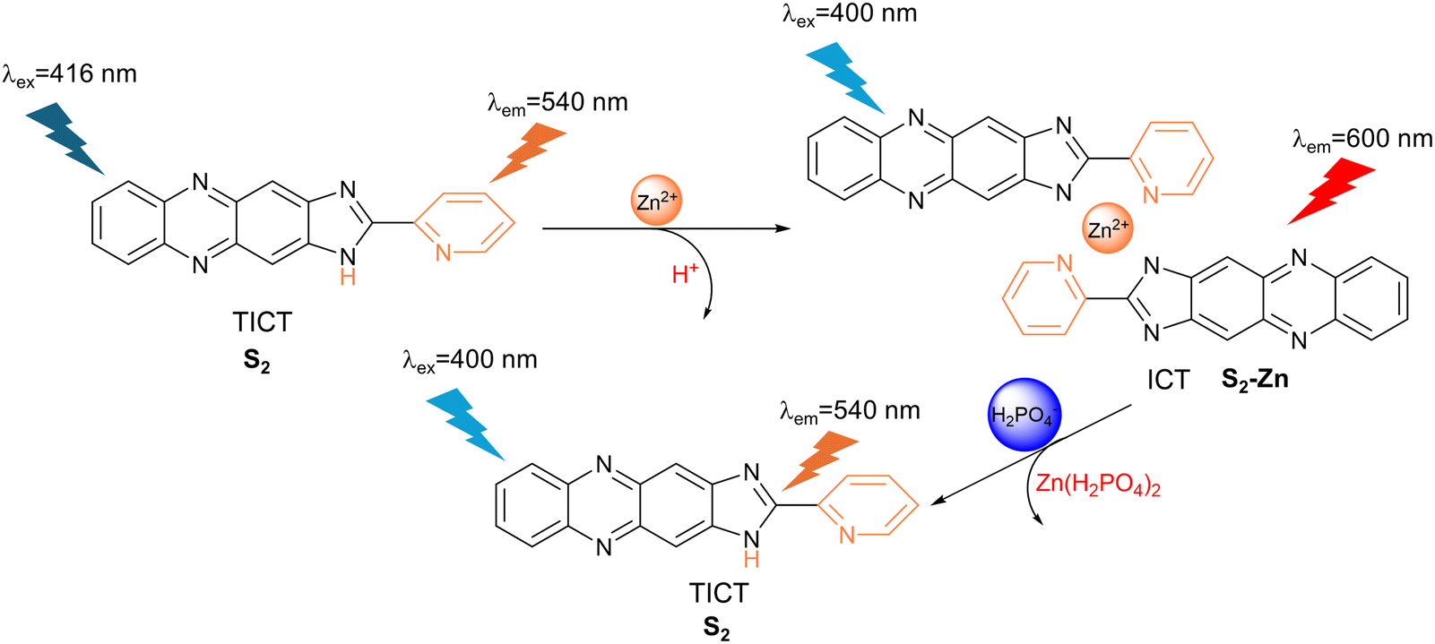 Shi et al. developed a colorimetric and fluorescent probe (S2) consisting of a phenazine fluorophore and a response site based on imidazole and pyridine for H2PO4− detection (Fig. 33). Due to the TICT process between the pyridine and phenazine moieties, S2 achieved a fluorescence emission at 540 nm when excited at 416 nm. Zn2+ could coordinate with the nitrogen of the imidazole and pyridine groups so that the dihedral angle between the two aromatic rings decreased and the electron transfer was suppressed. Due to the recovery of the co-planarity of the conjugated system, a strong red fluorescence was observed at 600 nm when excited at 400 nm. Upon the addition of H2PO4−, the complex (S2-Zn) between S2 and Zn2+ was decomposed and the TICT process recovered. So, the fluorescence emission maximum returned to 540 nm when excited at 400 nm. In addition, S2-Zn exhibited excellent selectivity towards H2PO4− when incorporated into paper test strips.129a Members from the same group had previously shown that the system also works with Cd2+.129b