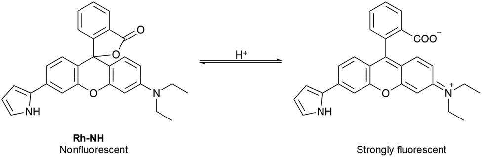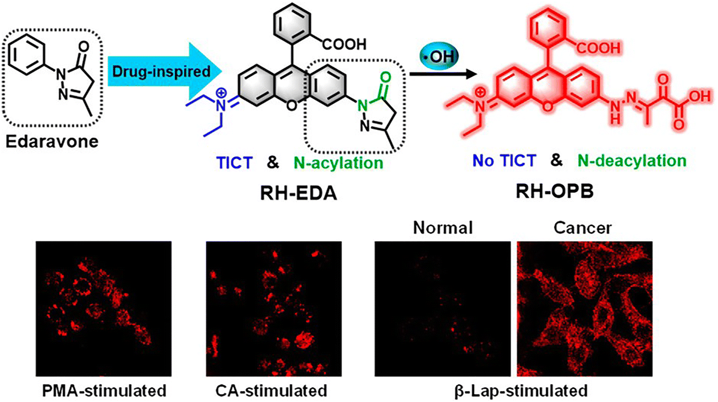 Chen et al. developed a turn-on fluorescent probe (RH-EDA) based on edaravone and rhodamine for ˙OH detection (Fig. 34). In the excited state, due to the non-symmetric structure of RH-EDA and its intramolecular charge transfer, a strong push–pull effect can be produced, resulting in structural twisting between the diethylamino donor and the rhodamine acceptor and the formation of the TICT state. The TICT process and N-acyl substructure resulted in minimal fluorescence of RH-EDA. The addition of ˙OH opened the ring of the pyrazolone motif and led to the deacylation of the rhodamine nitrogen. The inhibition of the push–pull effect and the TICT process led to an increase of fluorescence at 579 nm upon excitation at 550 nm. RH-EDA was used to image endogenous ˙OH in living cells and zebrafish with high selectivity and sensitivity. Upon stimulation with β-lapachone, which is an anticancer drug used to trigger ˙OH generation in living cells, RH-EDA discriminated cancer cells from normal cells by detecting different levels of ˙OH.137