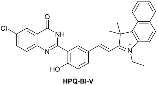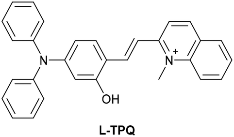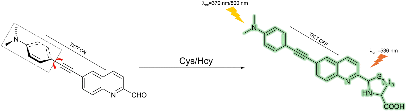 Wei et al. constructed a two-photon TICT-based fluorescent probe (NQ) consisting of a quinoline fluorophore and an N,N-dimethyl group as a typical TICT twisting group for the detection of cysteine and homocysteine (Fig. 35). The perpendicular structure in the excited state and the charge-separation between the 4-ethynyl-N,N-dimethylaniline group and the quinoline-2-carbaldehyde group promoted the TICT process and resulted in fluorescence quenching. The addition of Cys or Hcy could recover the co-planarity, inhibit the TICT effect and achieve a strong fluorescence emission. NQ exhibited pH independence, excellent sensitivity and high selectivity towards Cys and Hcy over other analytes. NQ also exhibited low cytotoxicity and good sensing performance when used to monitor changes in Cys levels in living cells using two-photon excitation.140