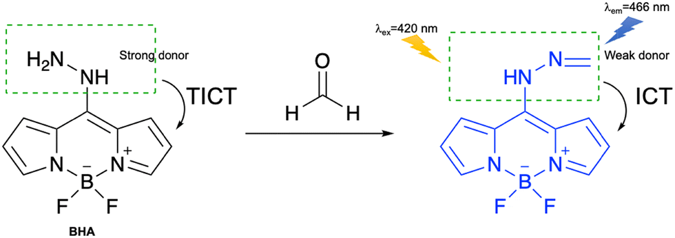 Chen et al. developed an activity-based fluorescent probe (BHA) based on BODIPY-substituted hydrazine for HCHO detection (Fig. 36). The TICT process between the 8-hydrazino group and the BODIPY fluorophore led to BHA being non-fluorescent. The addition of HCHO results in reaction and formation of a hydrazone, resulting in the TICT process changing to an ICT process and a fluorescence response being observed. BHA exhibited high selectivity towards HCHO and excellent sensitivity with a detection limit of 0.18 µM. The probe was also successfully used to image endogenous HCHO in living HeLa cells.142