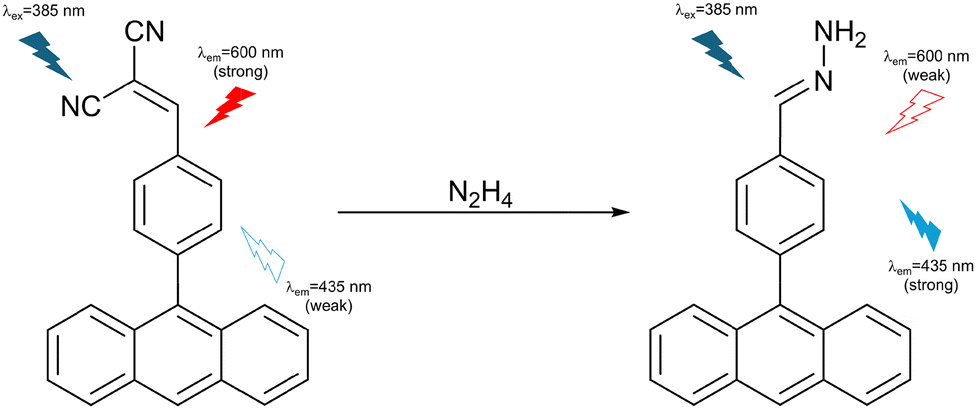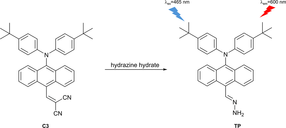 Chen et al. developed a turn-on fluorescent probe (C3) with a dicyanovinyl receptor for hydrazine detection (Fig. 37 and 20 where C3 was used for the detection of cyanide anion). In the excited state, the diphenylamine group functioned as electron donor and the dicyanovinyl group served as the electron acceptor. At the same time, the anthryl group was non-coplanar with the N-phenyl groups. This enabled the TICT process and hence rendered the probe only weakly fluorescent. The addition of hydrazine results in the formation of TP by conjugate addition to the dicyanovinyl group and subsequent loss of malononitrile. This eliminates the TICT process to achieve a strong fluorescence emission. C3 exhibited high selectivity towards hydrazine and excellent sensitivity with a detection limit of 7 ppb.154