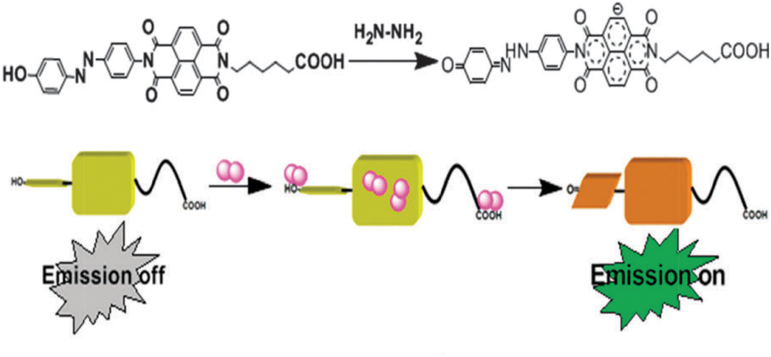 Zhou et al. self-assembled a turn-on nanoribbon-based fluorescent probe (NDI-AB 1) for detecting hydrazine hydrate (Fig. 38). A phenolic azobenzene group as an electron donor was appended to the imide nitrogen of the naphthalenediimide to construct the probe. Due to the non-planar structure and the TICT effect, NDI-AB 1 exhibited only weak fluorescence. When dissolved in water, NDI-AB 1 self-assembled into nanoribbons and the fluorescence was further quenched due to π–π interactions. Upon addition of hydrazine hydrate, the hydroxy group reportedly underwent tautomerism to a quinoidal structure to inhibit the TICT process. At the same time, hydrogen bonds between hydrazine and the imide carbonyls or the quinone increased the interaction of NDI-AB 1 with hydrazine hydrate. This led to the formation of an electron donor-acceptor (EDA) complex between the electron-deficient NDI core and the electron-rich hydrazine; the presence of the NDI radical anion in this EDA complex was confirmed by EPR spectroscopy. Because of the hydrogen bonds and the electron density of the radical anion, π–π stacking was disrupted, which led to a nano structural change from ribbons to vesicles. Finally, the radical anion as aggregates resulted in strong fluorescence emission at 405 nm when excited at 302 nm.155