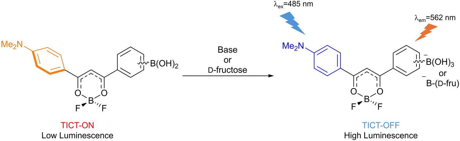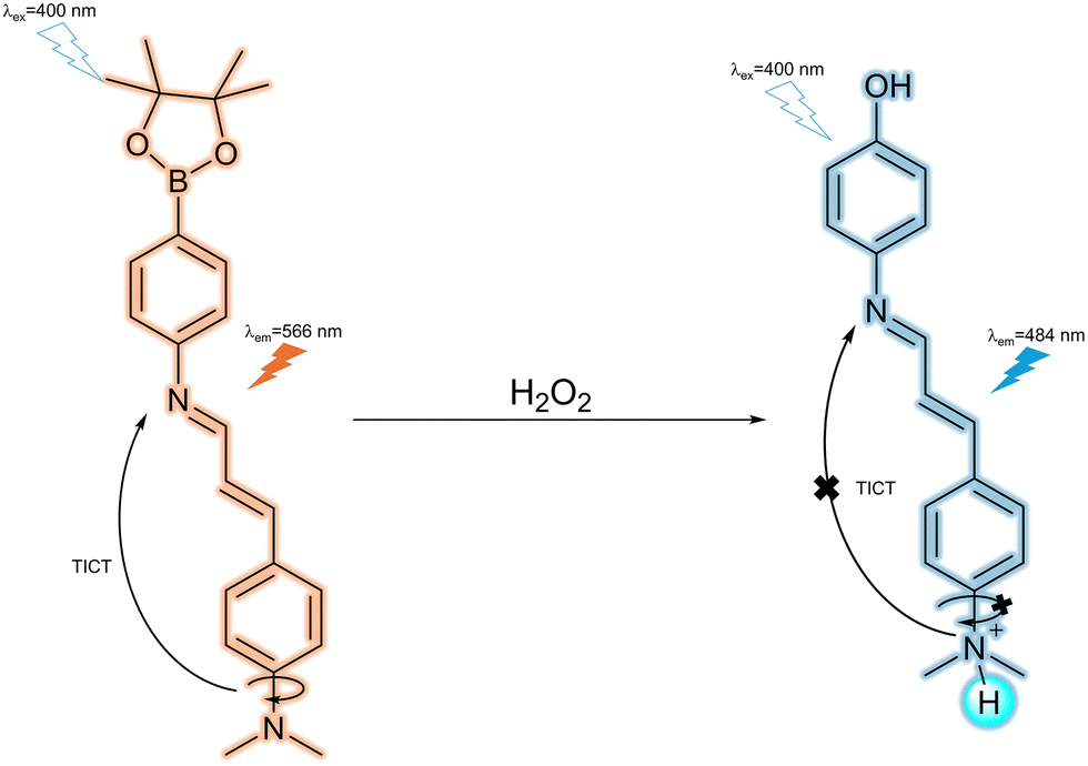 Kumar et al. developed a dimethylaminocinnamaldehyde imine arylboronate fluorescent probe (3) for H2O2 detection (Fig. 40). Electron transfer from the dimethylamino donor to the imino acceptor led to a TICT-induced orange fluorescence emission at 566 nm. Upon the addition of H2O2 at pH 7.0, the arylboronate group (an electron-withdrawing group) was oxidised to a phenol moiety (an electron-donating group), which in turn increases the pKaH of the dimethylamino group resulting in protonation. The inhibition of the TICT process resulted in a blue shift of fluorescence emission from 566 nm to 484 nm. To confirm this mechanism, the fluorescence behaviour of 3 at different pH values was studied. At pH 6.0, only the delocalized excited emission at 484 nm was observed while there is no TICT emission band at 566 nm. This supports the authors’ proposal that protonation of the dimethylamino group can effectively inhibit the TICT process. In addition to exhibiting high selectivity towards H2O2 in aqueous solutions, the probe was also used to image the H2O2 level changes in living PC3 prostate cancer cell lines.162