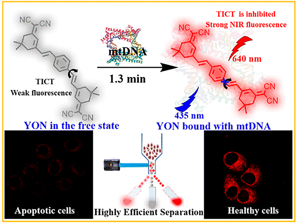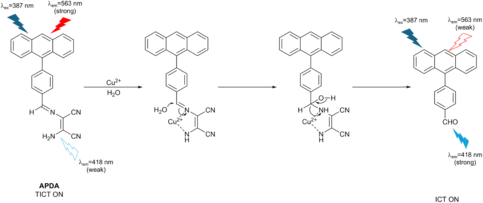 Rai et al. developed a ratiometric turn-on activity-based fluorescent probe (APDA) based on TICT/ICT. The probe consisted of a polycyclic aromatic core with a diaminomaleonitrile (DAMN) as the response site for Cu2+ (Fig. 9). APDA was observed as a reddish-brown solution by the naked eye under UV light at 365 nm. At the same time, due to the TICT mechanism, there are a strong emission at 563 nm and a weak emission at 418 nm in the fluorescence emission spectrum under excitation at 387 nm. The addition of Cu2+ resulted in hydrolysis of the imine bond and release of an aldehyde derivative with a strong blue emission at 418 nm when excited at 387 nm, due to interruption of the TICT process. Furthermore, APDA was used to image Cu2+ in live human breast cancer cells. Since TICT-based APDA exhibits dual emission, two channels were used to observe the fluorescence changes of APDA in the presence or absence of Cu2+. There was an obvious fluorescence change in the blue channel while insignificant fluorescence was observed in the green channel. In addition to Cu2+, APDA also exhibited a similar response to hypochlorite anion (ClO−).28