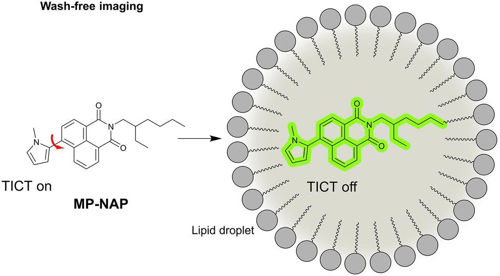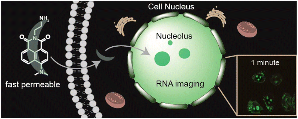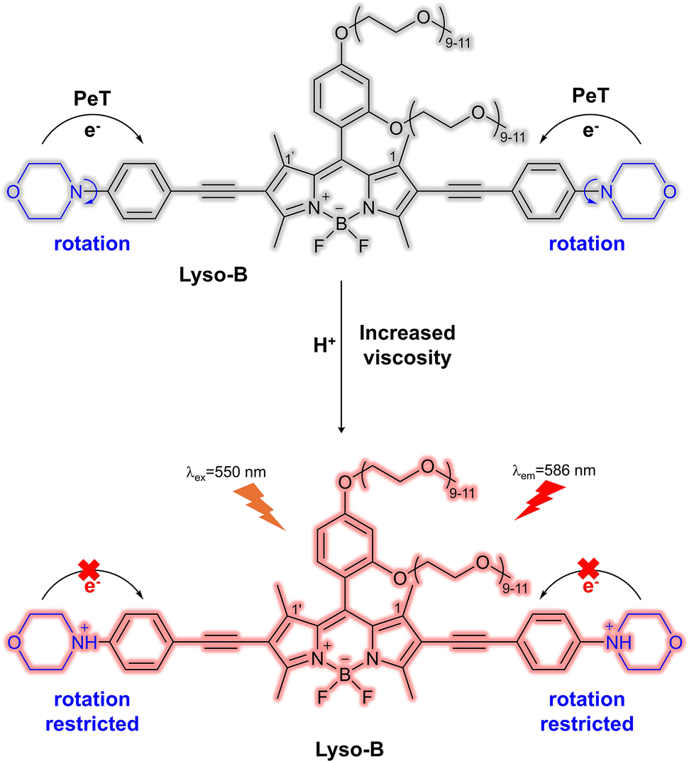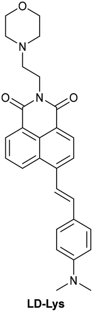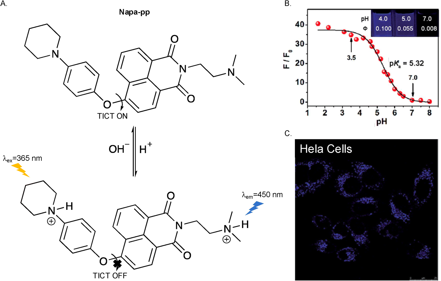 Yu et al. introduced a 1-piperidinyl group on to a 4-phenyloxy-1,8-naphthalimide skeleton to obtain a TICT-based fluorescent probe (Napa-pp). A (2-dimethylamino)ethyl sidechain was appended to the imide nitrogen to improve the water solubility of Napa-pp, which has a reported pKa value of 5.32. The acidic environment of lysosomes, with a pH ranging from 5.0 to 6.0, can protonate the nitrogen atoms on the piperidinyl group and the (2-dimethylamino)ethyl group, thereby inhibiting the TICT process and switching on the fluorescence of Napa-pp, enabling the visualization of lysosomes in living cells (Fig. 4).44