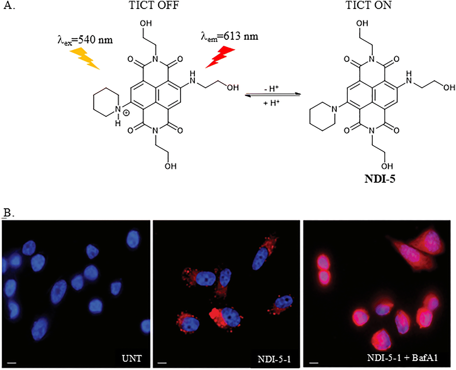 | Fig. 5 (A) The proposed mechanism of NDI-5. B. Cell imaging studies of NDI-5 in PC-3 cells. UNT: untreated cells. NDI-5: PC-3 cells incubated with 60 µmol L−1NDI-5 for 90 min. NDI-5 + BafA1: PC-3 cells incubated with 60 µmol L−1NDI-5 for 90 min and treated with 50 nmol L−1 of BafA1 for 3 h. Scale bars: 10 µm. Image reproduced with permission from ref. 46. Copyright 2015, The Royal Society of Chemistry. | ||