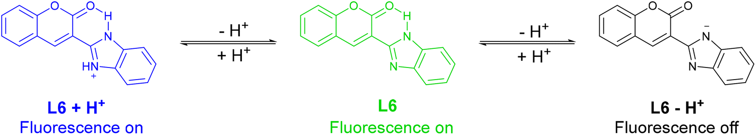 Zhu et al. designed a coumarin-based wide-range pH-responsive fluorescent probe (L6) including a benzimidazole group as a proton-responsive site (Fig. 6). When the pH value ranged from 4.5 to 8.5, L6 produced a strong green emission at 497 nm under 371 nm excitation due to the ICT process. Under more acidic conditions (pH ranging from 1.0 to 3.0), a brilliant blue emission at 440 nm was observed when excited at 371 nm. However, under basic conditions (pH ranging from 10.5–13.5), the fluorescence of L6 was quenched and a red shift of the maximum absorption wavelength in the UV-VIS spectrum was observed because deprotonation promoted the TICT process. Besides, the reversibility of L6 fluorescence was demonstrated by the alternating addition of tetra-N-butyl ammonium hydroxide (TBAOH) and HClO4. Significantly, during the switching process, there was almost no loss in fluorescence efficiency. Due to the low solubility of L6, the probe response was evaluated in a DMSO/H2O (1