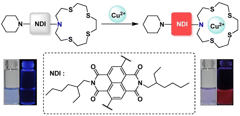 Zong et al. designed a turn-on TICT fluorescent probe (NDI-4) based on a core substituted naphthalenediimide linked with to 1,4,7,10-tetrathia-13-azacyclopentadecane group as the Cu2+ responsive site (Fig. 7). Due to the TICT effect, NDI-4 was nearly non fluorescent even though there was strong ICT effect between the alkyamino electron donor and the naphthalene diimide electron acceptor. After the nitrogen and four sulfur atoms on the 1,4,7,10-tetrathia-13-azacyclopentadecane group coordinated with Cu2+, NDI-4 emitted a strong red fluorescence at 638 nm because of the inhibition of the TICT process. NDI-4 exhibited high sensitivity with a detection limit of 4 µM and excellent selectivity towards Cu2+.53