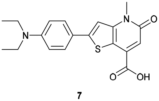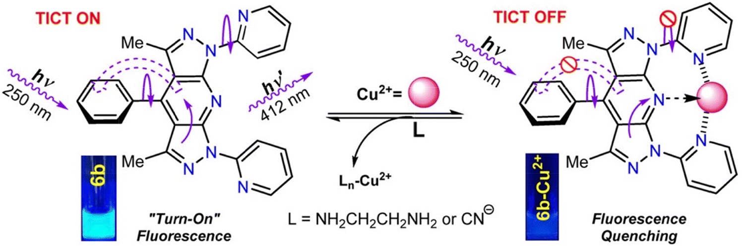 García et al. developed a TICT turn-off fluorescent probe (6b) based on a 1,7-dipyridyl-bis(pyrazolo)pyridine (PBP) (Fig. 8). This tridentate ligand contained a fused tricyclic structure with two alkyl and three aryl substituents, as well as three pyridyl nitrogen atoms as suitable motifs to ligate Cu2+. The probe exhibited strong blue fluorescence and a large Stokes shift, which is one of the advantages of the TICT mechanism. When Cu2+ formed a complex with 6b, the structure became more rigid and ligand-metal charge transfer became the dominant process due to the tridentate binding mode. This resulted in fluorescence quenching through inhibition of the TICT process. Additionally, the binding between 6b and Cu2+ was shown to be reversible. Ethylenediamine has a high affinity for Cu2+ and it was demonstrated that 6b-Cu2+ can release 6b with recovery of fluorescence upon the addition of ethylenediamine.54