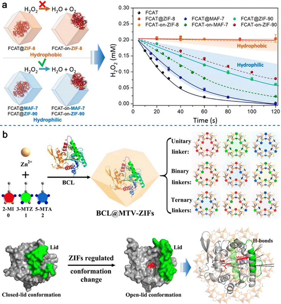 The Doonan group84 utilized coprecipitation to tune the hydrophilicity of the environment of the MOF by utilizing ZIF-8, ZIF-90, and MAF-7 (MAF = metal-azolate framework) with micropores to load fluorescein-tagged catalase (FCAT, 4.4 nm × 4.9 nm × 5.6 nm) (Fig. 18a). They found that the hydrophobic environment of ZIF-8 can lead to unwanted conformational change and aggregation of enzymes, thereby decreasing its activity, while other two biocomposites with hydrophilic environment showed good decomposing effect on hydrogen peroxide. Another case study was reported by Li et al.,85 who coprecipitated Burkholderia cepacia lipase (BCL) and MTV-ZIF-8 with continuously tuned hydrophilicity in the pores that a specific sequence of arrangement could regulate the switch of enzyme conformation (Fig. 18b). The microenvironment effects in MOFs are crucial to the catalytic performances (including activity, stability and selectivity) via coprecipitation for enzyme@MOFs. These examples include Cyt c@NKMOF-101-Zn by the Chen group,86 α-glucosidase α-G/GOx@Cu-MOF by the Zhao group,87 and Candida rugosa lipase (CRL)@ZIF-8 by the Luo group.88
