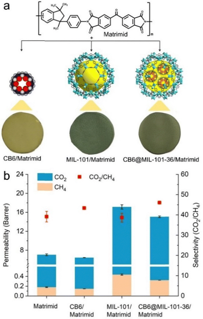 Fig. 20 (a) Schematic views of the structure of Matrimid (top), the porous fillers (middle), and the mixed matrix membranes (bottom). (b) Performance of Matrimid membrane, CB6/Matrimid, MIL-101/Matrimid, and CB6@MIL-101-36/Matrimid membranes with a loading 16 wt% for the separation of CO2 from a 50 : 50 v : v CO2/CH4 mixture at 25 °C and 3 bar. Reproduced from ref. 25 with permission of Wiley-VCH Verlag GmbH & Co., Copyright 2020. | ||