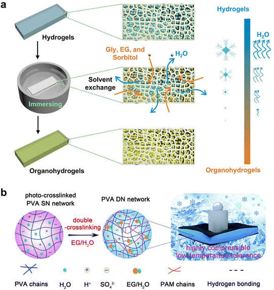 | Fig. 7 Two typical synthesis routes of antifreezing organogels: (a) the solvent-exchange method for preparing Ca-alginate/PAAm-Gly,84 PAMPS/PAAm-EG,85 gelatin-EG,102 HPC/PVA-Gly,55 and TA-CNTs/PVA-Gly organogels.86 Reproduced with permission from ref. 84, Copyright 2018 Wiley-VCH. (b) In situ polymerization for preparing PVA/PEDOT:PSS-EG,8 PVA/PAAm-EG,74 and PDMA/PEGDMA-heptane organogels.6 Reproduced with permission from ref. 74, Copyright 2020 Royal Society of Chemistry. | ||