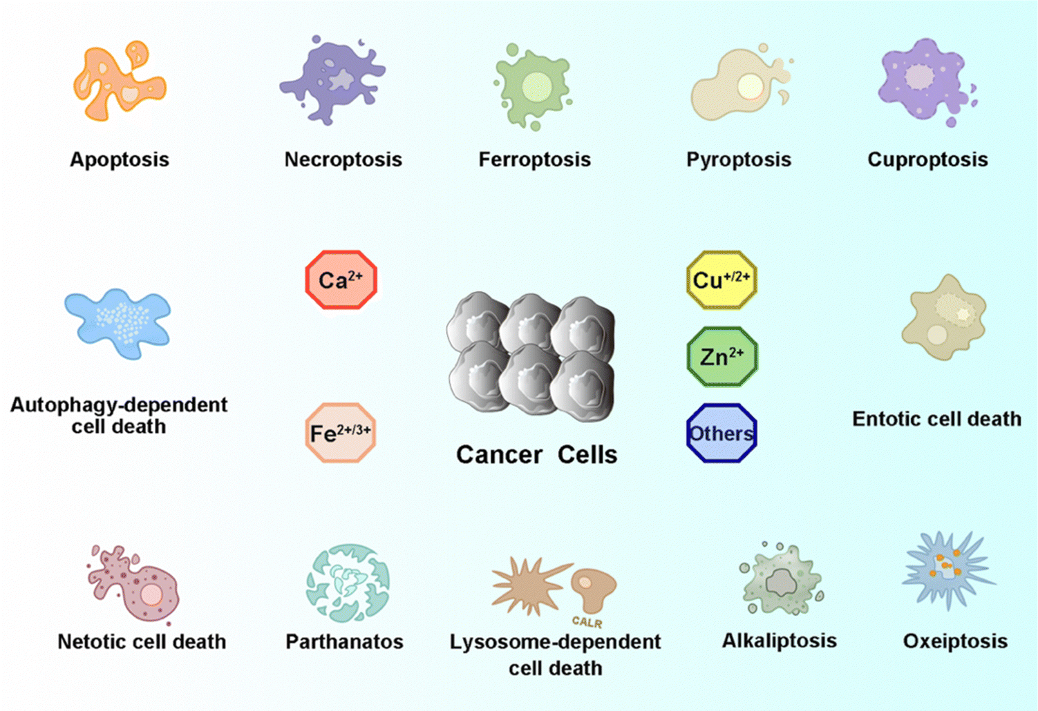 As one of the most common heterogeneous diseases, cancer has been characterized as a cell death disorder. Cell death plays a significant role in the homeostasis of multicellular organisms. According to the type of triggered stimulus, cellular context, and morphological criteria, cell death is categorized into accidental cell death (ACD) and programmed cell death (PCD).1 ACD is an out-of-control biological process. However, PCD relies on elaborate regulations that can be modulated by genetic, pharmacological, and biochemical interventions.2,3 Current PCD has been critically summarized into molecularly oriented definitions by the Nomenclature Committee on Cell Death (NCCD), including necroptosis, pyroptosis, ferroptosis, cuproptosis,4 entotic cell death, netotic cell death (NETosis), parthanatos, lysosome-dependent cell death, autophagy-dependent cell death, alkaliptosis, and oxeiptosis (Fig. 1). The molecular mechanisms responsible for triggering and transmitting distinct PCD are intricately interconnected. Therefore, different lethal subroutines within PCD can significantly impact cancer progression and treatment outcomes. In the early stages of oncogenesis, cancer cells may resist cancer treatments due to mutations disrupting the PCD pathway, thereby underscoring the evasion of PCD as a hallmark of cancer. The strategic initiation and management of PCD signals, either individually or synergistically, presents a means to surmount such resistance in specific cancer subtypes.5,6 Collectively, there is an urgent need to clarify the deep pathogenesis of cancer diseases combining various mechanisms of PCD for combating cancers.