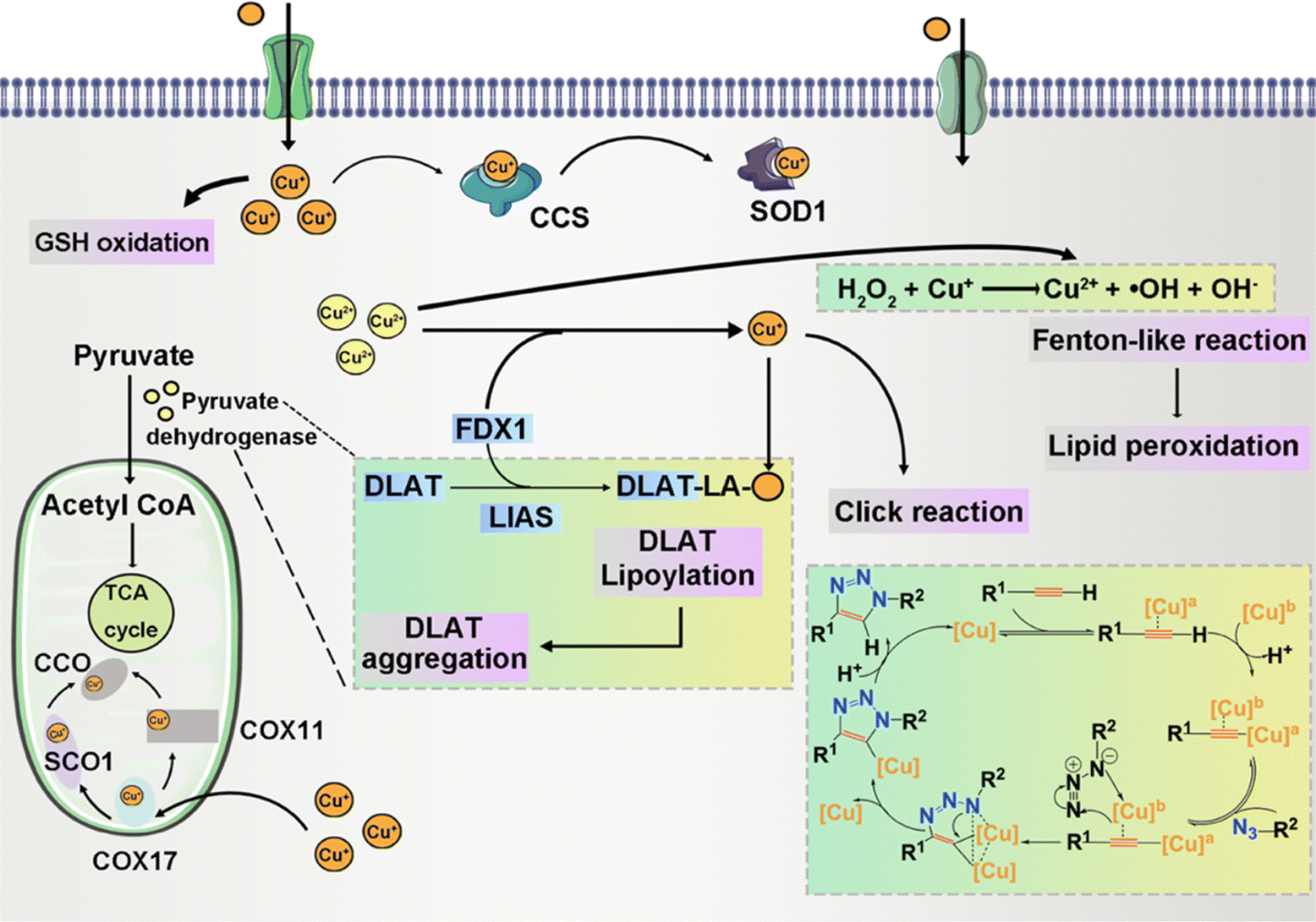 Cu with H2O2, GSH oxidation; COX, CCO, SCO1, CCS |