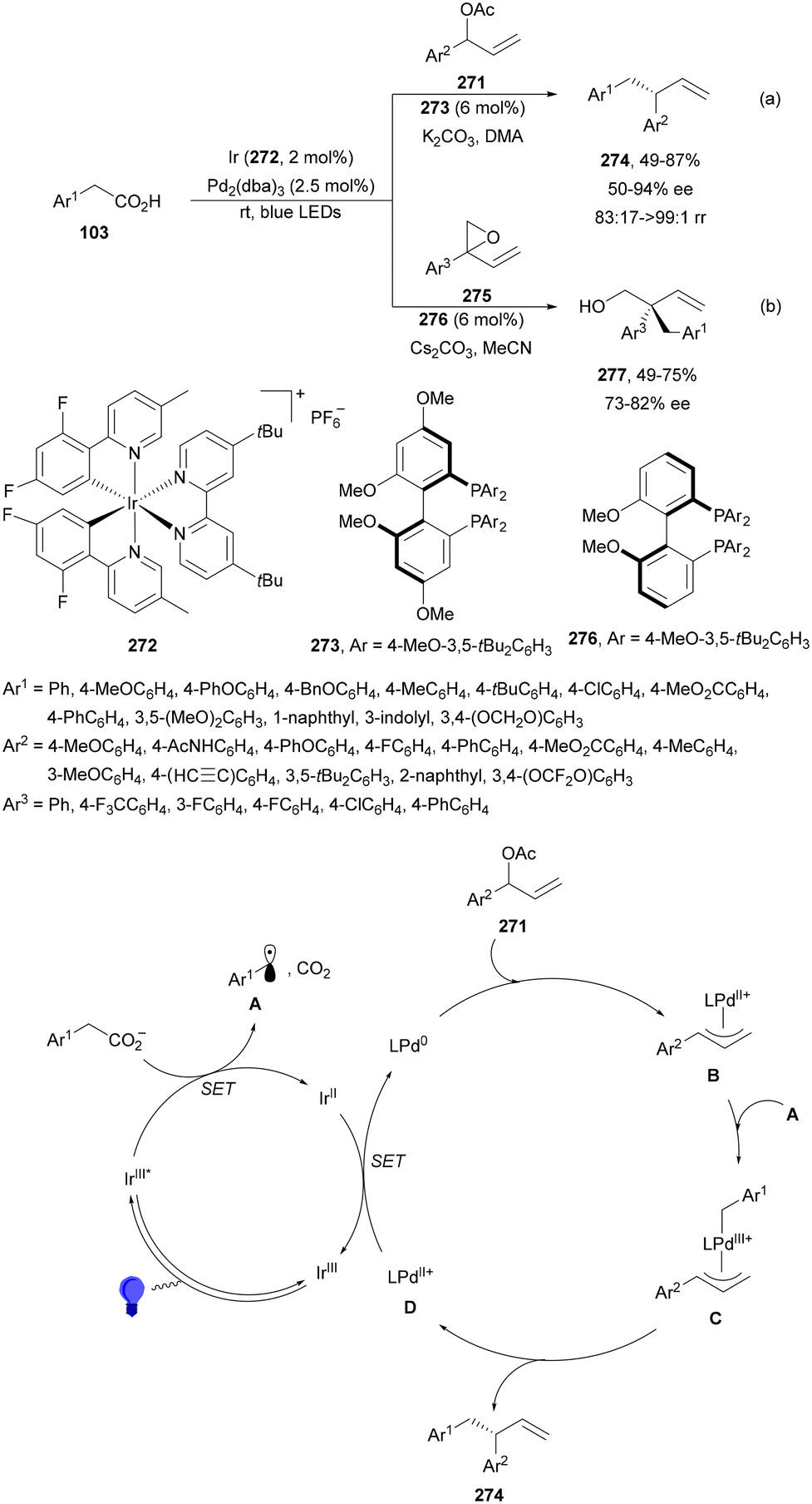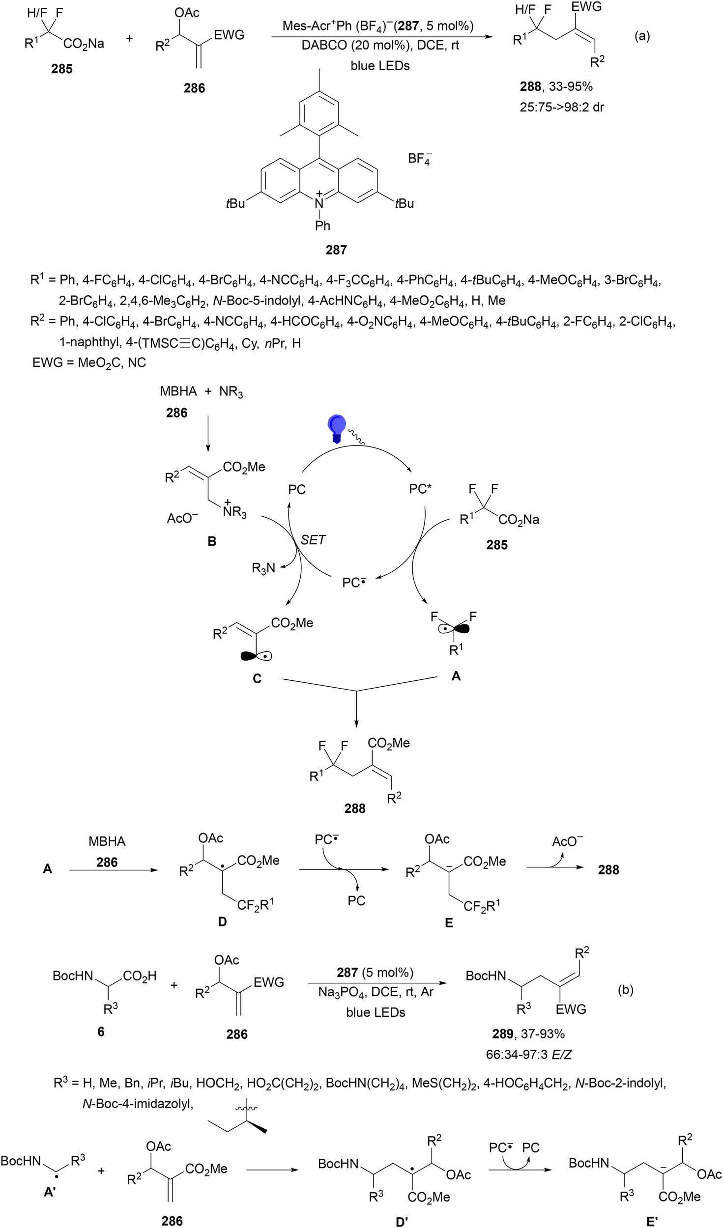 | Scheme 20 Decarboxylative hydrofluoroalkylation of allenes 51 (a) and 56 (b) with N-aryl AAs under Pd/Ir complex photocatalysis. | ||