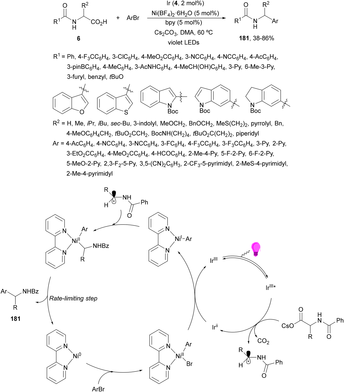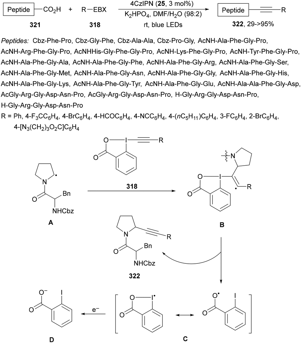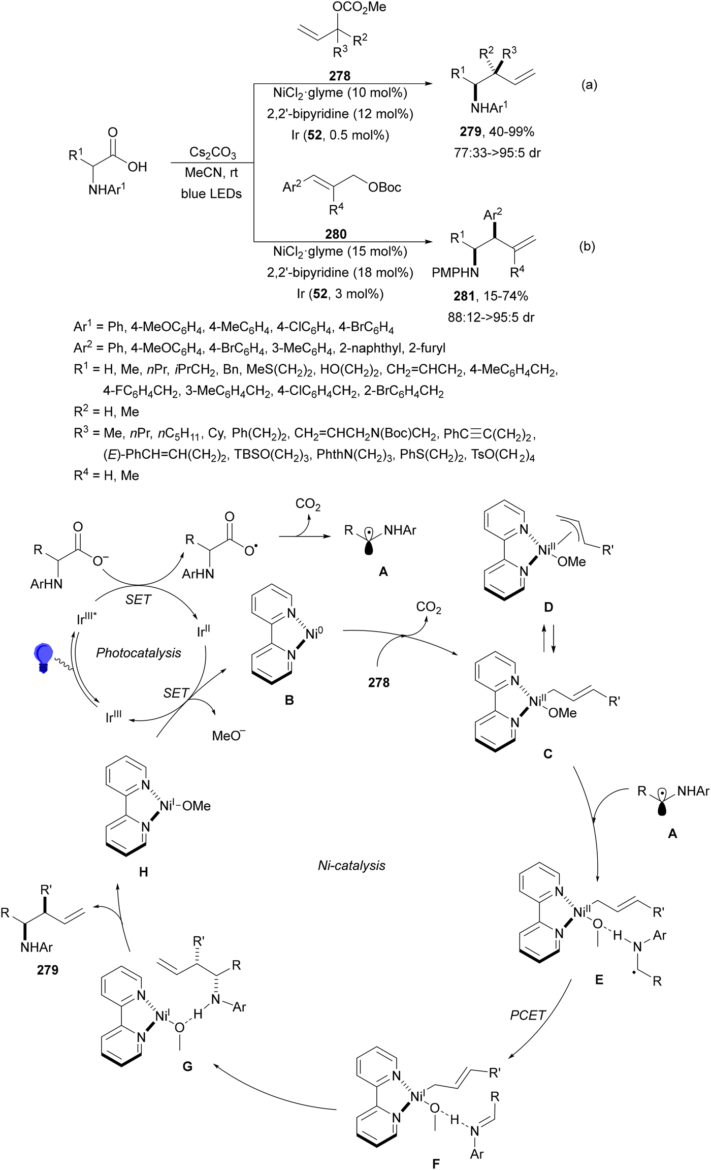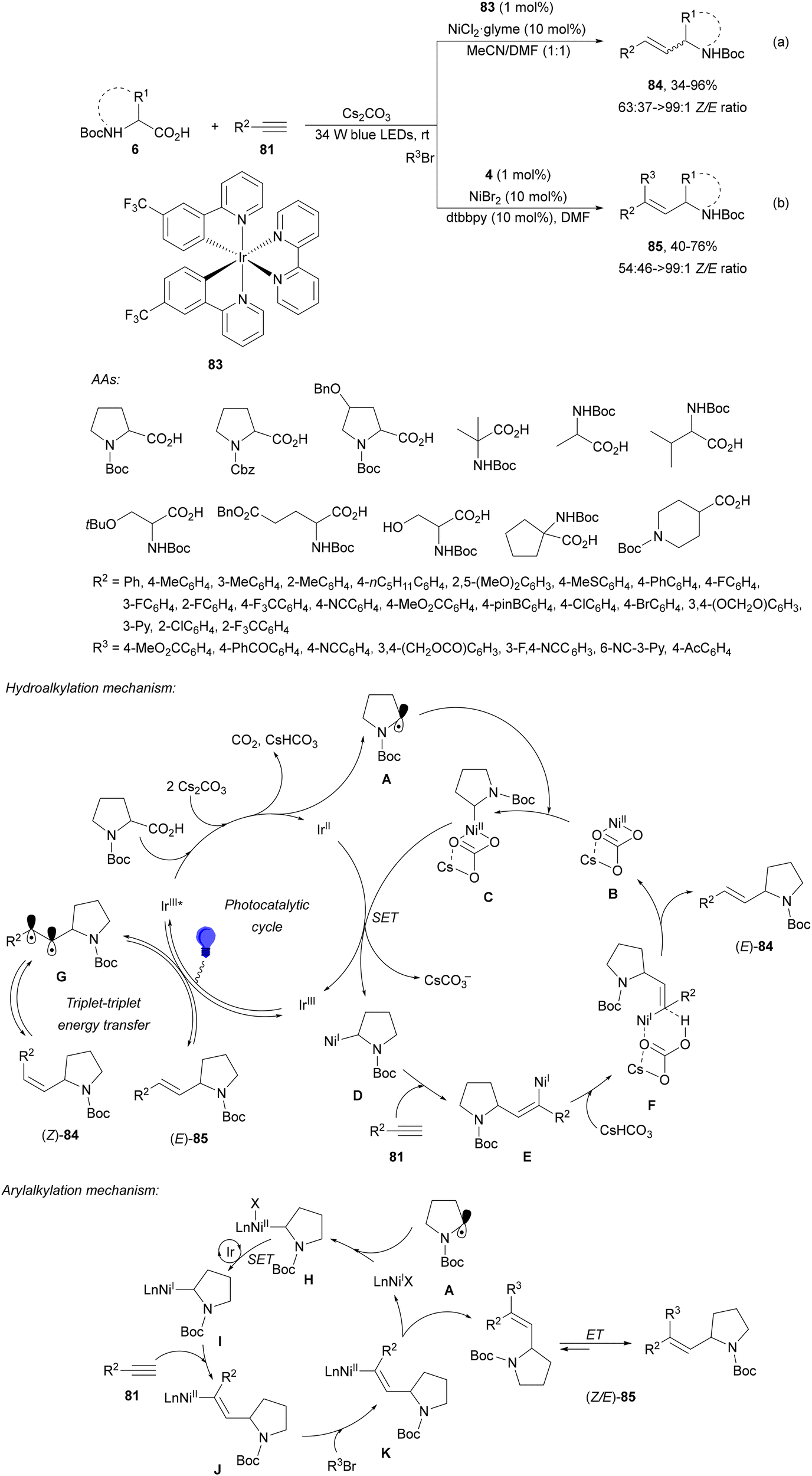 Rueping and co-workers97 have reported the anti-Markovnikov dual catalyzed hydroalkylation of terminal alkynes 81 using N-protected AAs 6 and the Ir complex 83 and NiCl2·glyme as a catalyst under blue LED irradiation. Products 84 were obtained with moderate to complete Z/E diastereoselectivities and yields using Cs2CO3 as a base and a 1