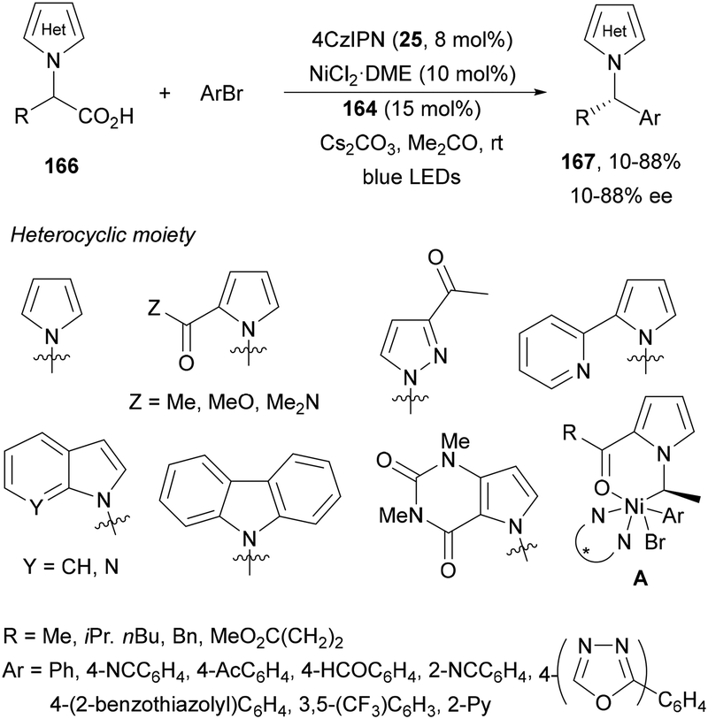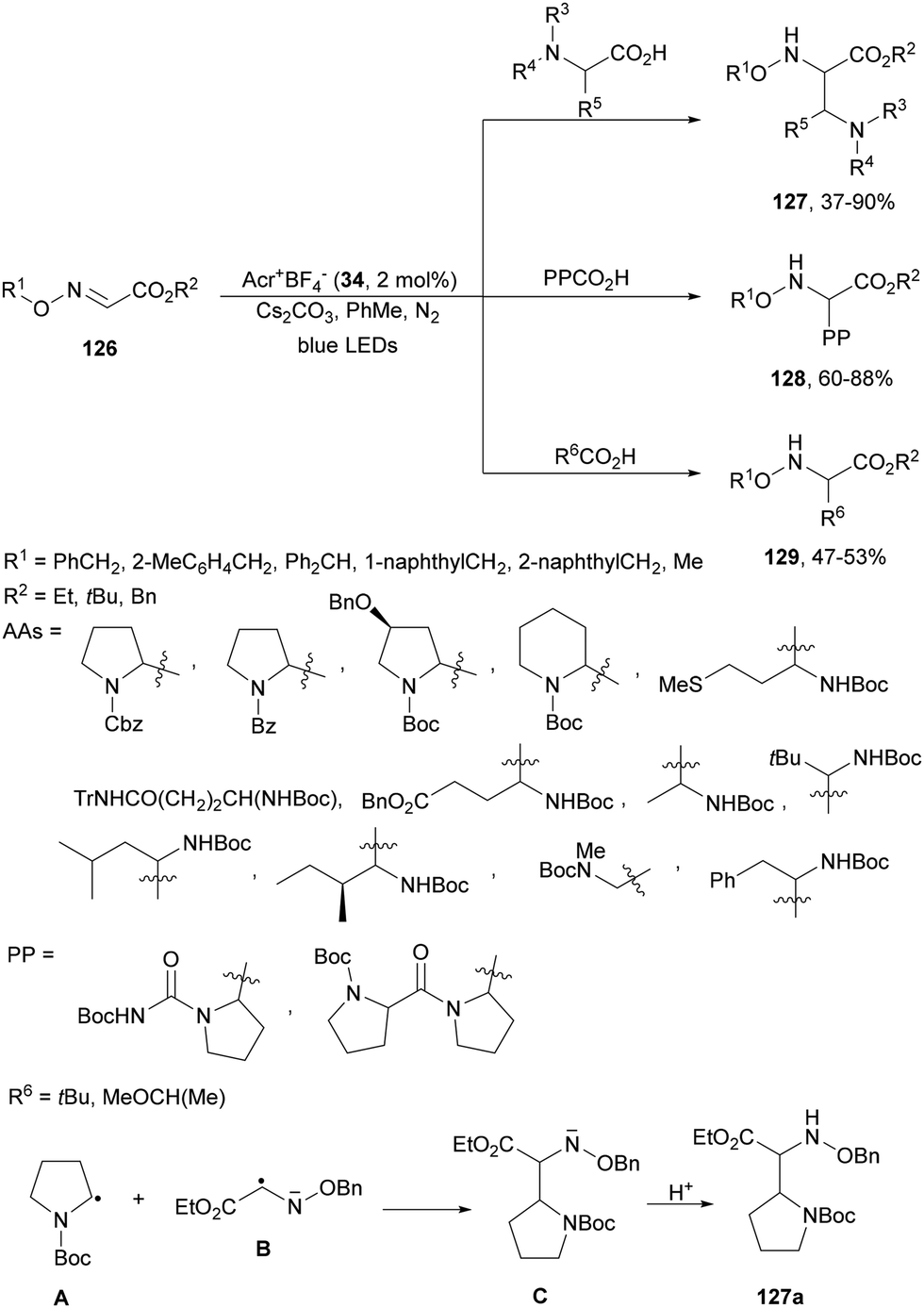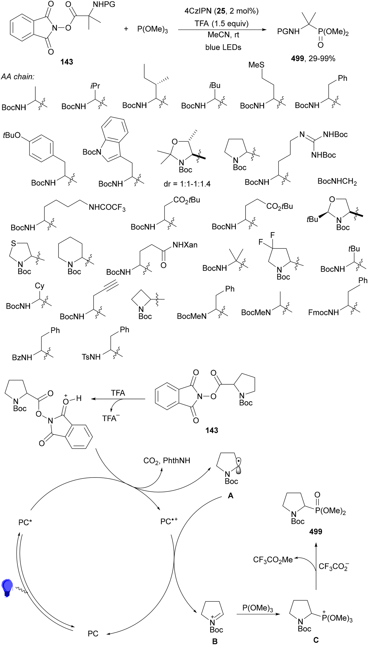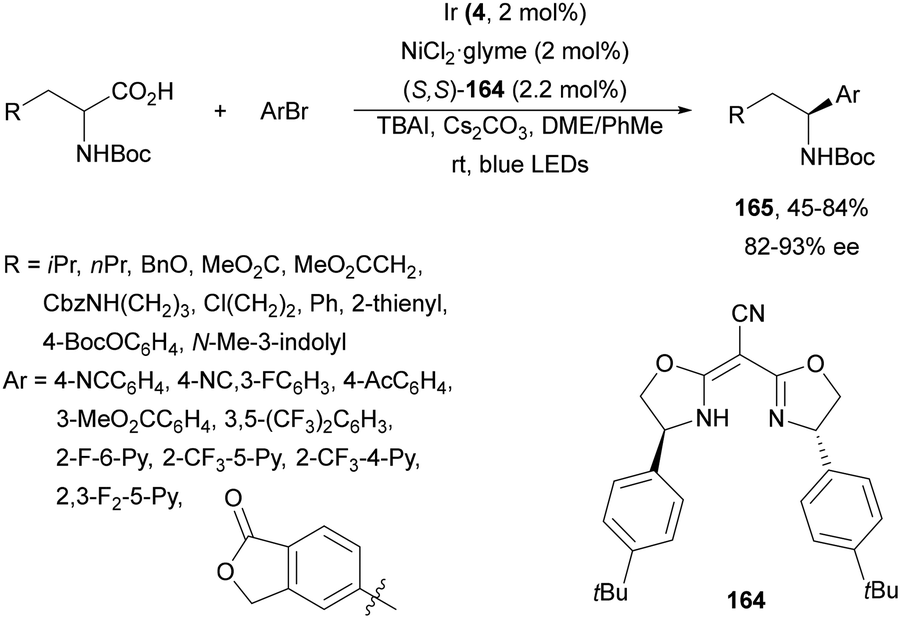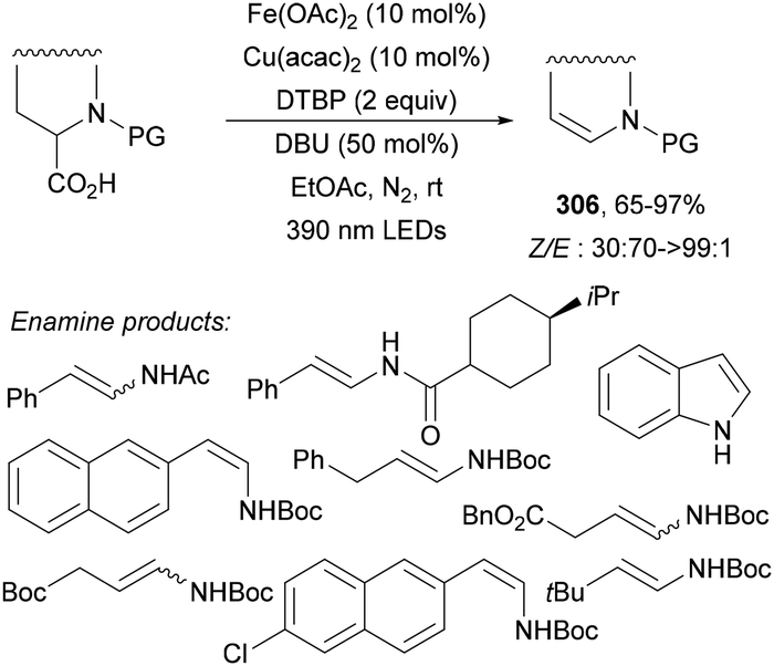 Rueping and co-workers97 have reported the anti-Markovnikov dual catalyzed hydroalkylation of terminal alkynes 81 using N-protected AAs 6 and the Ir complex 83 and NiCl2·glyme as a catalyst under blue LED irradiation. Products 84 were obtained with moderate to complete Z/E diastereoselectivities and yields using Cs2CO3 as a base and a 1
