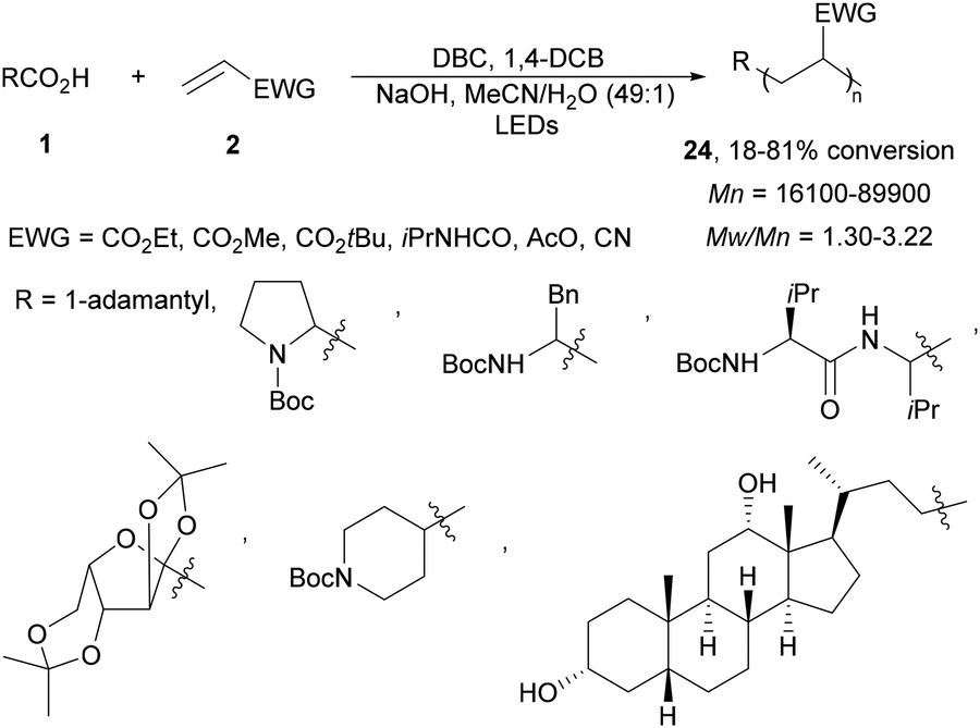 Recently, this photoinduced decarboxylation of carboxylic acids was applied to the radical polymerization under visible light.72 Various carboxylic acids and electron-withdrawing alkenes afforded block copolymers 24 with number-average molecular weight (Mn) and polydispersity (Mw/Mn) depending on both the concentration of ED/EA and the carboxylic acid (Scheme 10).