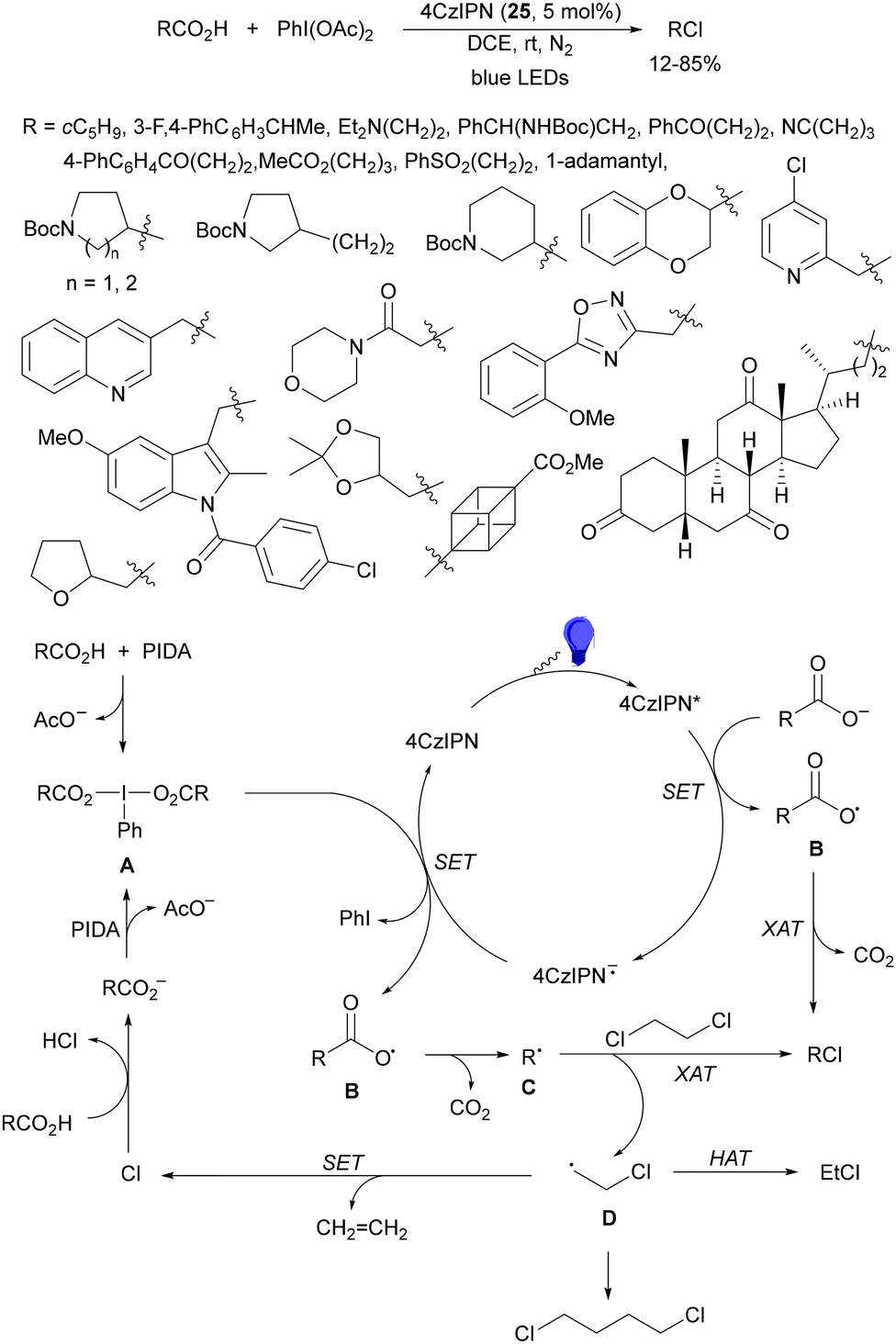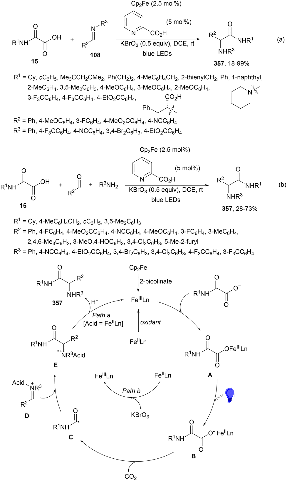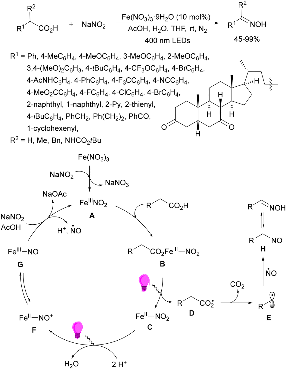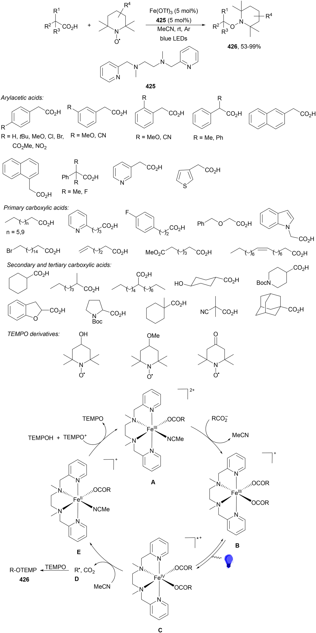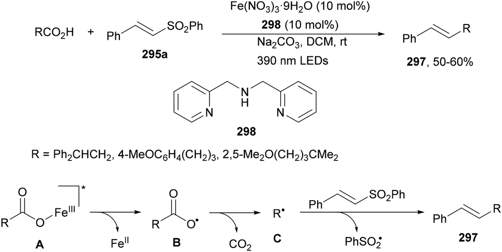 1 dr. In the proposed catalytic cycles, a LMCT process54,55 takes place through the iron complex A, providing similar intermediates to that shown in Scheme 25. Under similar reaction conditions, the Giese reaction of electron-deficient alkenes with aliphatic carboxylic acids using FeCl3 (10 mol%) and DABCO as a base in MeCN at room temperature under 390 nm LED irradiation occurs.