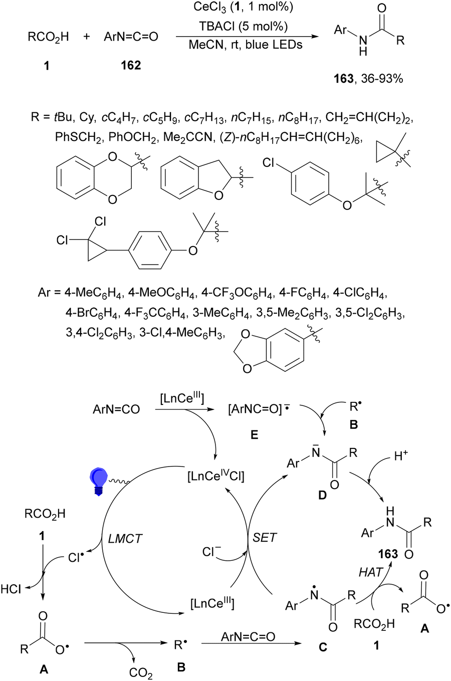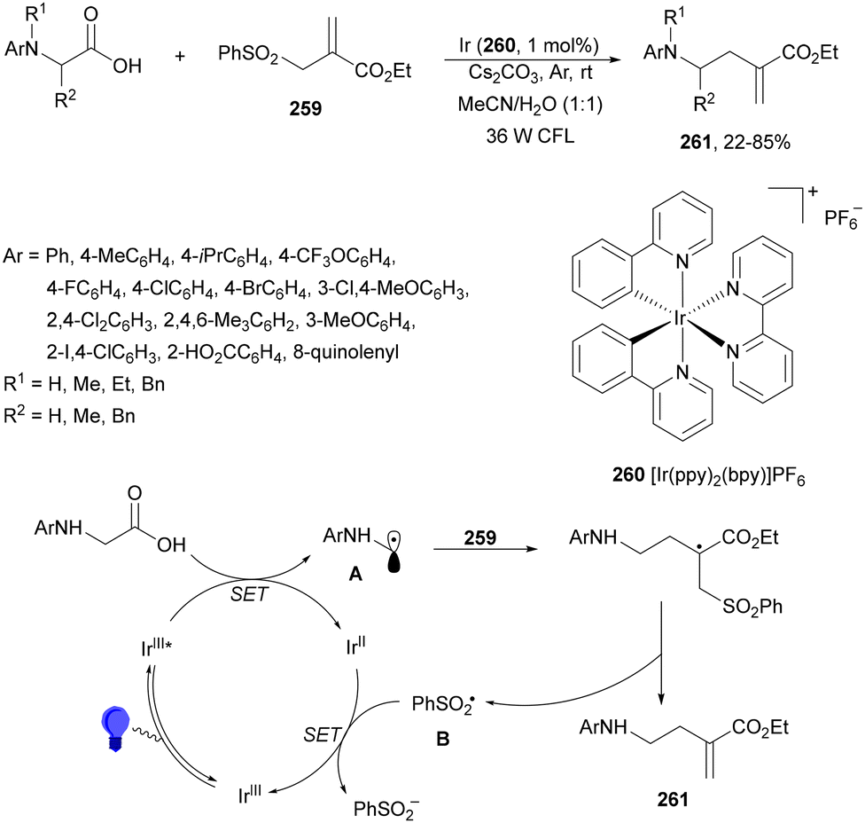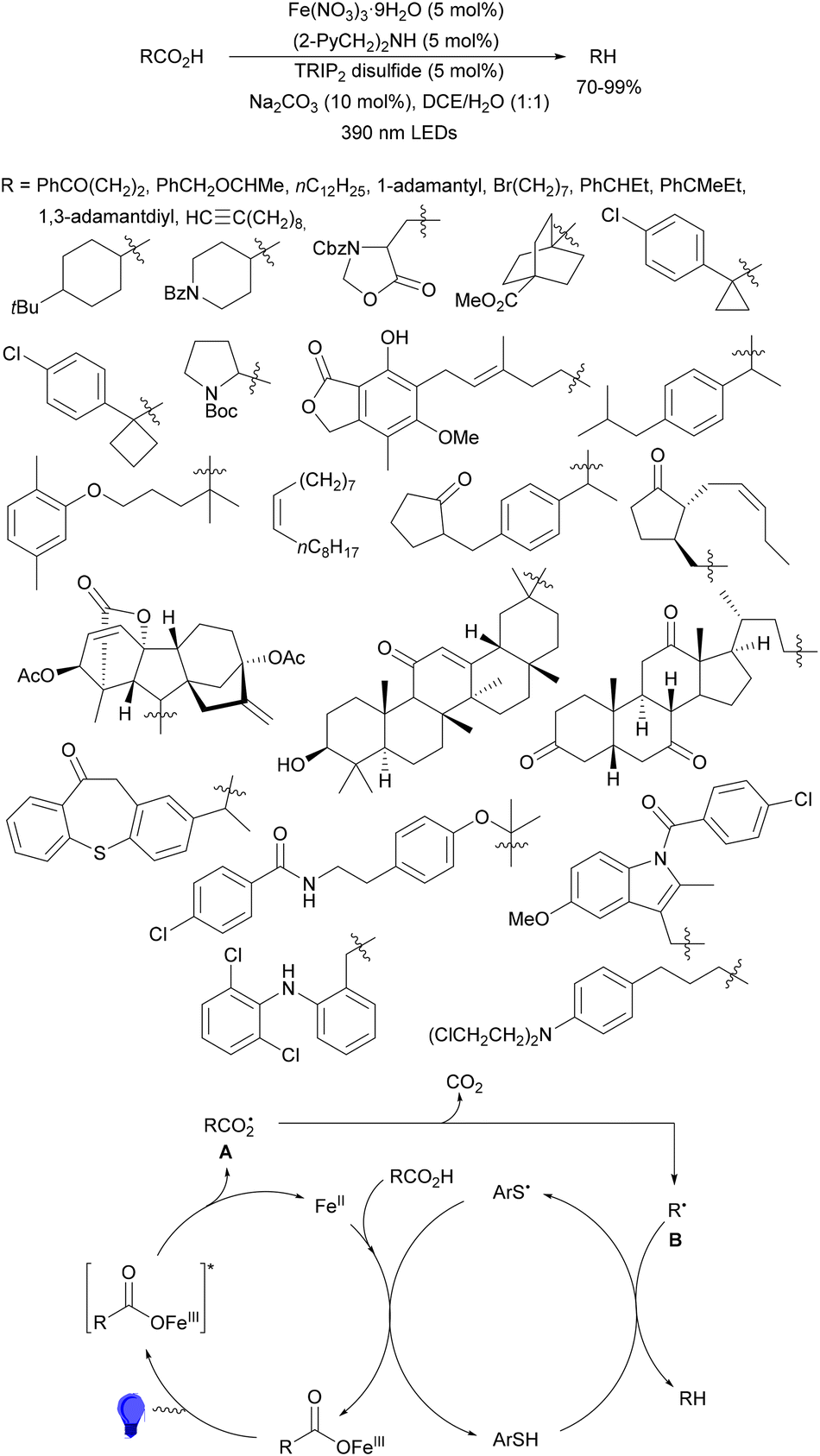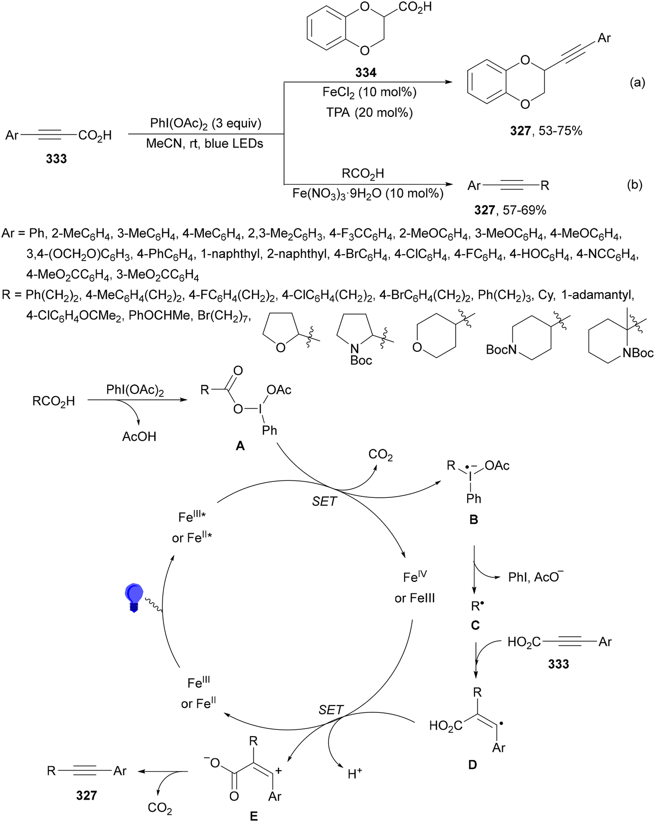 1 dr. In the proposed catalytic cycles, a LMCT process54,55 takes place through the iron complex A, providing similar intermediates to that shown in Scheme 25. Under similar reaction conditions, the Giese reaction of electron-deficient alkenes with aliphatic carboxylic acids using FeCl3 (10 mol%) and DABCO as a base in MeCN at room temperature under 390 nm LED irradiation occurs.