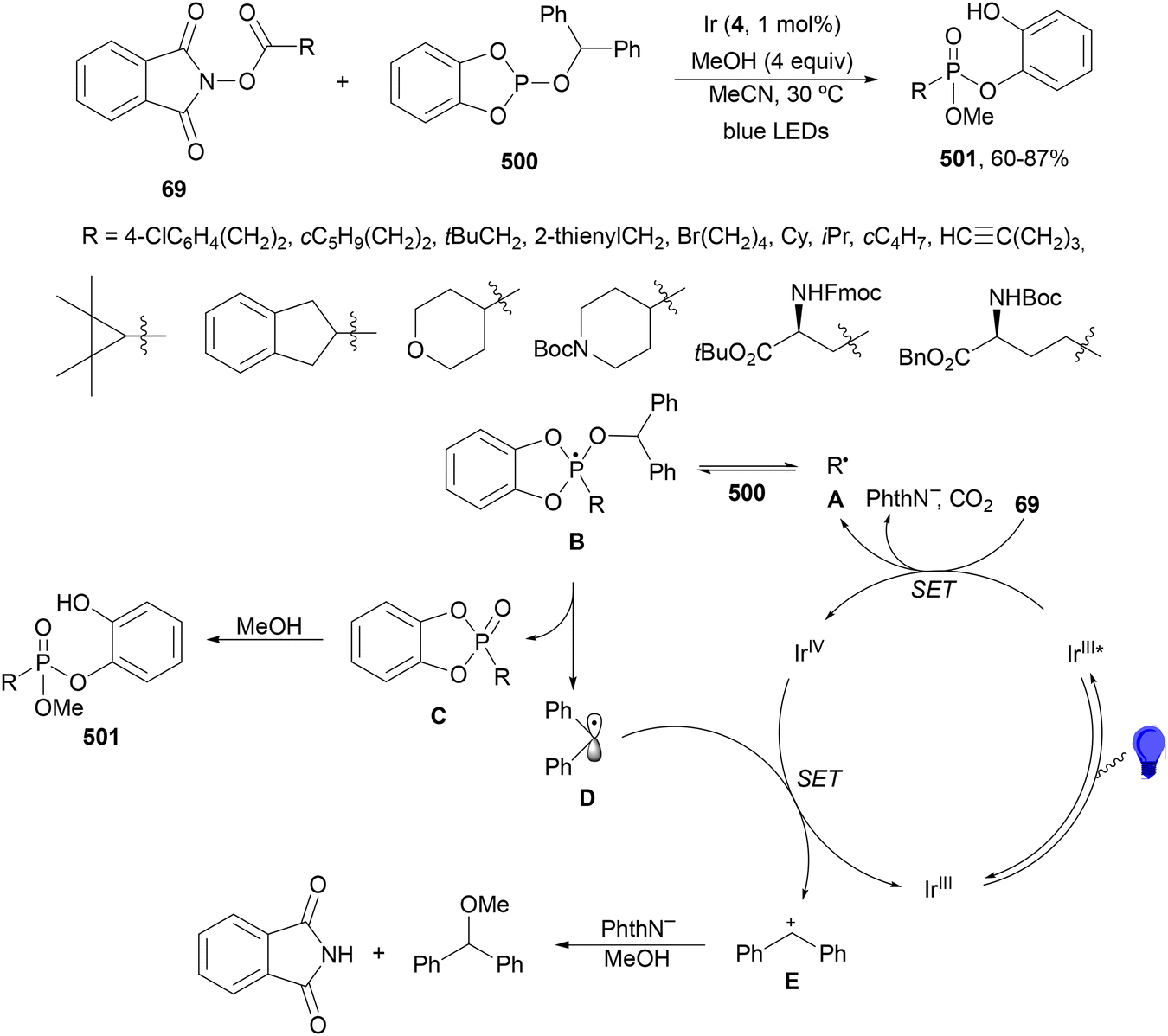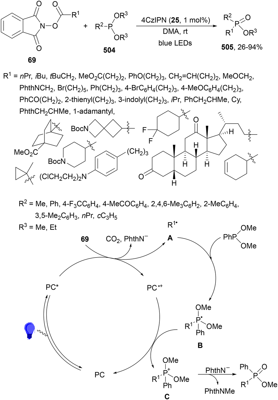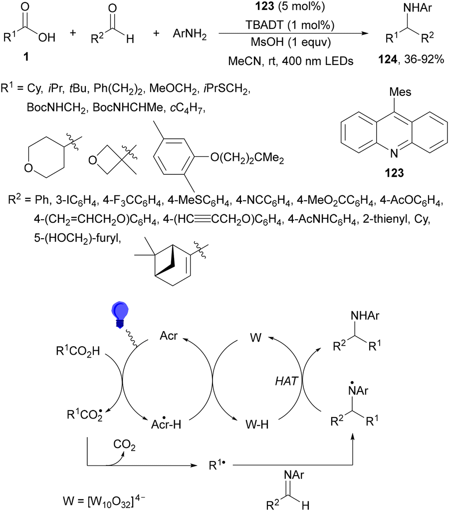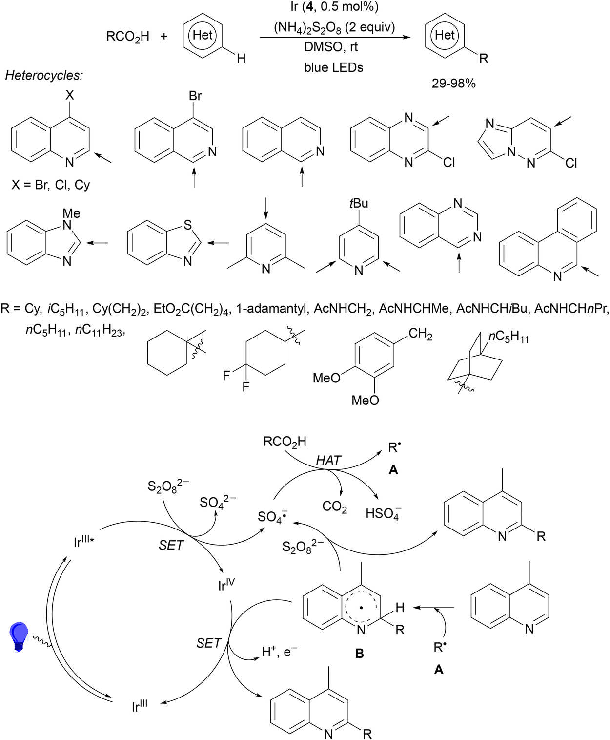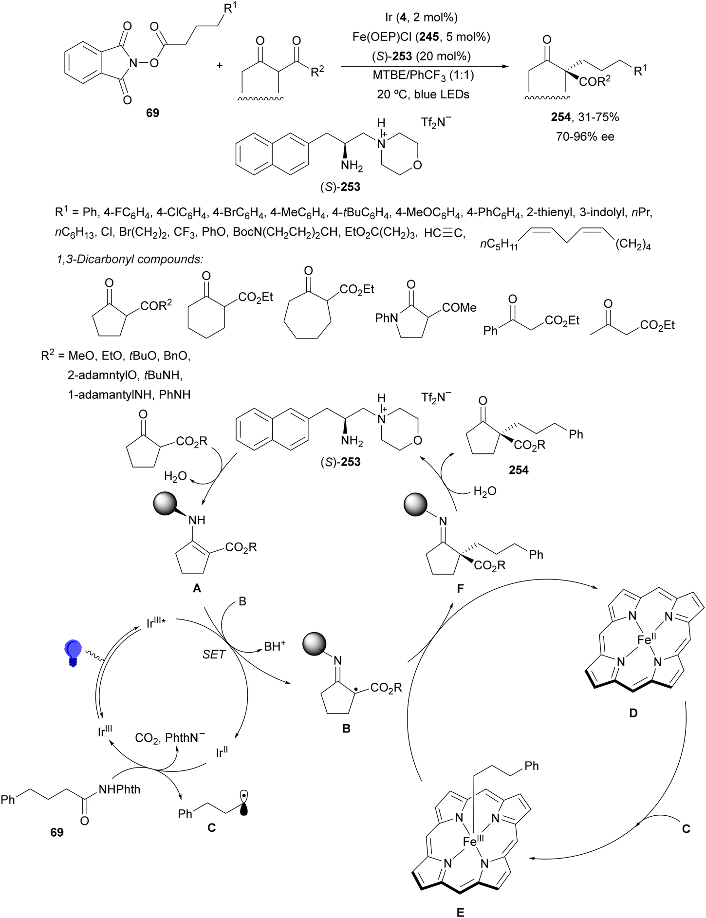 1 dr. In the proposed catalytic cycles, a LMCT process54,55 takes place through the iron complex A, providing similar intermediates to that shown in Scheme 25. Under similar reaction conditions, the Giese reaction of electron-deficient alkenes with aliphatic carboxylic acids using FeCl3 (10 mol%) and DABCO as a base in MeCN at room temperature under 390 nm LED irradiation occurs.