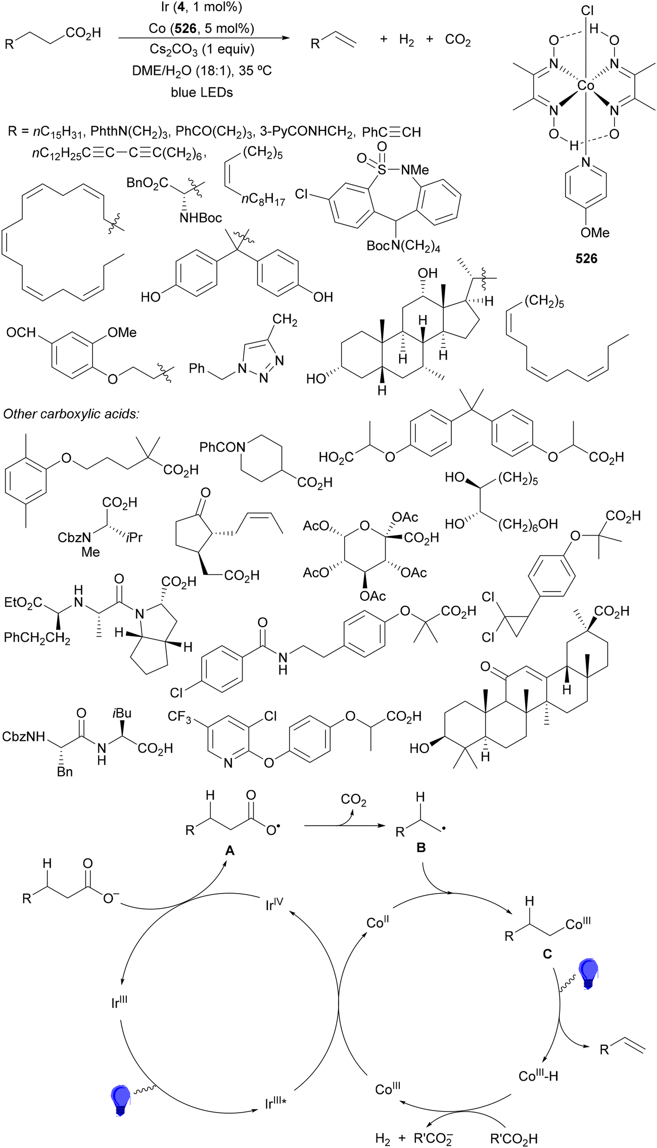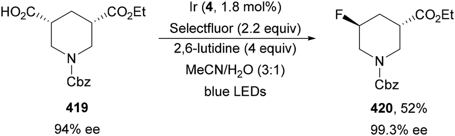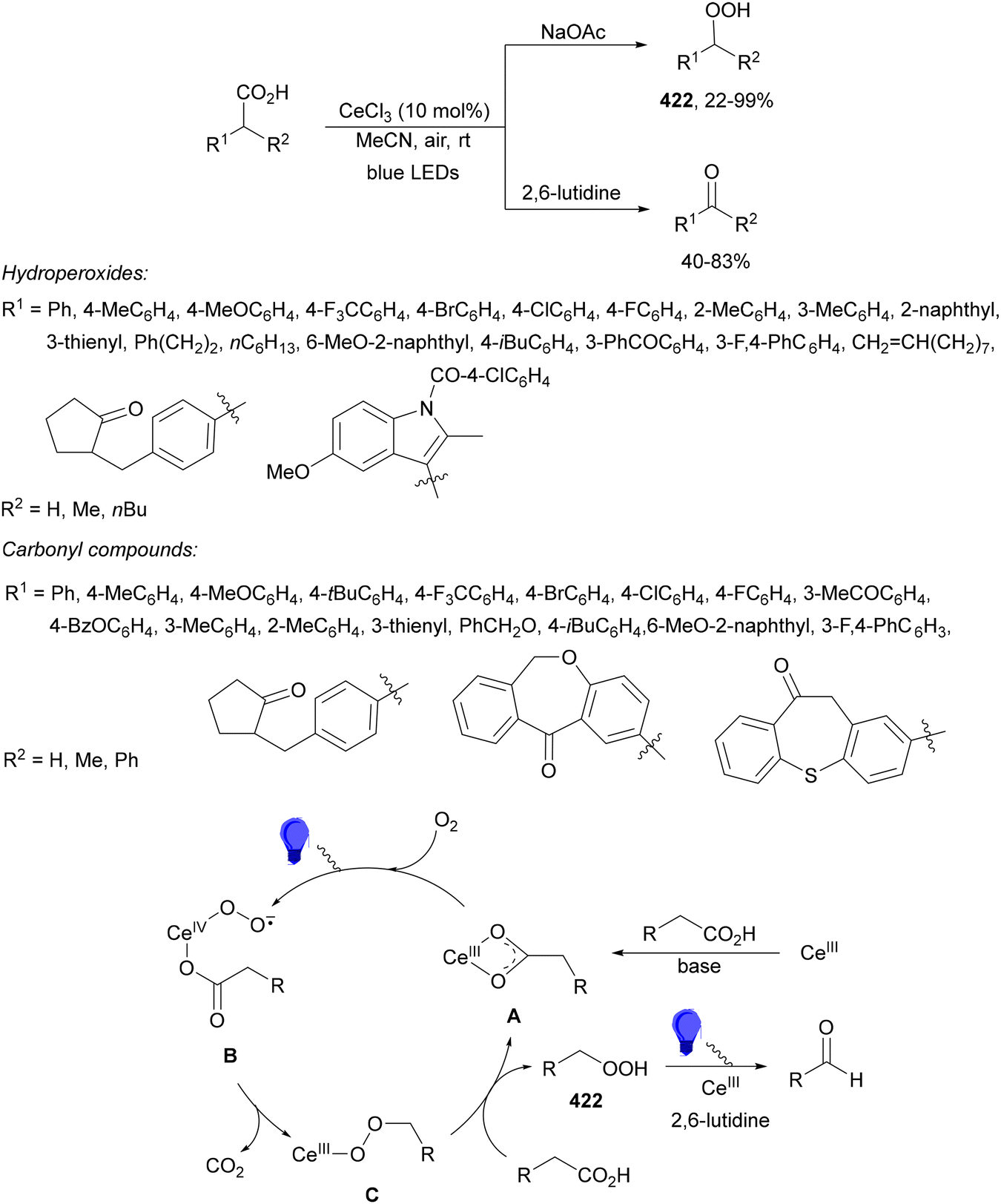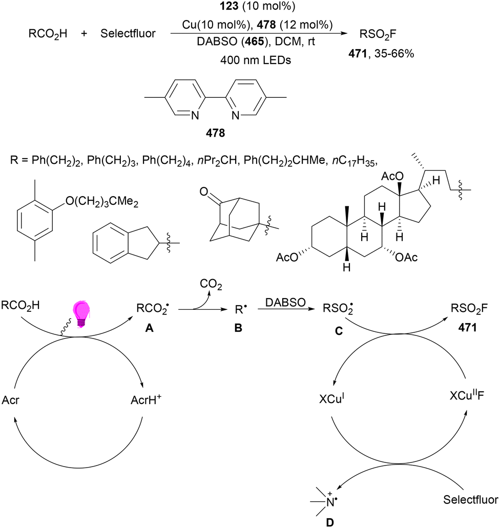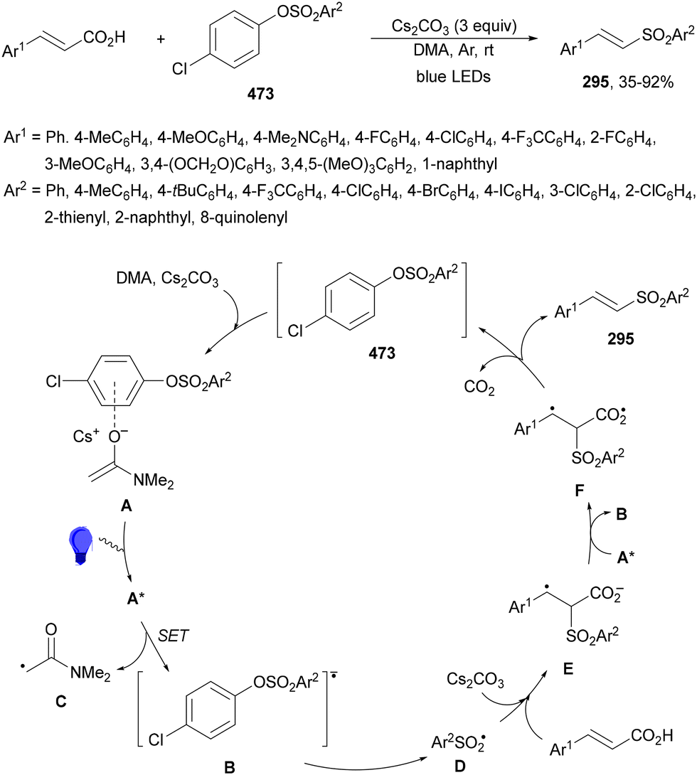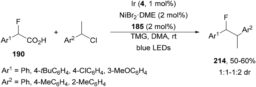 1 dr. In the proposed catalytic cycles, a LMCT process54,55 takes place through the iron complex A, providing similar intermediates to that shown in Scheme 25. Under similar reaction conditions, the Giese reaction of electron-deficient alkenes with aliphatic carboxylic acids using FeCl3 (10 mol%) and DABCO as a base in MeCN at room temperature under 390 nm LED irradiation occurs.