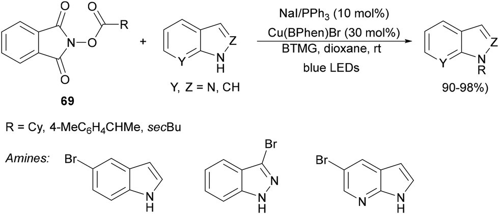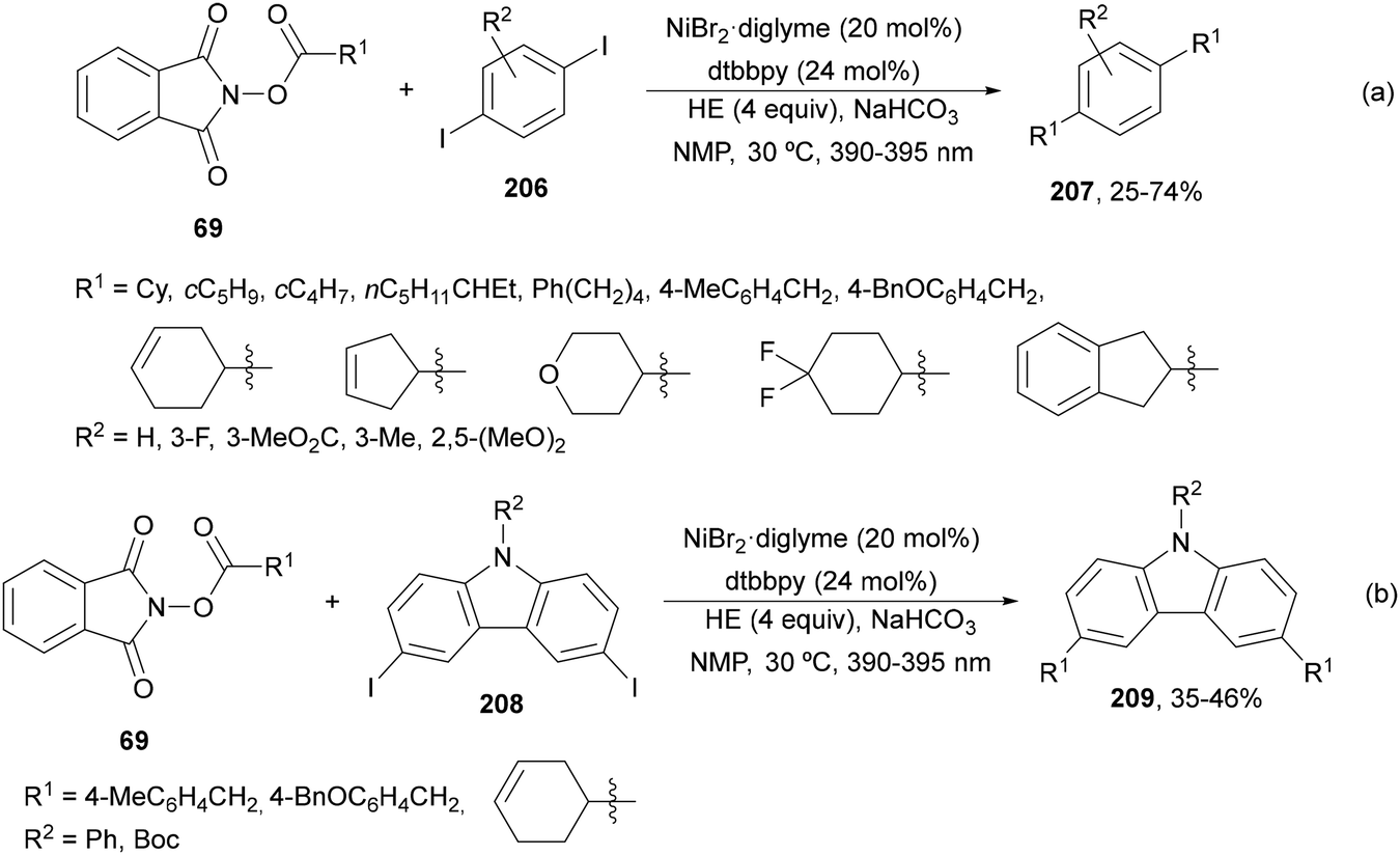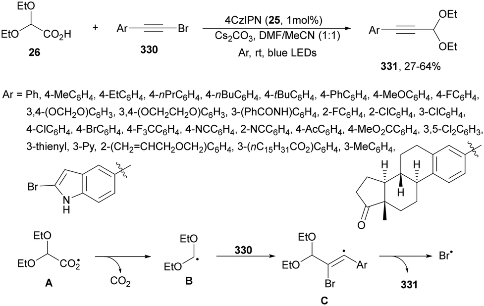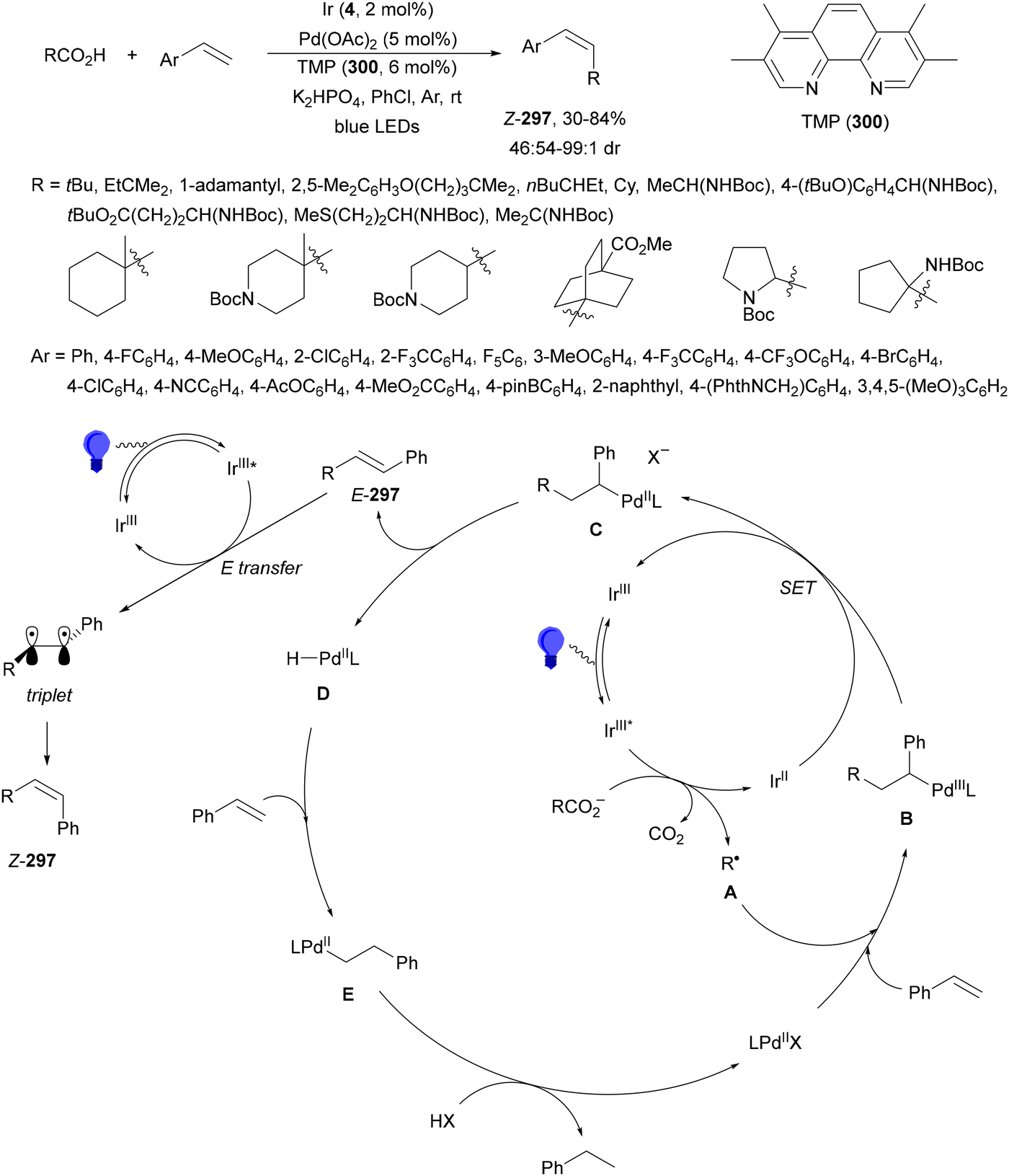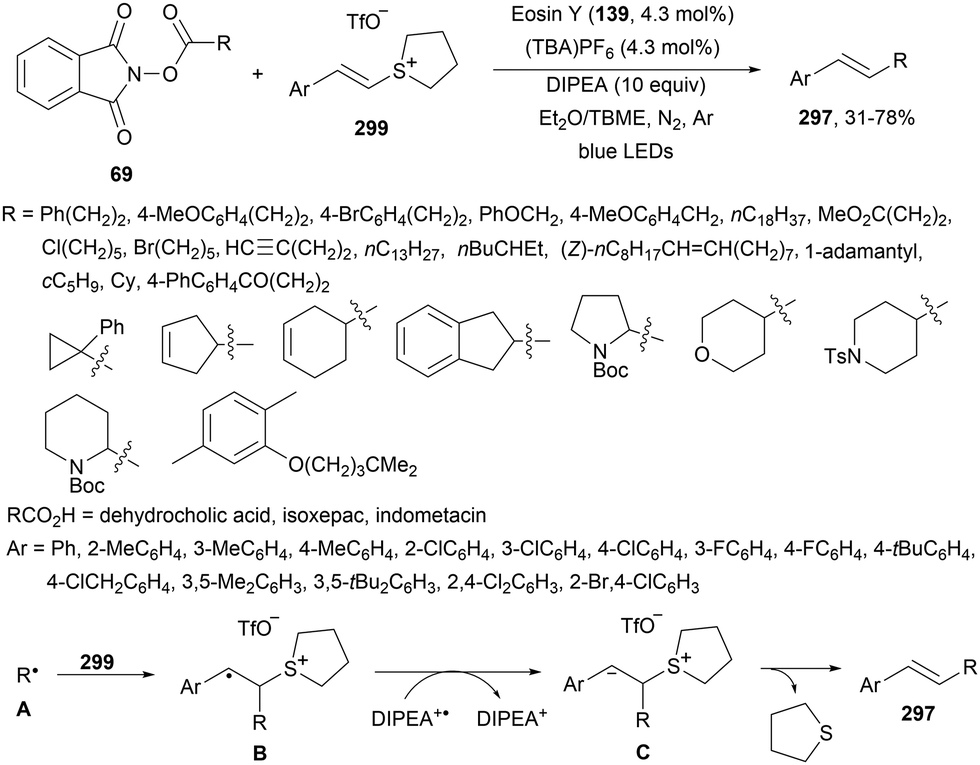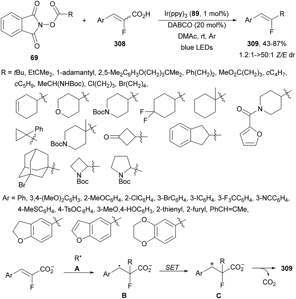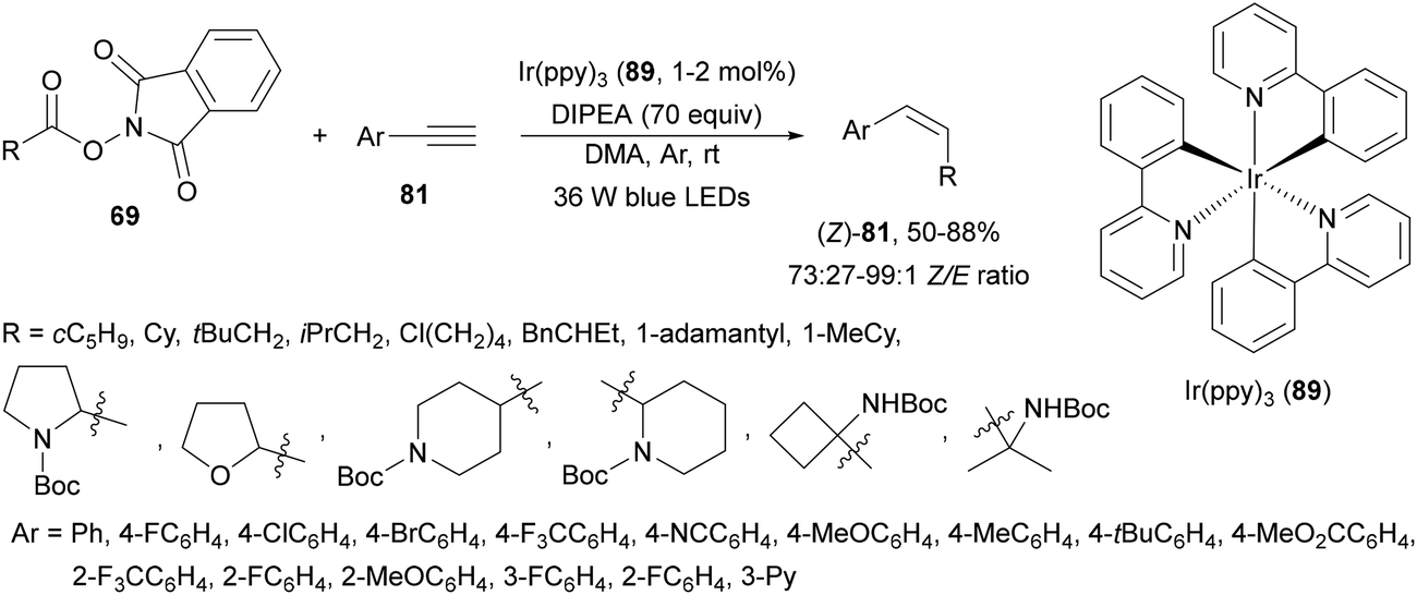 Decarboxylative hydroalkylation of terminal acetylenes 81 using NHPI esters 69 has been performed by Luo, Tang and co-workers100 using an Ir(ppy)3 (89) complex as a photocatalyst and blue LED irradiation. A wide range of primary, secondary and tertiary carboxylate ions as well as α-amino and α-oxy acid-derived esters 69 reacted with terminal arylalkynes 81 to provide alkenes 88 with good yields and Z/E-diastereoselectivities (Scheme 32). This process took place at room temperature under an Ar atmosphere with DIPEA as a base and DMA as solvent without the requirement of metal activation.