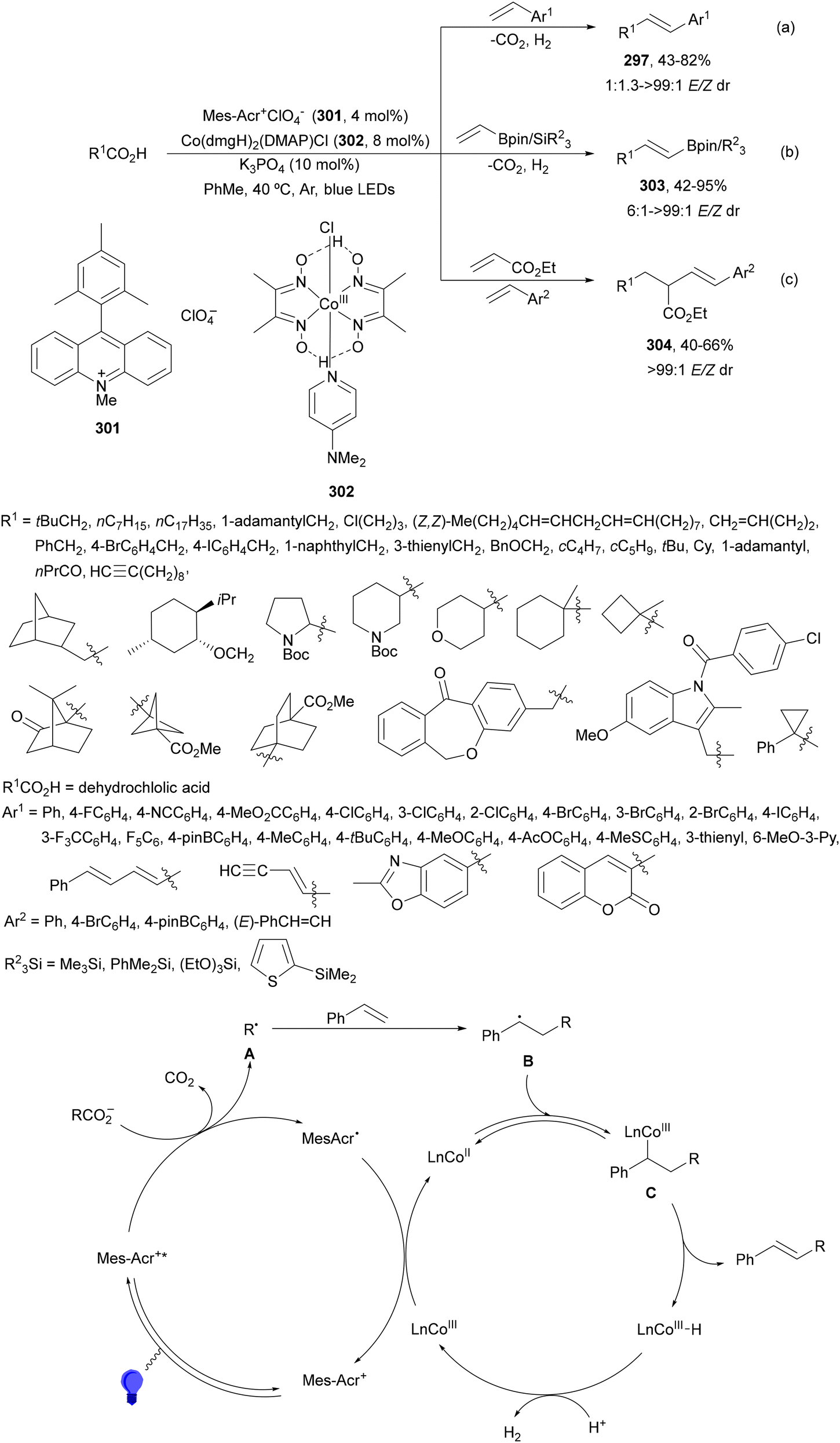 | Scheme 6 Decarboxylative Giese reaction of α-oxo acids 15 with styrenes 2 under cobaloxime 16 and Mes-Acr-Ph+ (17) dual photocatalysis. | ||