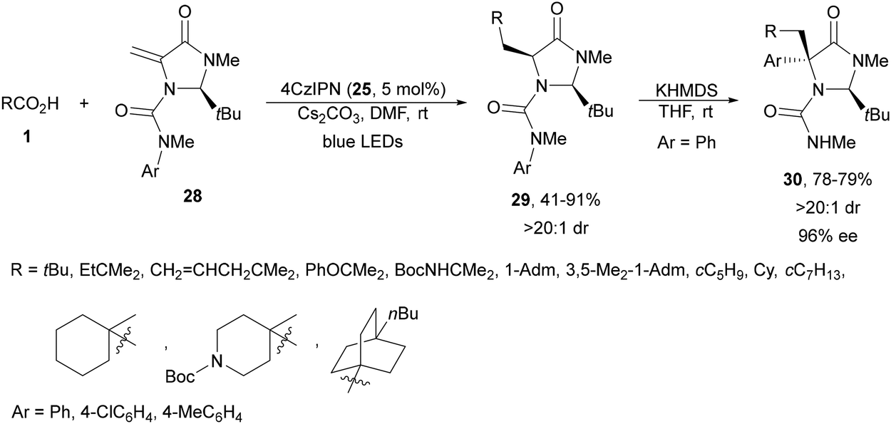 Wang and co-workers77 performed a DGR using carboxylic acids and imidazolidinone-derived dehydroalanines 28 as Michael acceptors. Under irradiation with blue LEDs using 4CzIPN (25) as a PC in the presence of Cs2CO3 as a base in DMF at room temperature, products 29 were isolated with good yields (Scheme 12). These compounds 29 were subjected to a Clayden rearrangement78,79 to deliver products 30 as precursors of chiral quaternary α-aryl amino acid derivatives with high diastereoselectivity via memory of chirality.