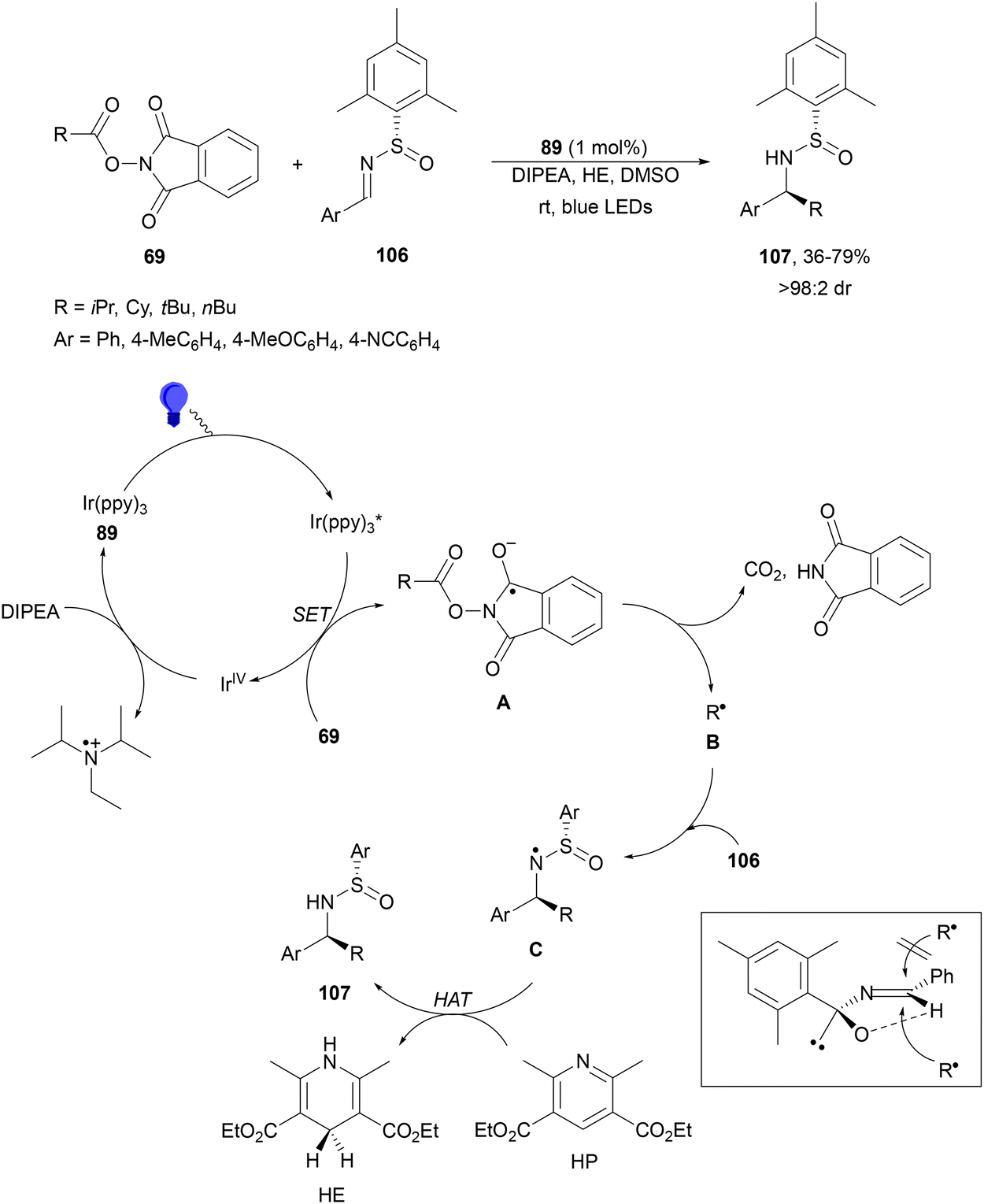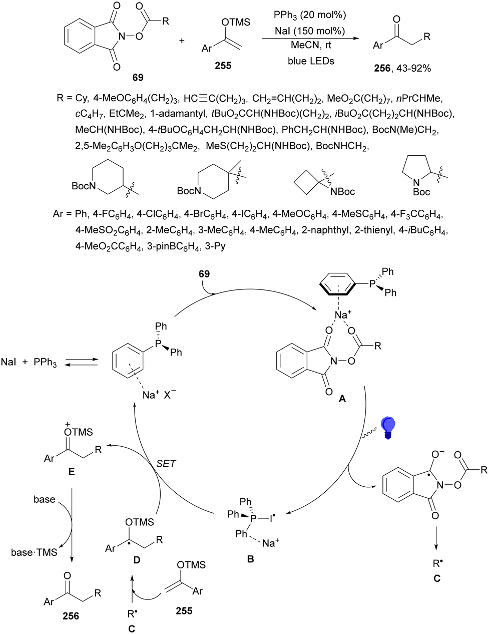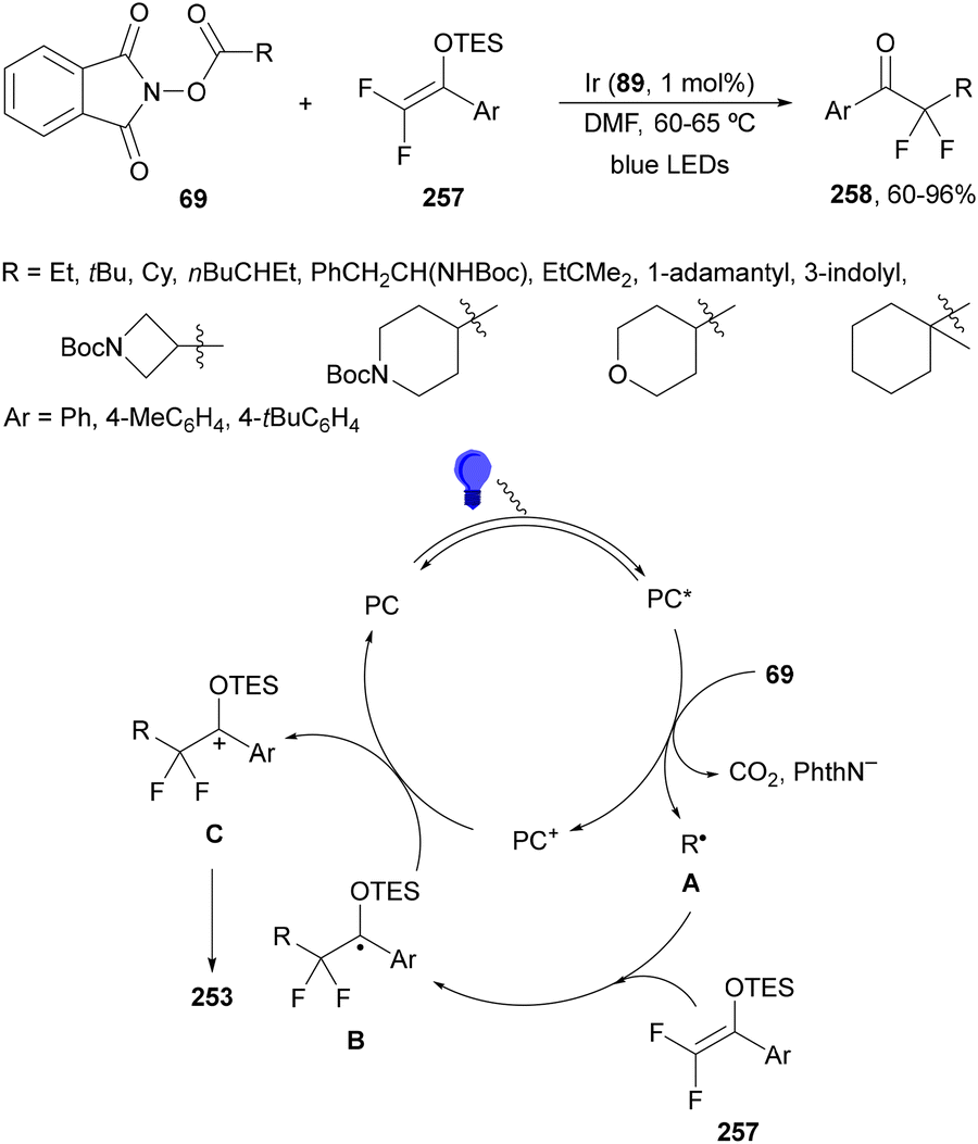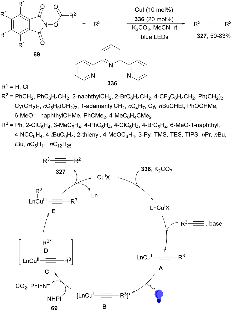 | Scheme 32 Decarboxylative alkylation of terminal arylalkynes 81 with NHPI esters 69 using Ir complex 89 as a photocatalyst. | ||