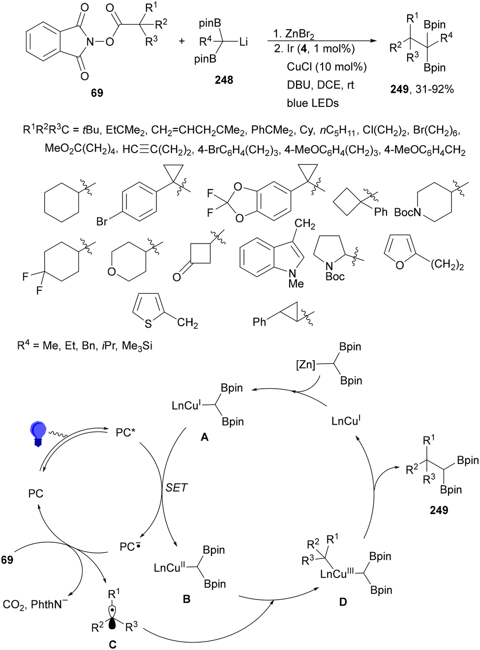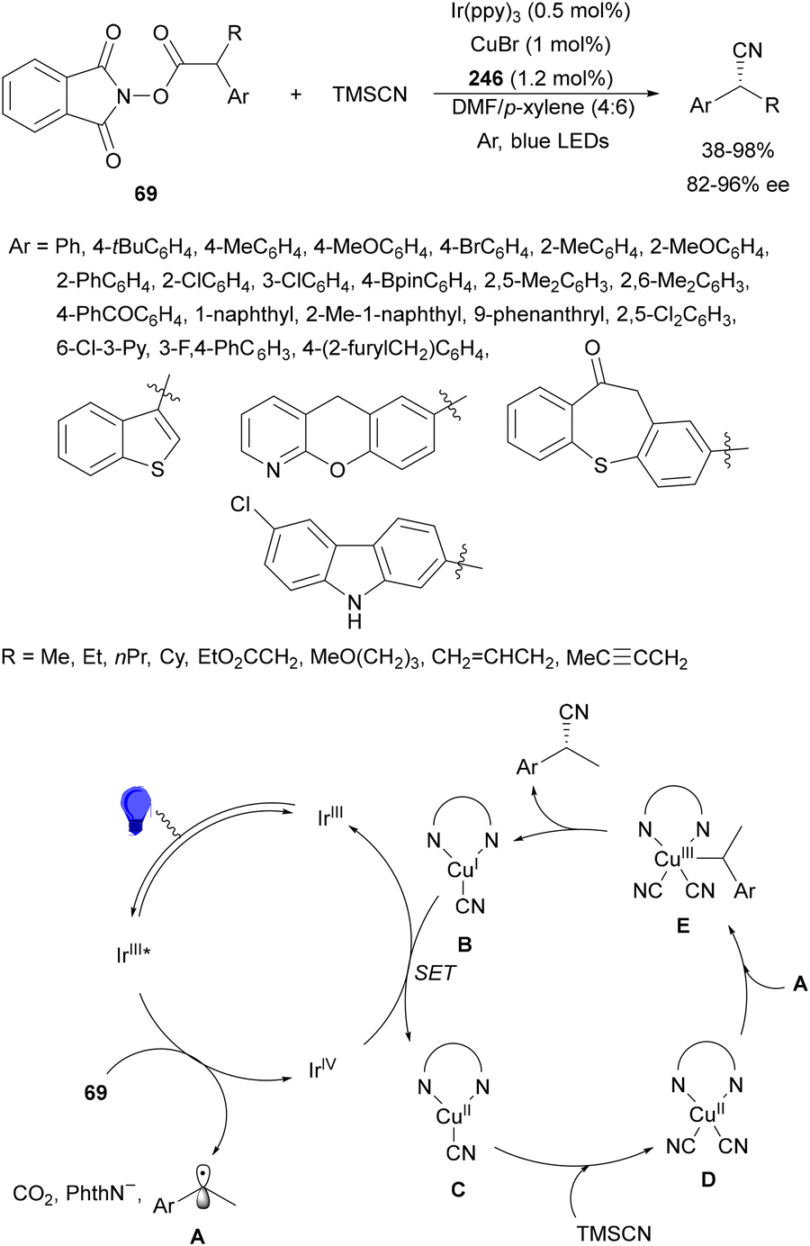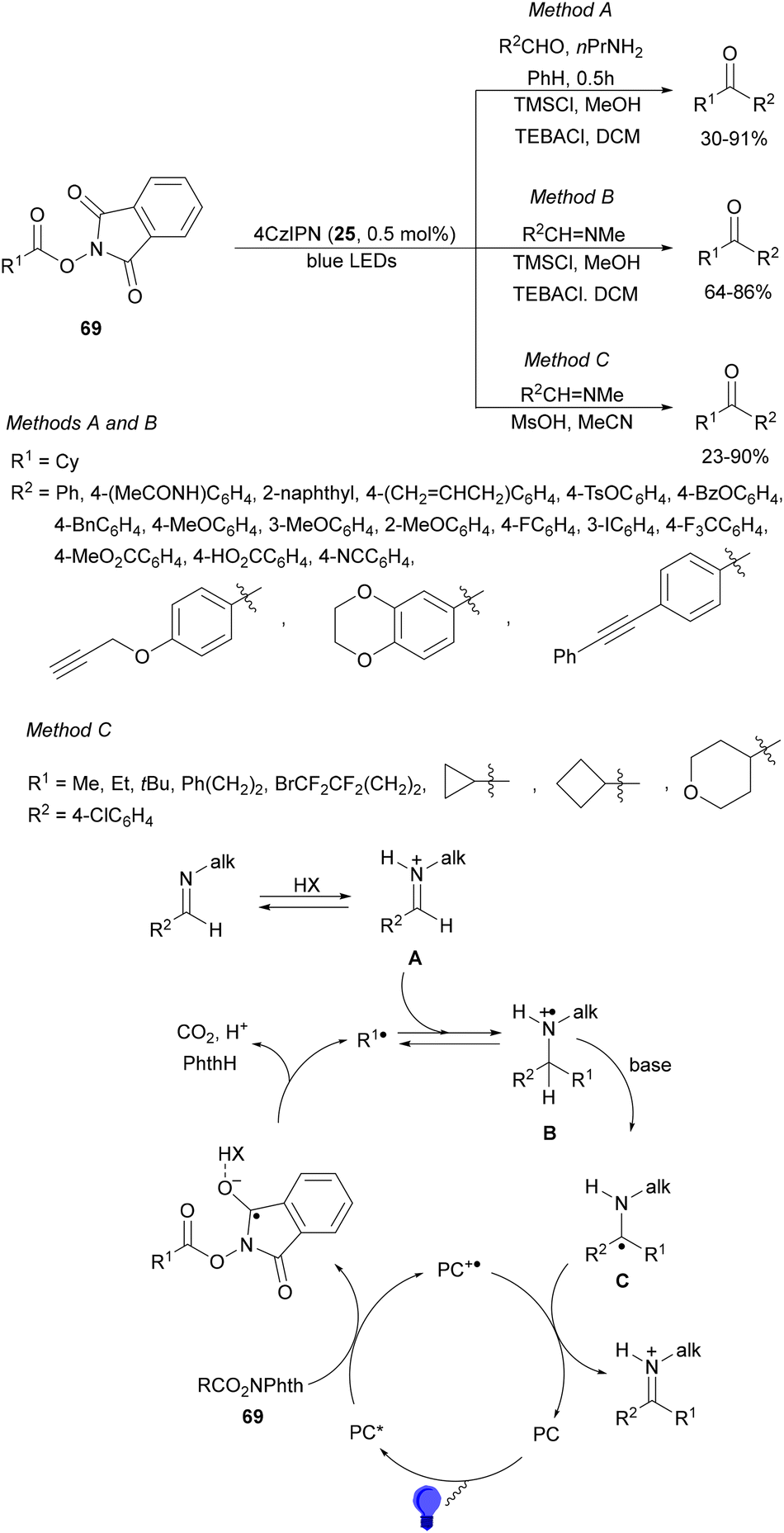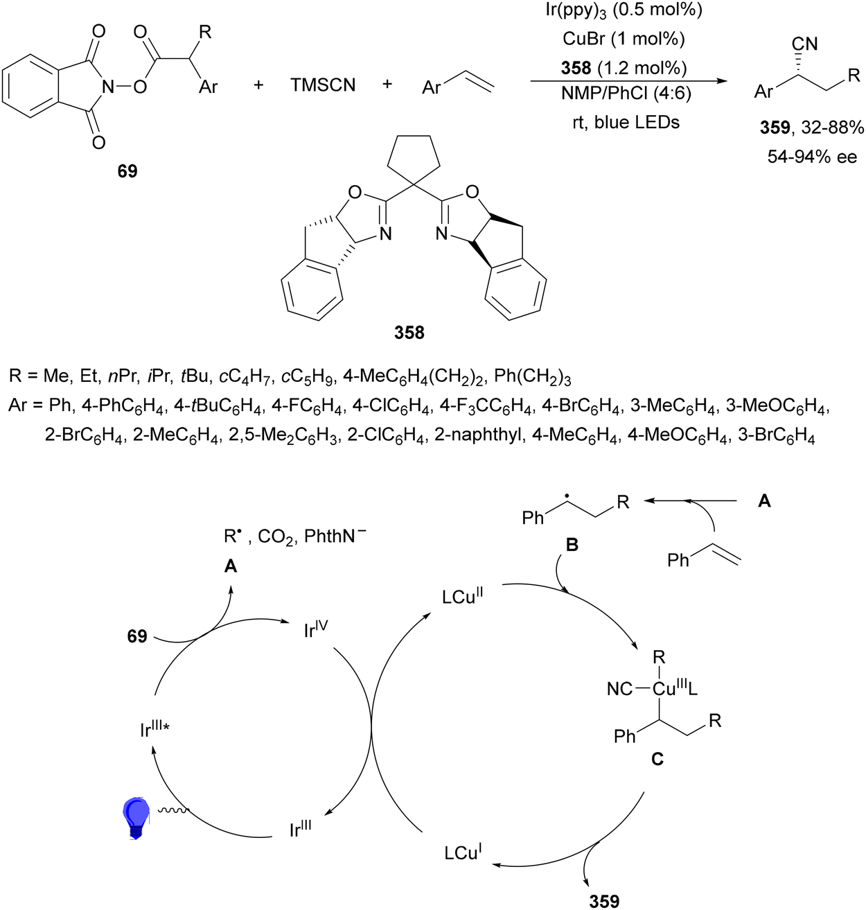 | Scheme 32 Decarboxylative alkylation of terminal arylalkynes 81 with NHPI esters 69 using Ir complex 89 as a photocatalyst. | ||