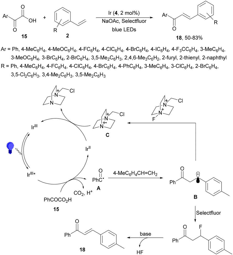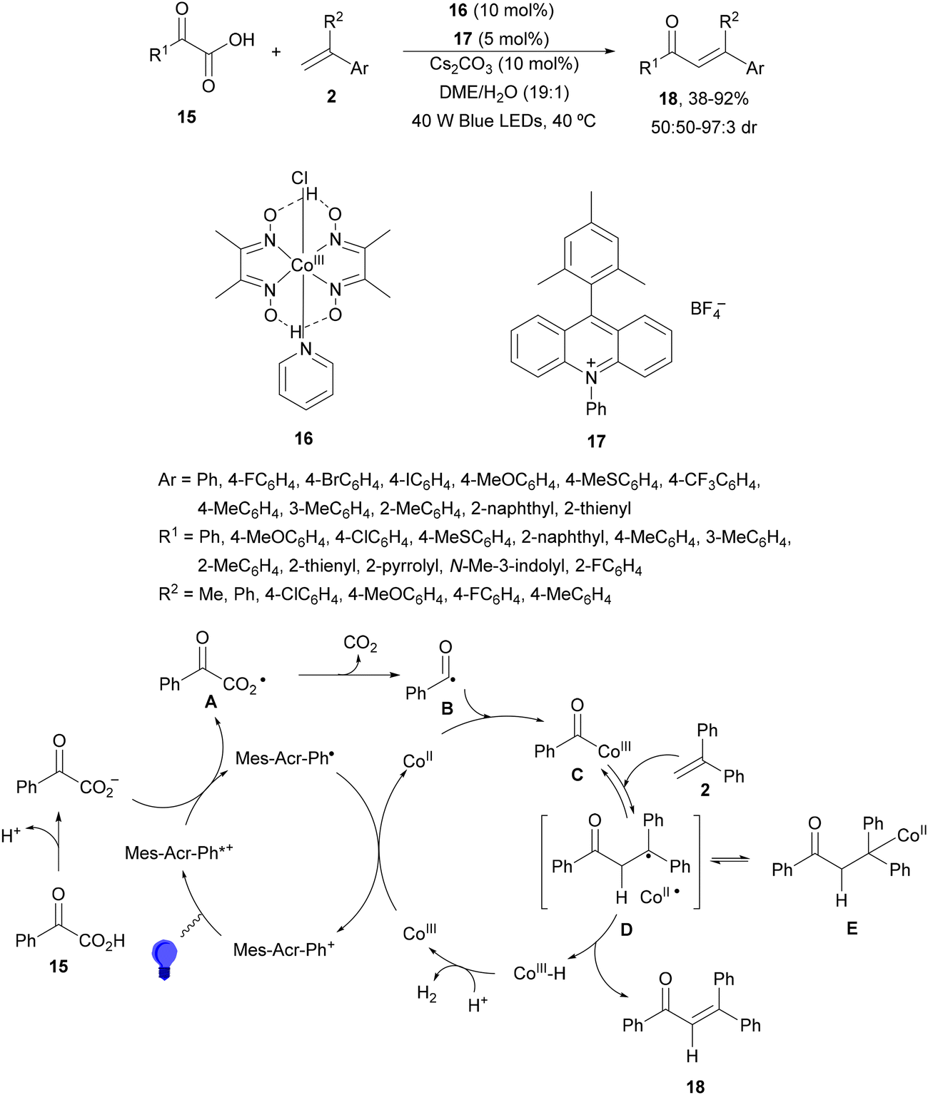 Decarboxylative 1,4-addition of α-oxo carboxylic acids to α,β-unsaturated carbonyl compounds gives the corresponding 1,4-dicarbonyl compound derivatives by intermediacy of acyl radicals. Ir-derived complexes have been mainly used as metallaphotocatalysts.60–62 Recently, Tunge and co-workers63 reported the aroylation of alkenes 2 with α-keto acids 15 using cobaloxime 16 and organophotocatalyst 17 (Mes-Acr-Ph+) as a cooperative catalyst. This method allowed access to chalcone cores 18 in moderate to good yields and diastereoselectivities (Scheme 6). In the proposed mechanism photocatalyst (PC) 17 gave upon irradiation Mes-Acr-Ph+* [E1/2 (PC*/PC) = +2.17 V]. A SET from the deprotonated α-keto acid would generate the carboxy radical intermediate A, which after decarboxylation afforded acyl radicals B. The reduced PC Mes-Acr-Ph˙ can be oxidized by the Co(III) catalyst to close the catalytic cycle. The generated Co(II) species would react with the acyl radical B to give intermediate C, which undergoes a radical addition with 2 forming intermediate D. Homolytic cleavage of the Co–C bond results in a Co(II) species E. Final hydrogen atom transfer provides product 18 and Co(III)–H, which can react with a proton from another molecule of α-keto acid 15 to evolve H2 gas and return Co to its catalytic cycle.