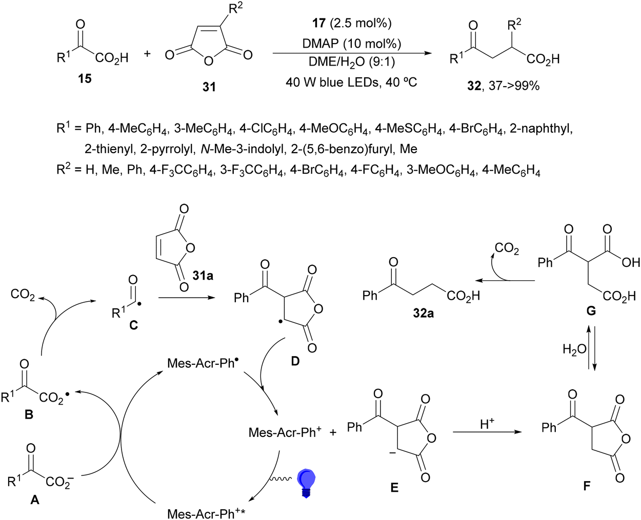 Ionic photocatalysts such as acridinium salts15,51,64 are excellent alternatives to metal-based PCs, because of high oxidative and reducing power and more favorable electron-transfer between the ED and the PC excited state than metallacatalysts. A recent work of Tunge and co-workers80 employed 9-mesityl-10-phenylacridinium tetrafluoroborate (17) as a PC for the DGR of α-keto acids 15 with maleic anhydrides 31 as traceless synthons of acrylic acid (Scheme 13). A dual decarboxylative procedure resulted in γ-keto acids 32 in good yields working with 4-dimethylaminopyridine (DMAP) as a base in aqueous dimethoxyethane (DME) and 40 W blue LED irradiation at −40 °C. This process can be carried out for instance in aqueous methanol as solvent to obtain the corresponding methyl γ-keto esters. On the other hand, when acrylic acid or maleic acid 31a was used as a Michael acceptor the resulting products 32 were obtained in low yields. In the general proposed mechanism, Mes-Acr-Ph+ is excited to Mes-Acr-Ph+*, which after a SET from the carboxylate ion A generates the carboxy radical B intermediate. Subsequent decarboxylation of B gives the acyl radical C, which undergoes Giese addition into the maleic anhydride generating intermediate D. The reduced PC will return to its ground state via a SET process to D affording enolate E. Protonation of E by a new molecule of α-keto acid and subsequent hydrolysis of the maleic anhydride F unit gives intermediate G, which undergoes decarboxylation to furnish the γ-keto acid 32a.