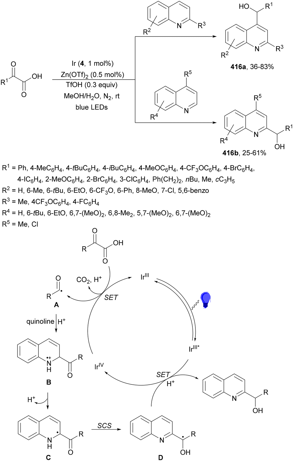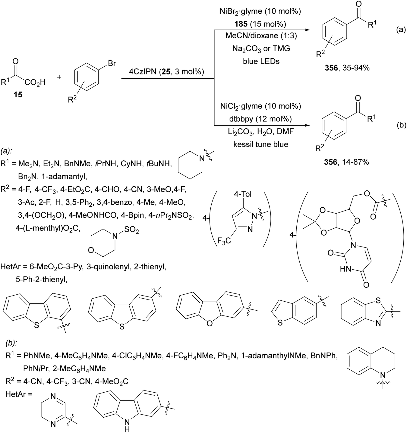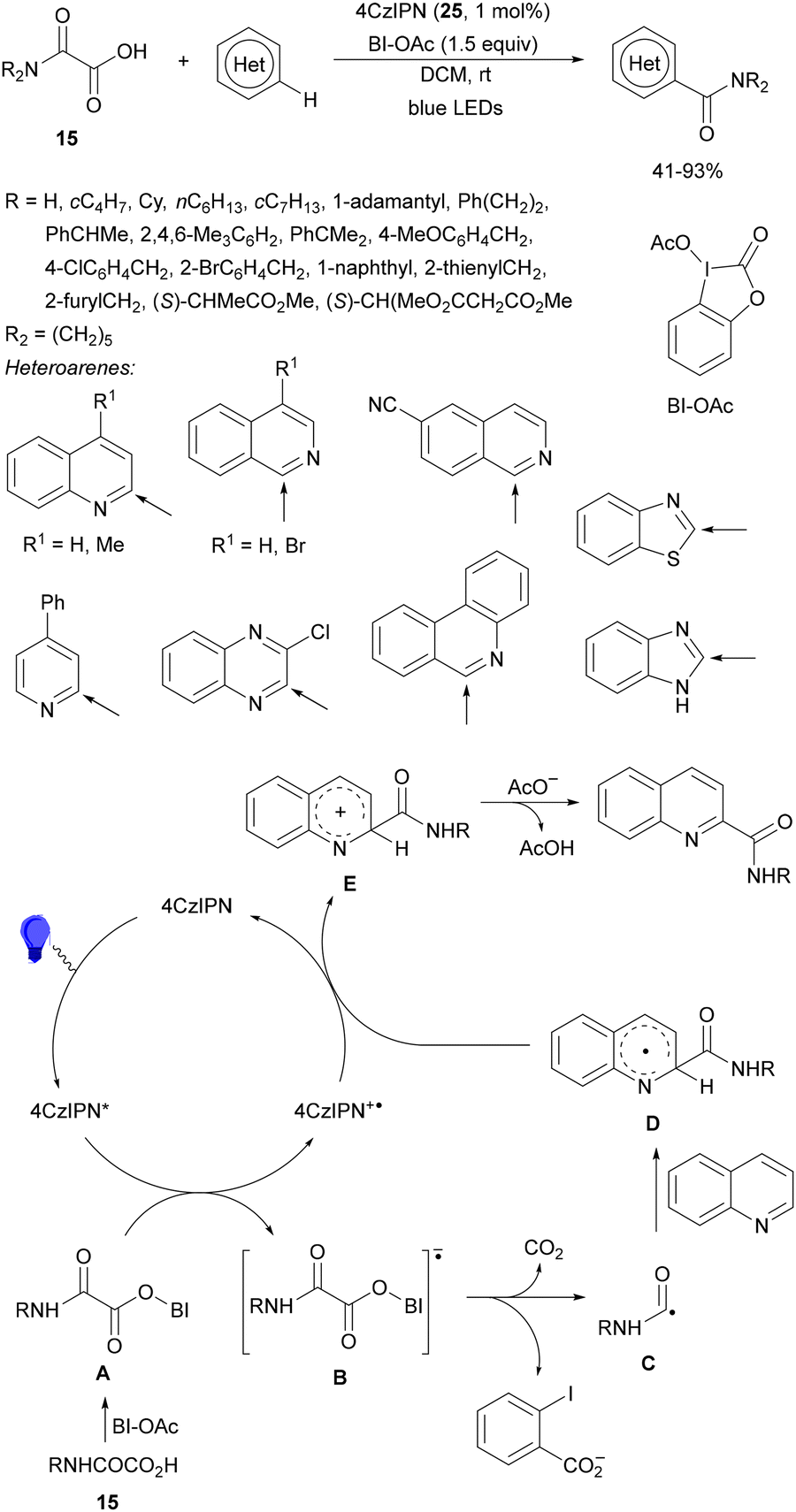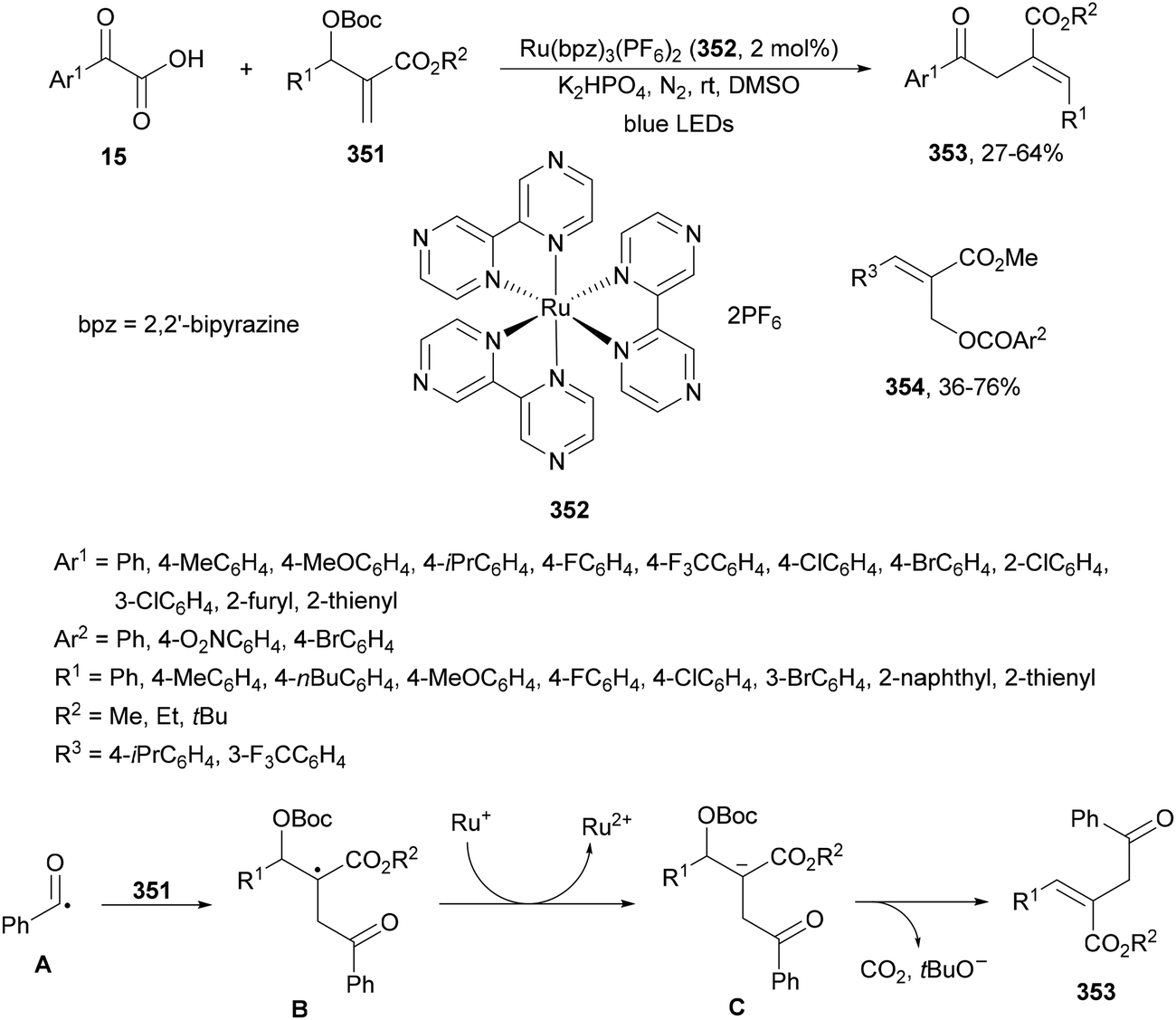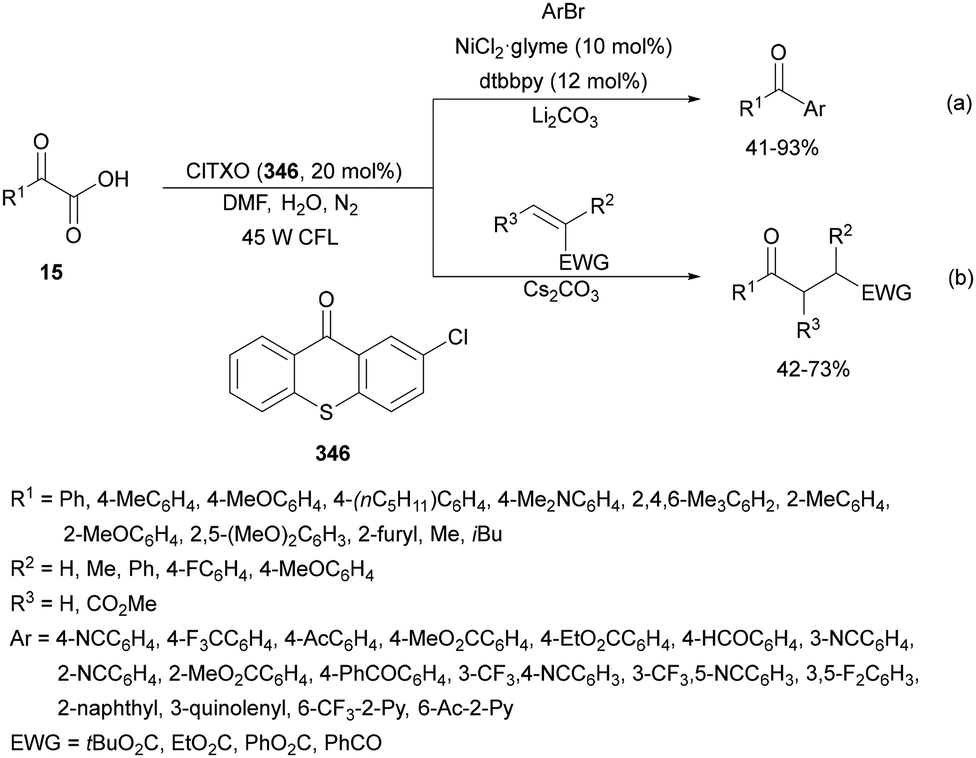 | Scheme 15 Light-mediated DGR of α-keto acids 15 and Michael acceptors under oxidative conditions without a photocatalyst. | ||