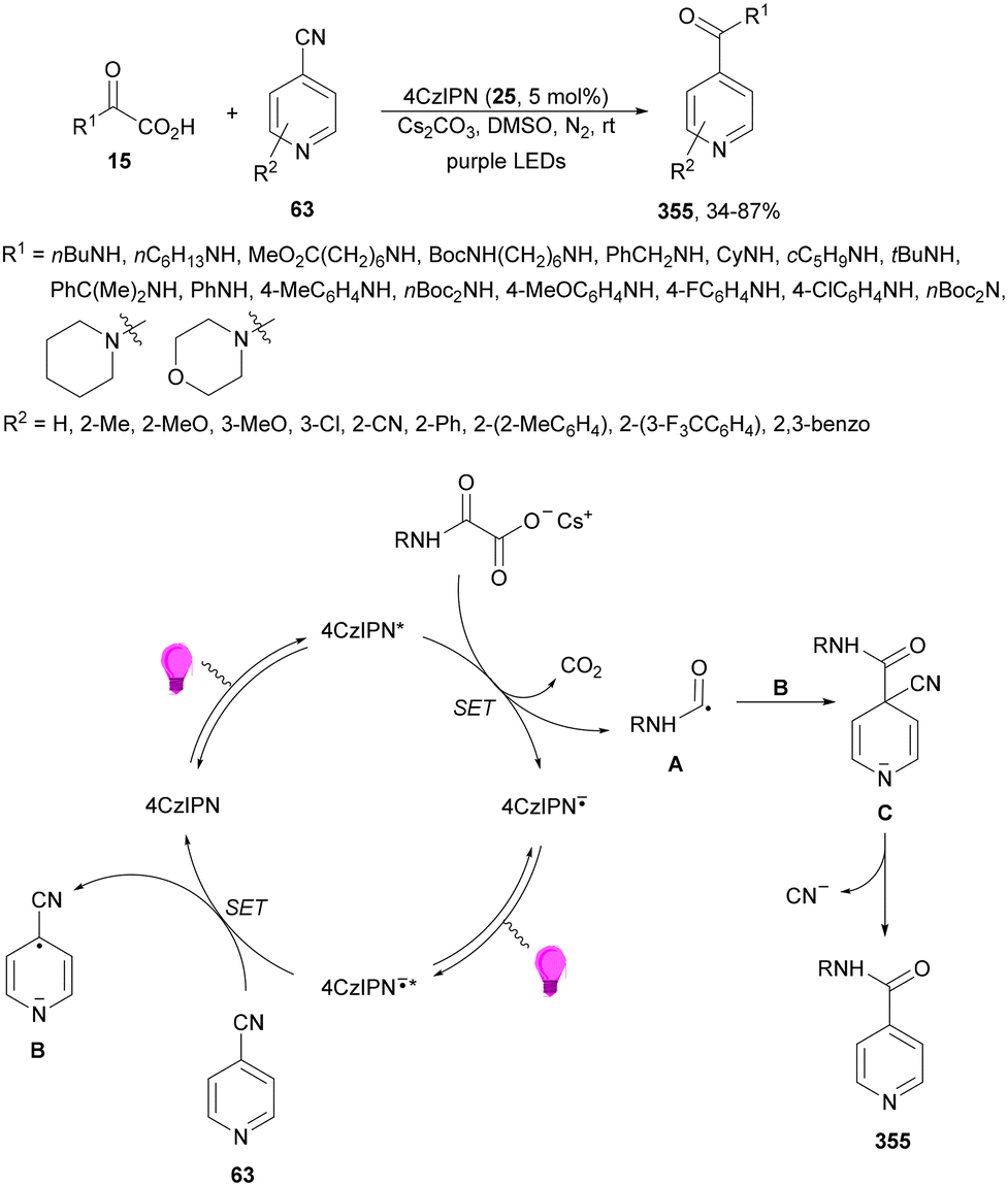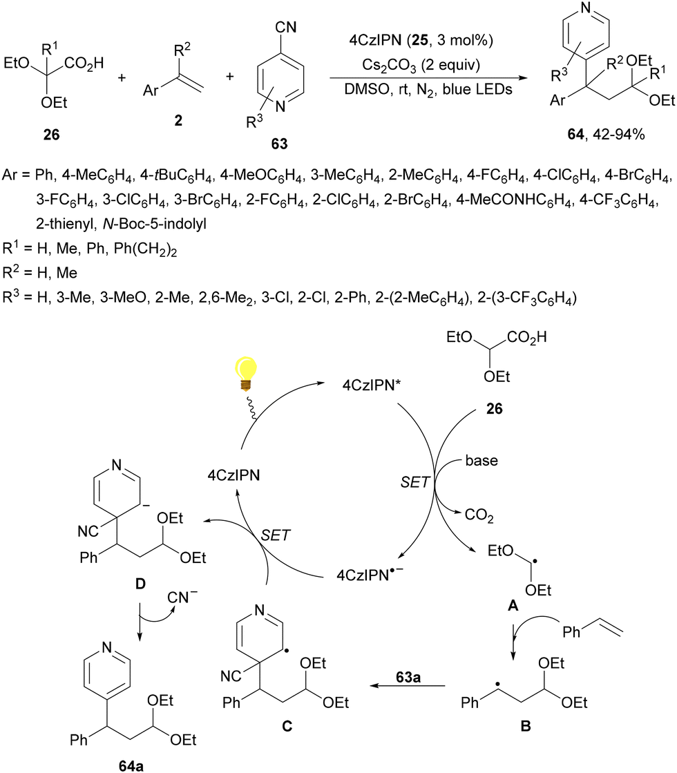 Zhang and co-workers89 have reported a three-component acetalation–pyridylation of alkenes using 4CzIPN (25) as an organophotocatalyst and Cs2CO3 as a base. Diethoxyacetic acids 26, cyanopyridines 63 and styrene derivatives 2 provided difunctional products 64 with very good yields and regioselectivities (Scheme 22). According to experimental results a plausible mechanism was proposed in which excited 4CzIPN* by irradiation of 25 with blue LED generates the formyl radical equivalent A and CO2. Hydroalkylation of styrene by intermediate A forms radical B, which reacts with 4-cyanopyridine 63 to generate radical C. Subsequent reduction of C by 4CzIPN−˙ forms anion D, which evolves to product 64a. Some products showed favorable in vitro antitumor activity.
