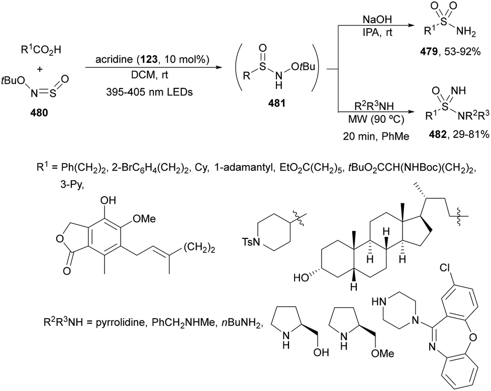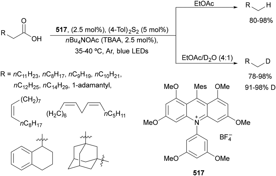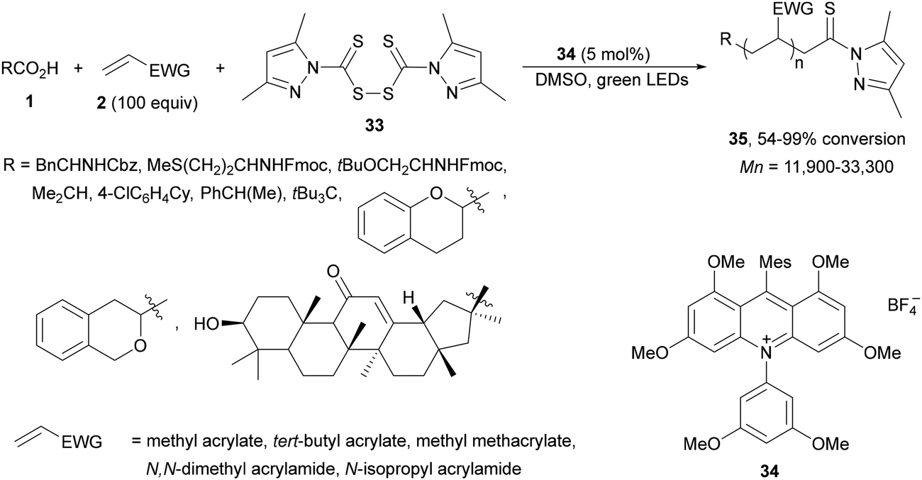Radical polymerization by a reversible addition-fragmentation chain-transfer (RAFT) from carboxylic acids and acrylic derivatives has been recently performed using acridinium salts as PCs by Hooper and co-workers.81 In the presence of a thiocarbonyl disulfide 33 used as the RAFT agent under green light and the acridinium salt 34 polymers 35 were isolated with low dispersity (1.12–1.58) and an Mn of 11