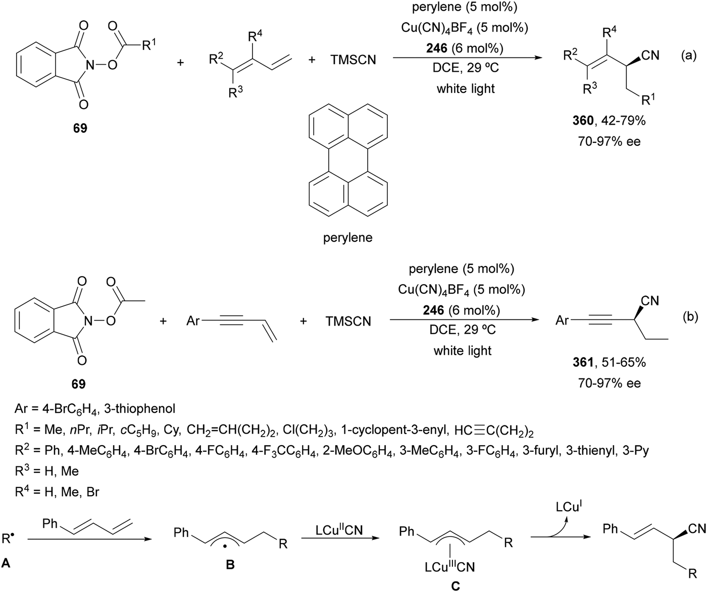 | Scheme 7 Plausible mechanisms (A, B) for decarboxylative Giese reactions using two organic photocatalysts. | ||