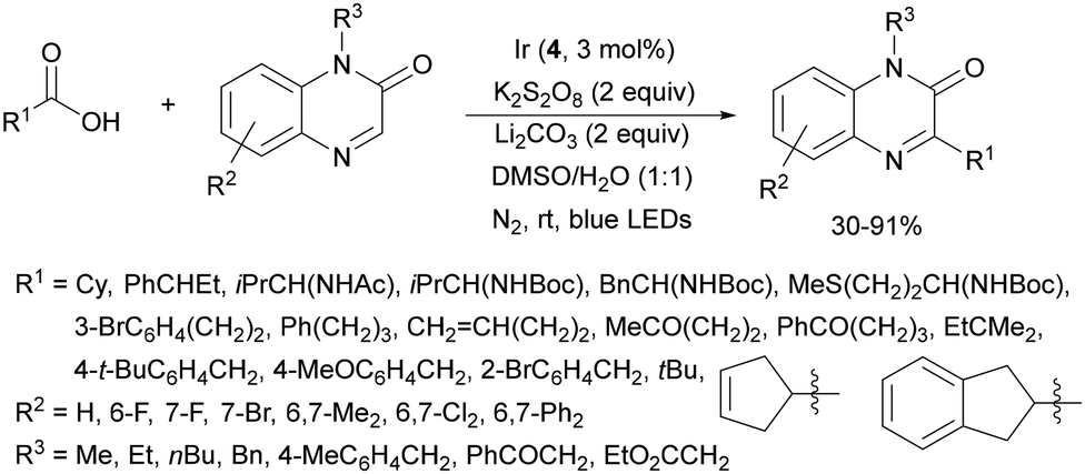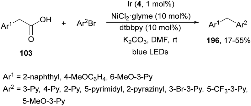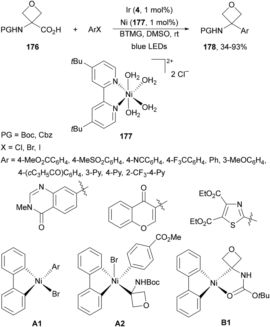 Four membered heterocyclic carboxylic acids 9 bearing an aryl group generate benzyl radicals using the Ir photocatalyst 4 (Scheme 4).57 Oxetane and azetidine carboxylic acids 9 reacted with electron-poor alkenes 2 in DMF at 36 °C to provide products 10 in moderate to good yields due to the formation of secondary products. Experimental and computational studies revealed that only oxetane and azetidine substrates favored the DGR pathway and minimized dimer formation.
