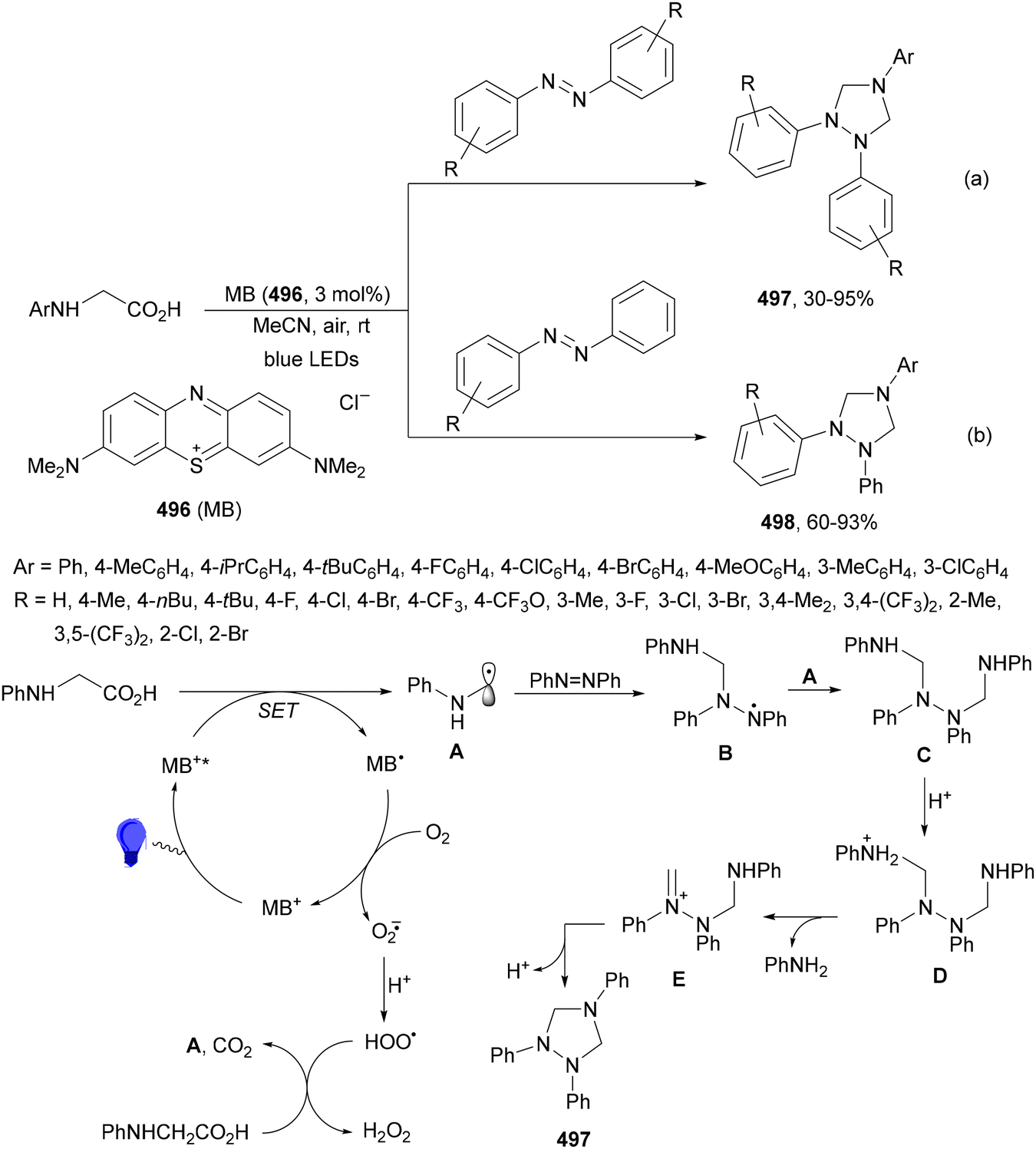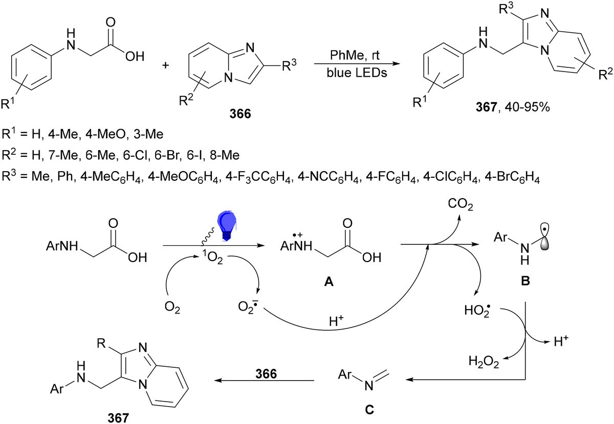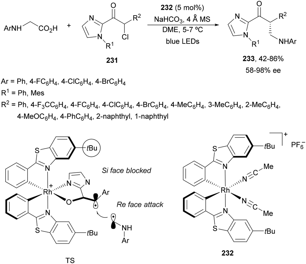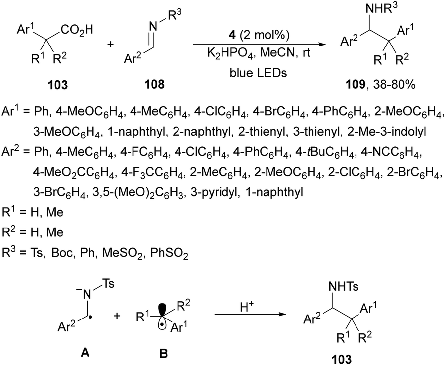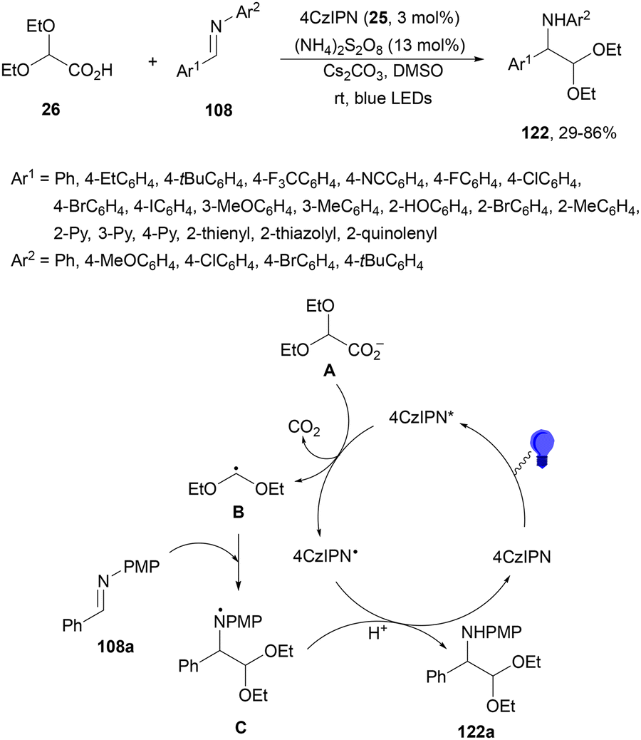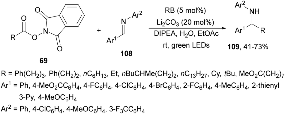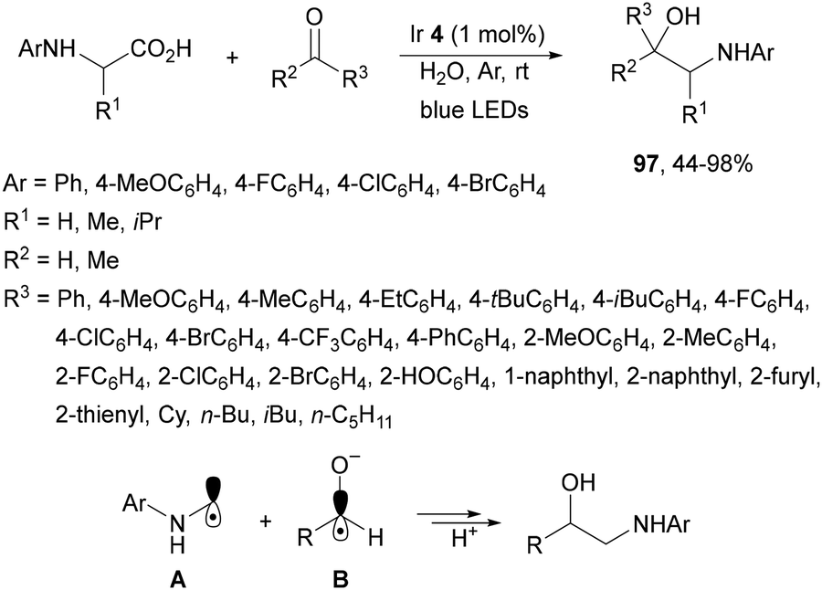 Decarboxylative addition of N-aryl amino acids to aldehydes or ketones has been described under visible-light in water at room temperature using Ir complex 4 as a photocatalyst (Scheme 34).105 The corresponding 1,2-amino alcohols 97 were obtained in very good yields and the reaction of N-phenyl glycine and 4-MeOC6H4CHO was carried out on a gram scale. According to experimental studies the α-amino radical A reacts with the alcoholate radical B to provide the product.