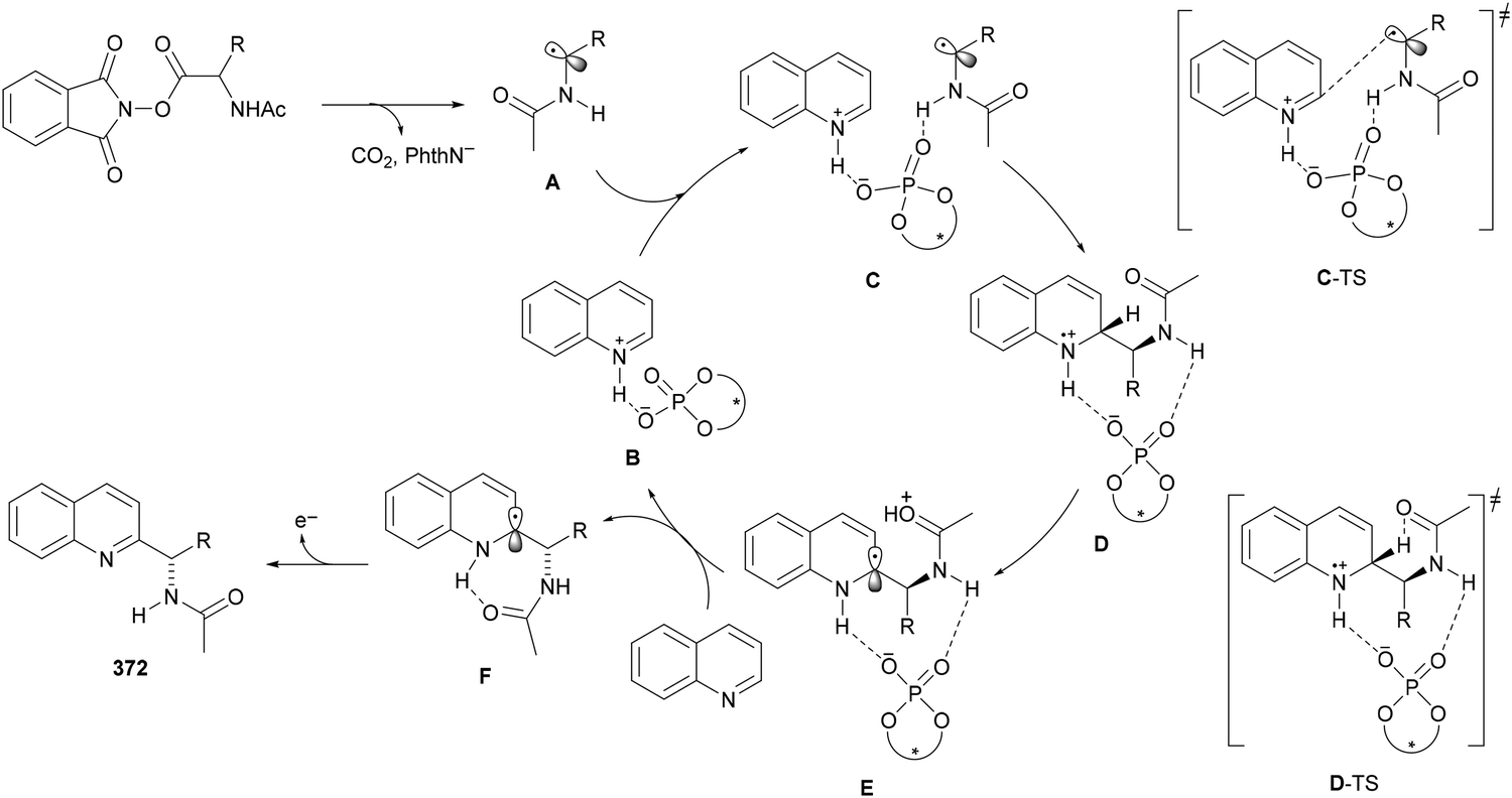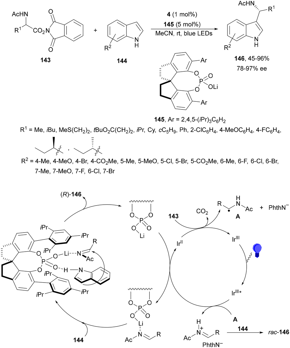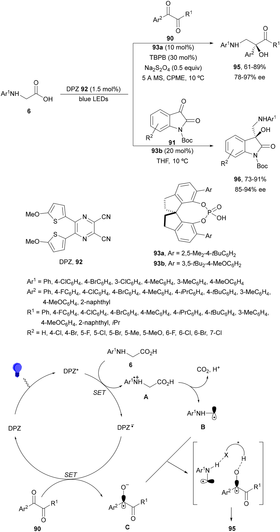 | Scheme 33 Enantioselective decarboxylative addition of N-arylglycines to 1,2-dicarbonyl compounds 90 or to isatins 91 under dual DPZ 92 and CPA 93 photocatalysis. | ||