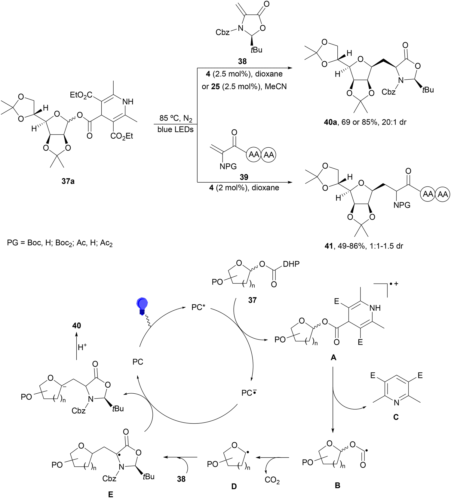 1,4-Dihydropyridine (DHP)-derived glycosyl esters 37 have been employed as redox-active ester (RAE) precursors of glycosyl radicals via anomeric C(sp3)–O bond homolysis and subsequent decarboxylation in DGRs.83 For instance, ester 37a reacted with oxazolidinone-derived dehydroalanine 38 and dehydroalanine peptides 39 using Ir complex 4 or 4CzIPN (25) as a photocatalyst under blue LED irradiation in MeCN or 1,4-dioxane at 85 °C to provide products 40 and 41, respectively (Scheme 16). A wide range of glycosyl DHP esters derived from monosaccharides and oligosaccharides were used to give products 40 in moderate to good yields (up to 87%) and good to excellent stereoselectivities (up to >20