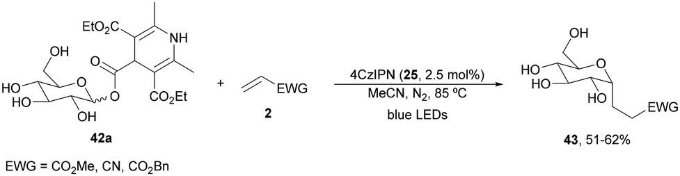 Recently, Fairbanks and co-workers84 described the DGR of unprotected glycosyl DHP esters 42 using 4CzIPN (25) as a PC in dry MeCN under blue LED irradiation at 85 °C (Scheme 17). Using acrylates as Michael acceptors and glucose DHP ester 42a products 43 were obtained in 51 to 62% yields. The reaction could be applied to mannose and galactose DHP esters, as well as to maltose and lactose DHP esters.