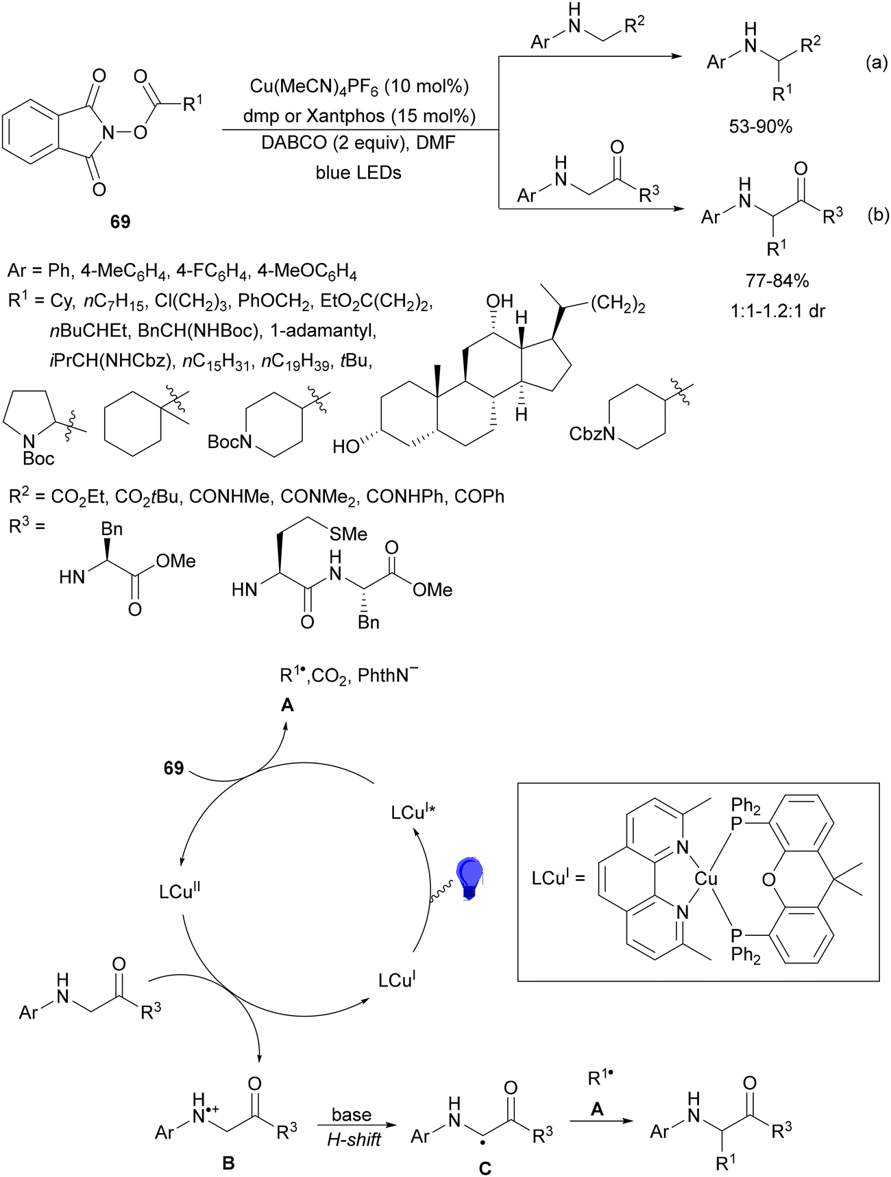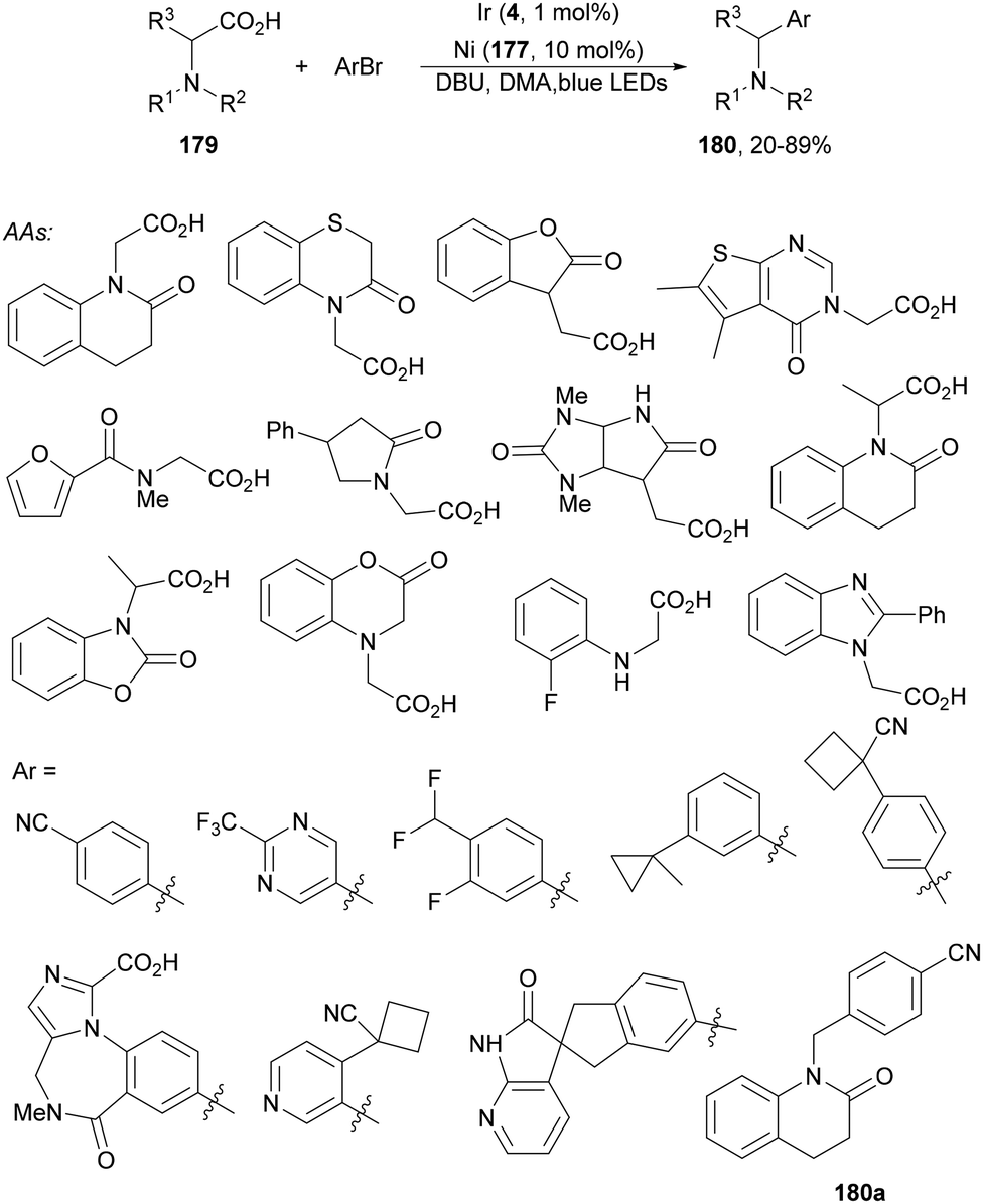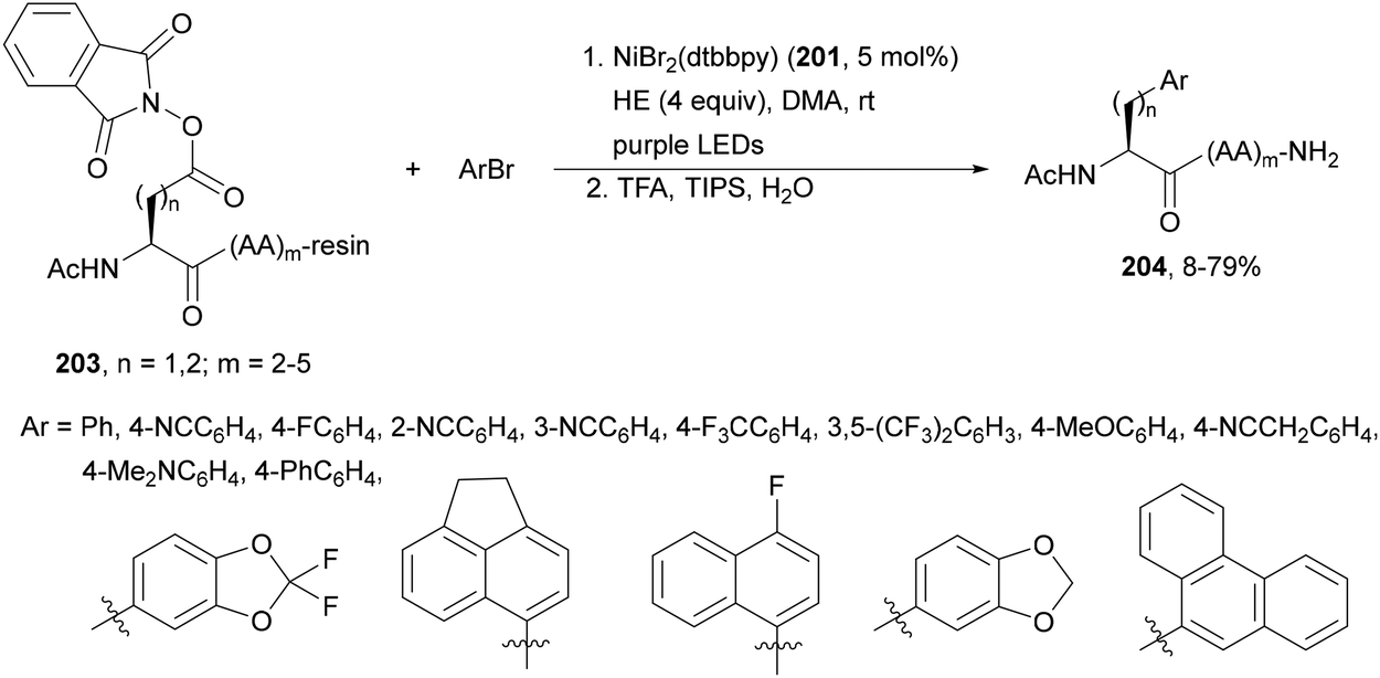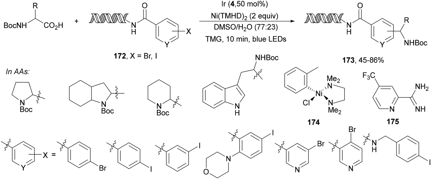 | Scheme 35 Decarboxylative coupling of α-amino acids with DNA-conjugated aldehydes under Ir 4 photocatalysis. | ||
