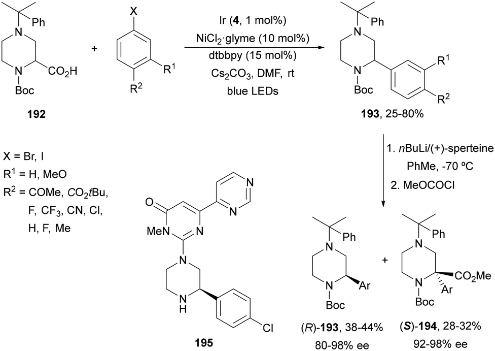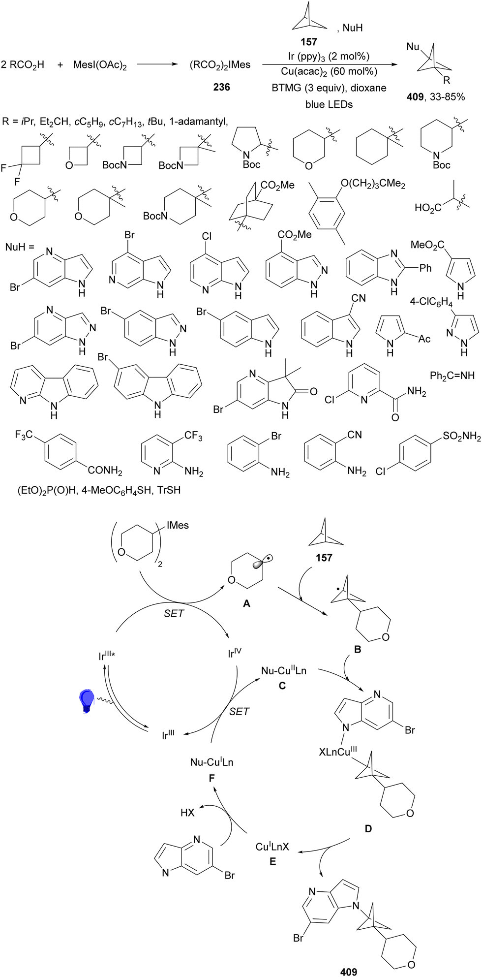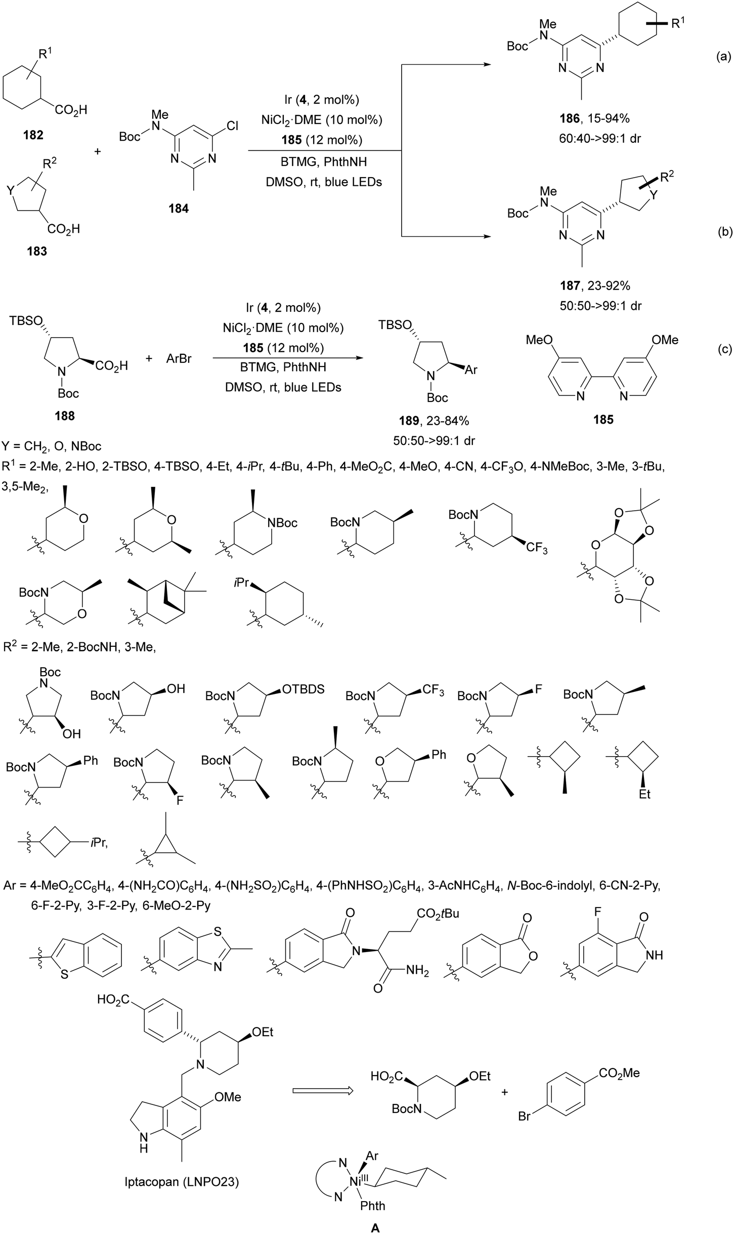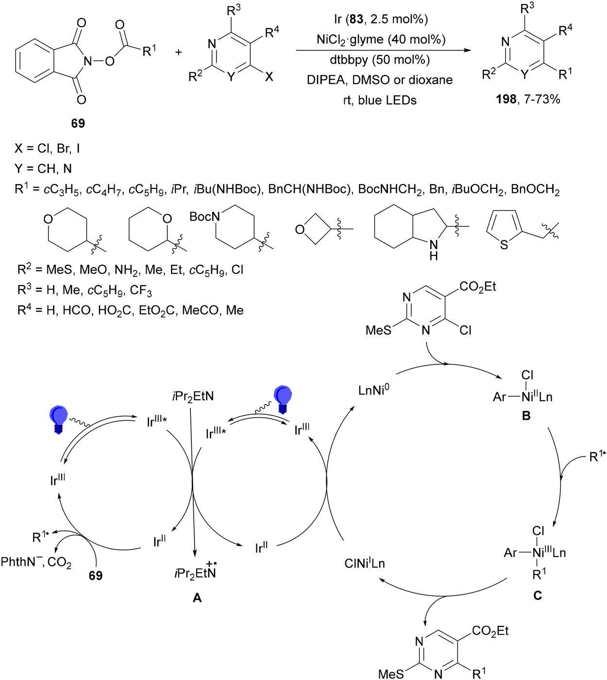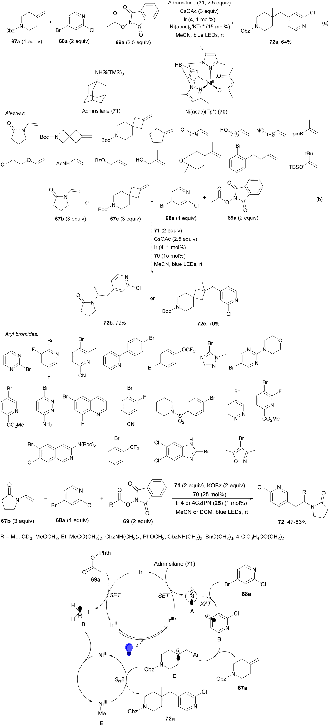Aryl-alkylation of unactivated alkenes has been recently described by MacMillan and co-workers.91 This process took place by reaction of alkenes 67 with aryl bromides 68 and NHPI esters 69 under Ir complex 4 or 25 and Ni complex 70 photocatalysis in the presence of adamantylaminosupersilane (Admnsilane 71) and CsOAc as a base under blue LED irradiation (Scheme 24). By a triplet radical sorting mechanism of an aryl radical and a primary radical from the RAE 69 the corresponding products 72 resulted in good yields. Different unactivated alkenes 67 reacted with 4-bromo-2-chloro-pyridine 68a and NHPI 69a to provide products 72 in 59–79% yields (Scheme 24a). Different aryl bromides 68 were allowed to react with alkenes 67b and 67c and NHPI ester 69a giving products 72 in 41–72% yields (Scheme 24b). The scope of NHPI esters 69 was studied with N-vinylpyrrolidone 67b and 4-bromo-2-chloropyridine 68a to obtain products 72 in 47–83 yields using 4CzIPN (25) or Ir complex 4 as a photocatalyst (Scheme 24c). A proposed mechanism for the alkene aryl-alkylation is shown in Scheme 24: blue light excites the Ir photocatalyst 4 to the long-lived triplet excited state Ir(III)*, which is reductively quenched by Admnsilane (71). After aza-Brook rearrangement the silane radical A is formed, which undergoes a halogen atom transfer (XAT) with aryl bromide 68a to give an aryl radical B. Addition of B to alkene 67a results in the hindered alkyl radical C. To close the photoredox catalytic cycle Ir(II) reduces an NHPI ester 69a to provide the primary alkyl radical D after decarboxylation. This species is captured by the SH2 radical-sorting Ni catalyst 70 to afford complex E, which reacts with radical C providing product 72a.