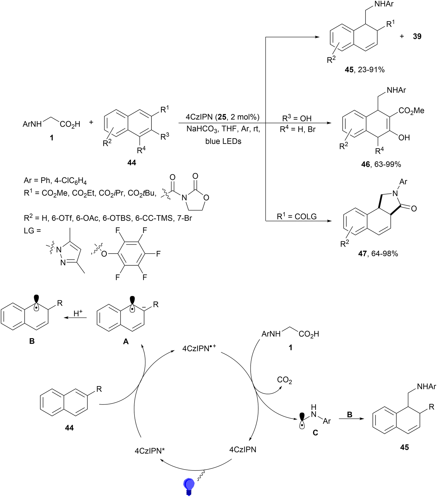 | Scheme 18 1,2-Hydroalkylation of naphthalene derivatives 44 with N-arylglycines under 4CzIPN (25) photocatalysis. | ||